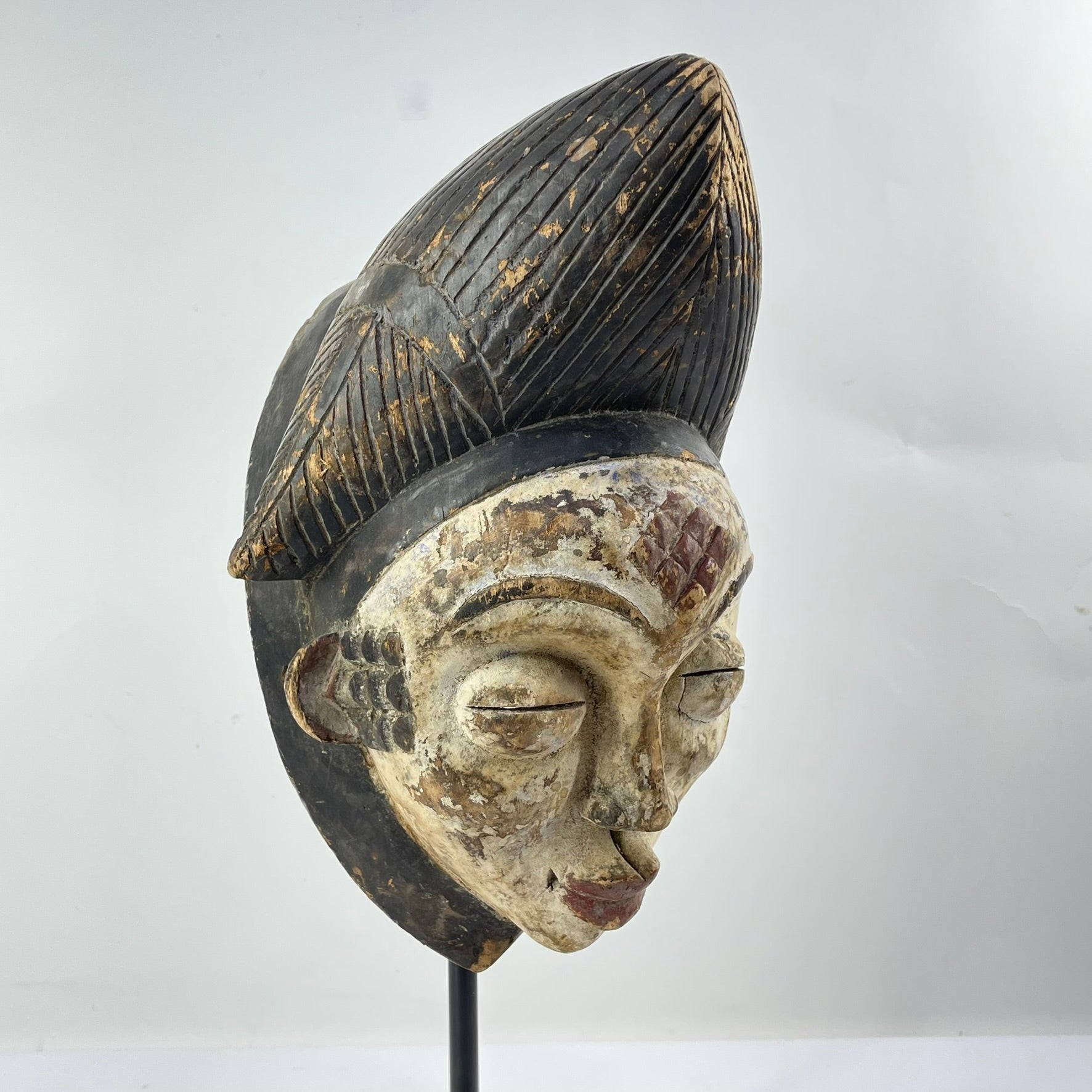 The Mmwo Spirit Maiden Mask originates from the Punu people of Gabon and is used in a variety of cultural contexts, including initiation rites, funerary ceremonies, ancestor veneration, and dances associated with the full moon. This particular mask portrays a beautiful maiden, her face painted in white with a serene and tranquil expression. The refinement of the mask’s features, along with the intricate and polychrome hairstyle, emphasizes the mask’s symbolic connection to idealized beauty within Punu society. The mask is typically worn as part of a colorful costume, representing the spiritual presence of a female guardian spirit, known as duma or mvudi. These masks are associated with the initiation of young girls, where they play a central role in the ceremonies marking their transition to womanhood.