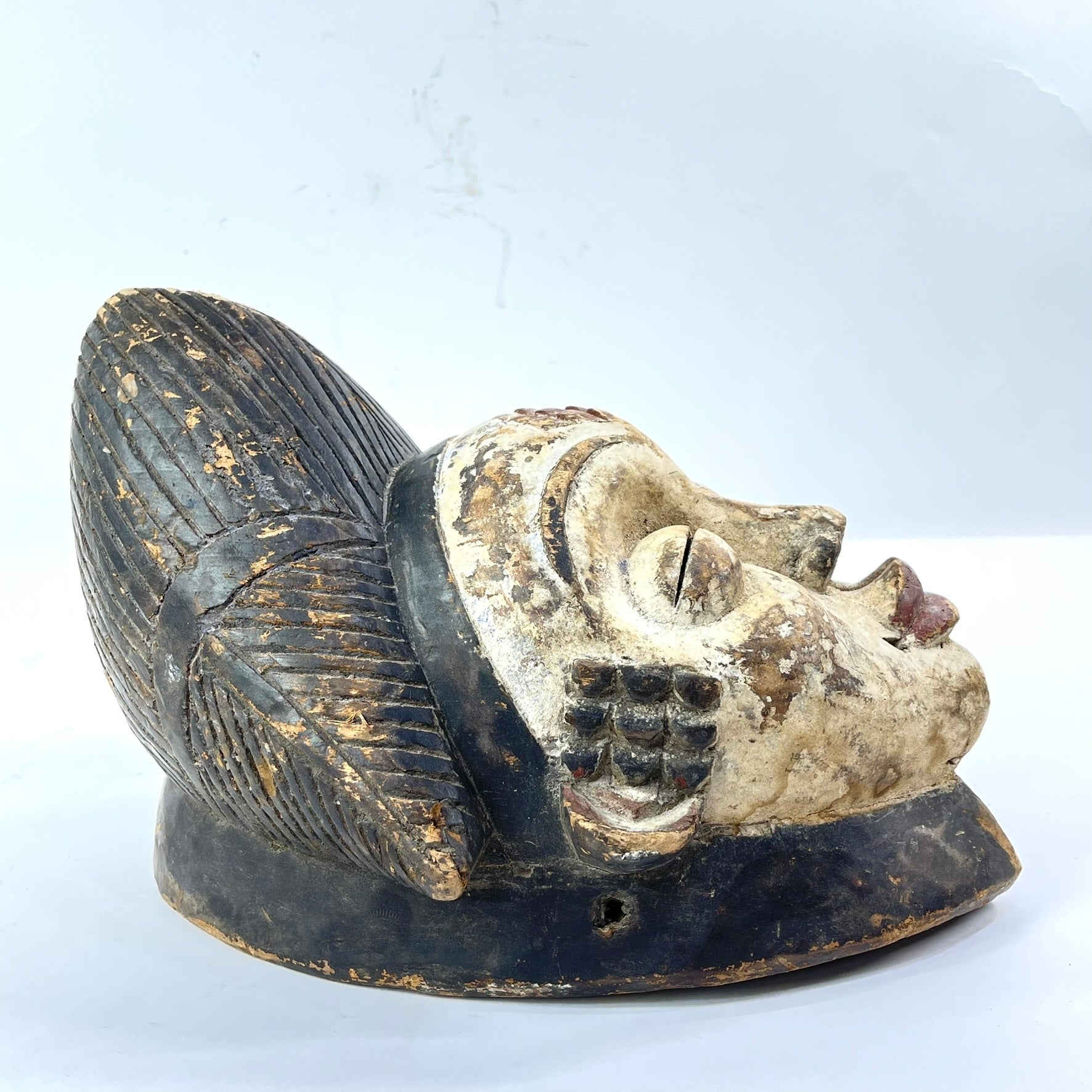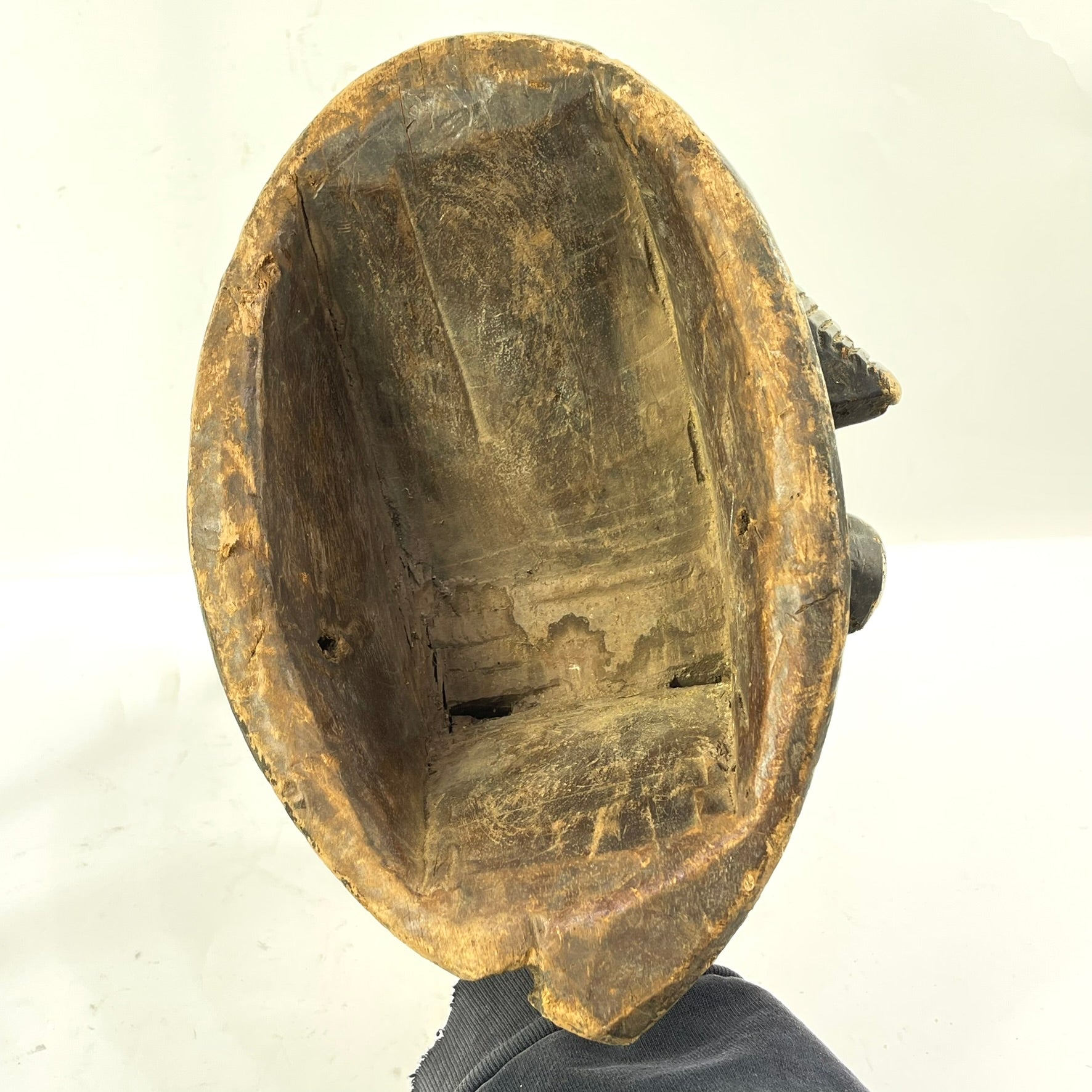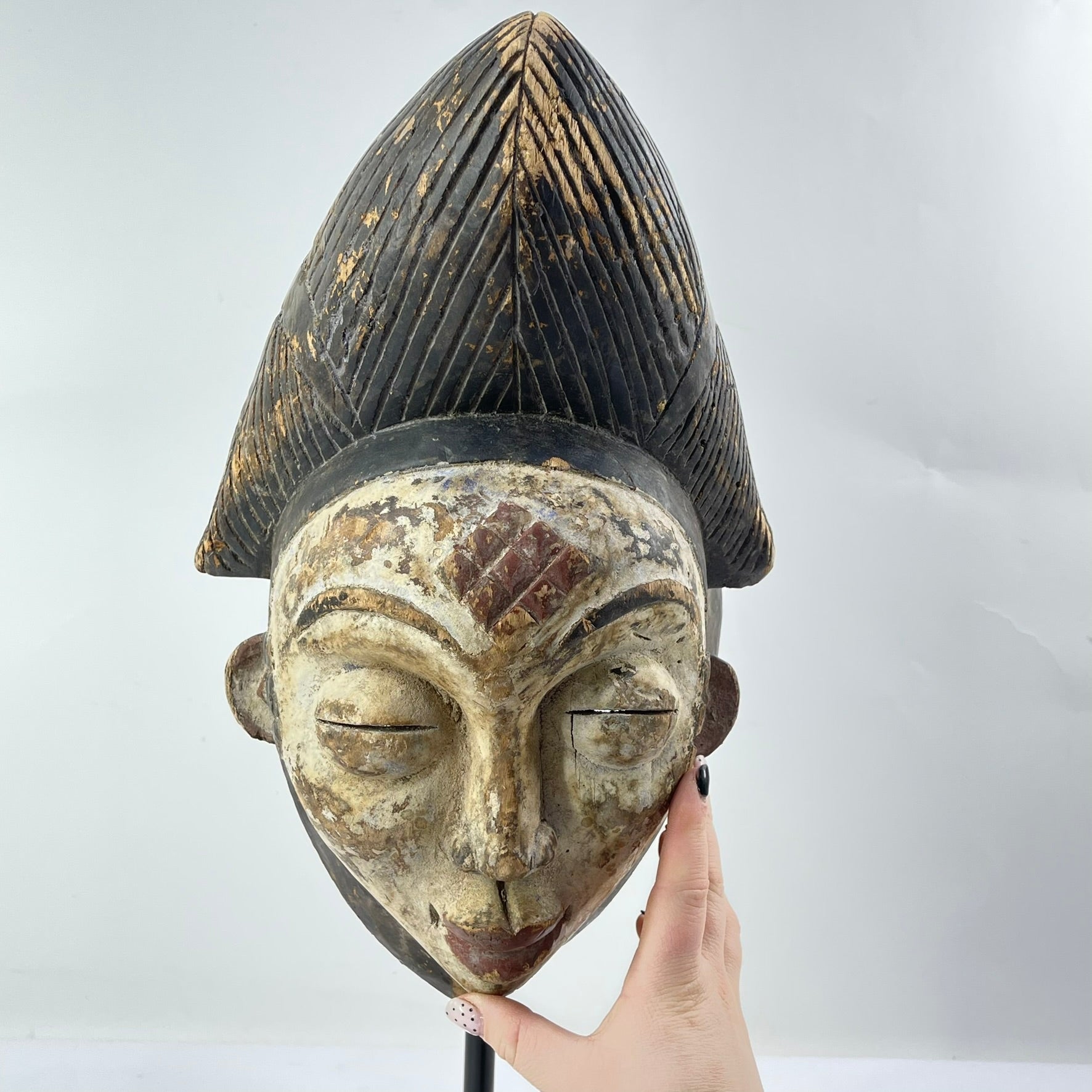 The white kaolin pigment used on these masks plays a crucial role in their symbolic power, alluding to the anti-witchcraft abilities of the Moukouji society. The white color signifies purity, spiritual power, and protection against malevolent forces, especially harmful forest spirits. In Punu tradition, only female masks are crafted, reflecting the community’s reverence for women and their role as mediators between the physical and spiritual realms. The somewhat Asian-like features of the mask, though intriguing, are not connected to any known historical or cultural link, but rather reflect the Punu’s unique artistic interpretation of idealized femininity. The wearing of these masks by Moukouji initiates—often elevated on stilts—symbolizes the representation of ancestral faces, establishing a connection between the living, the deceased, and the protective spirits that guide and safeguard the community.