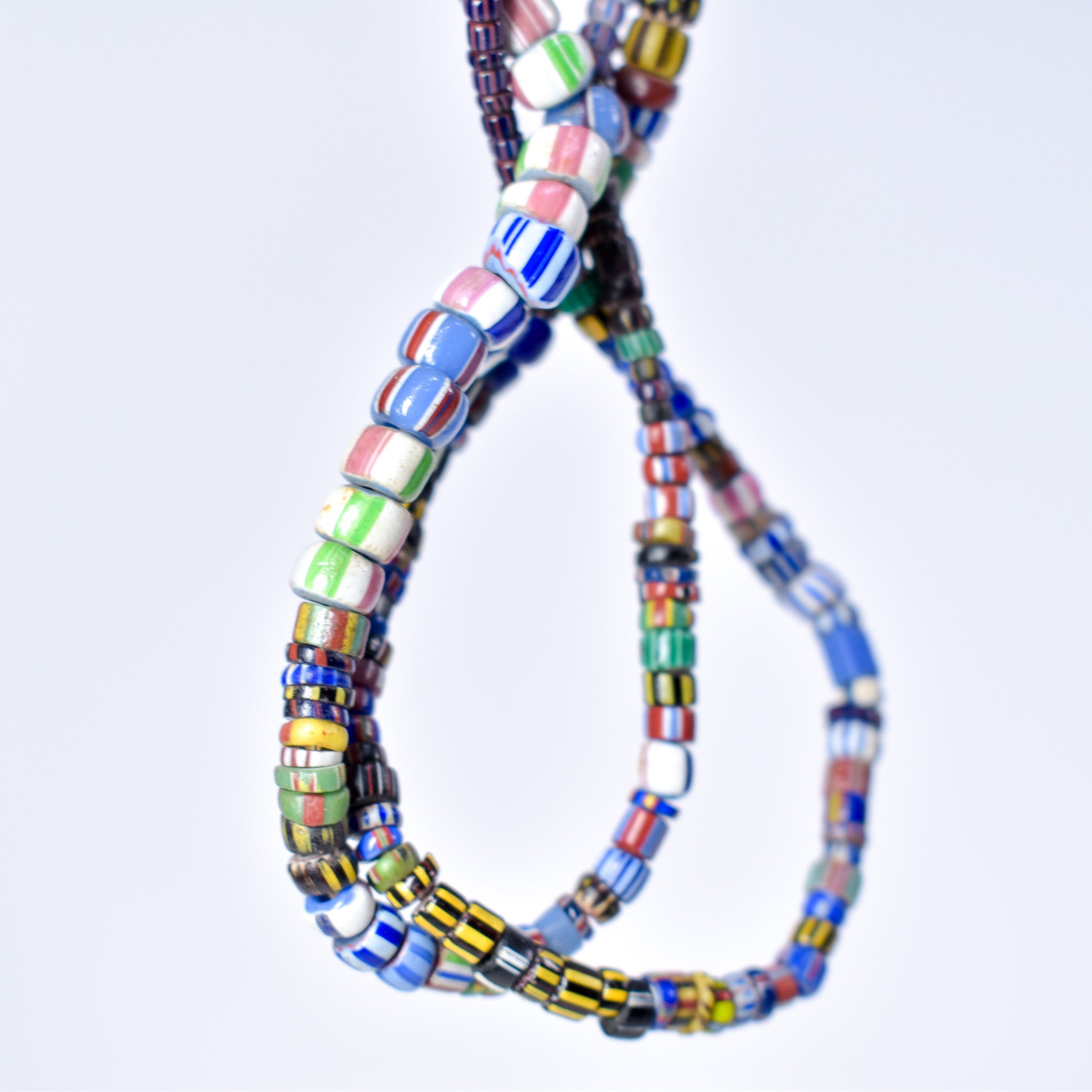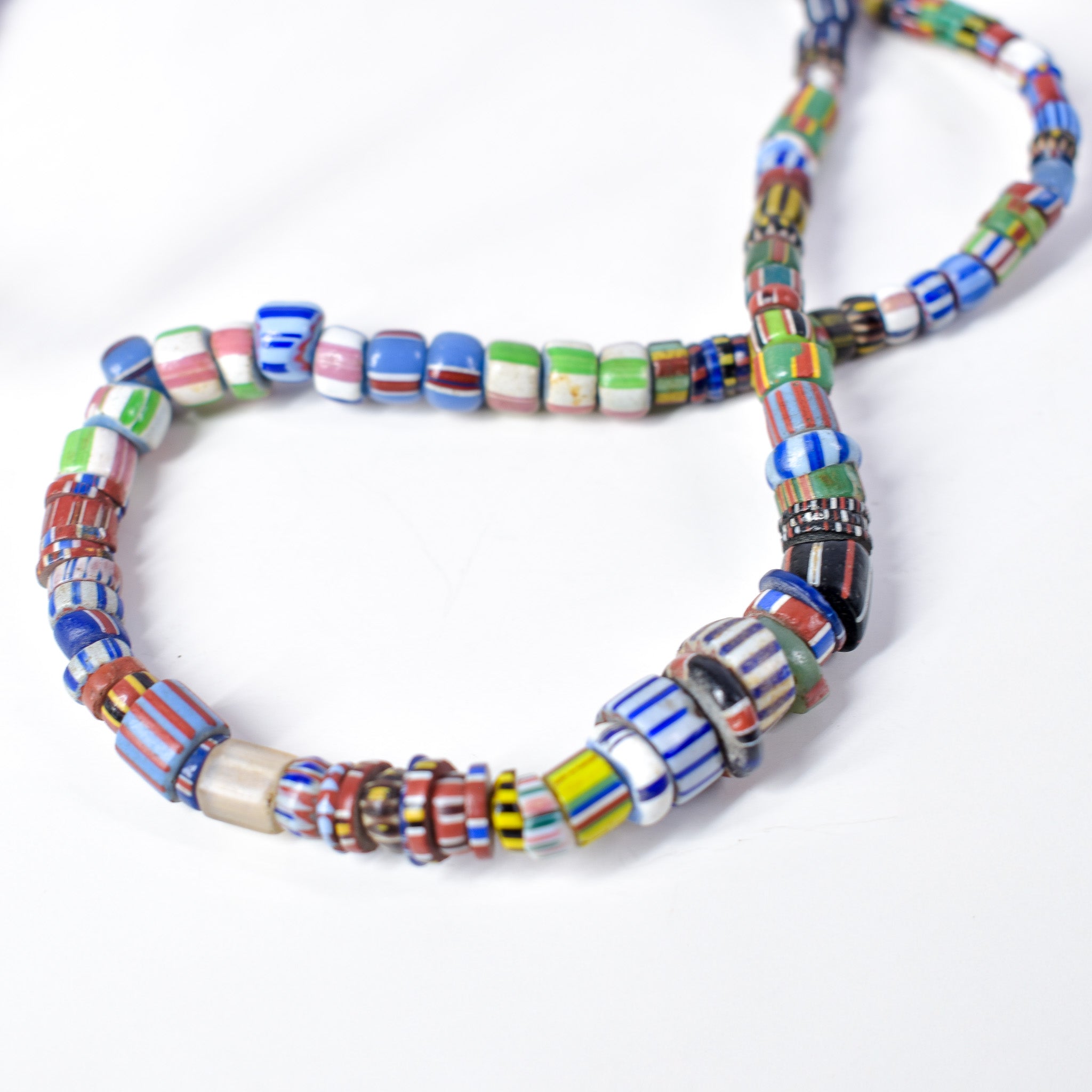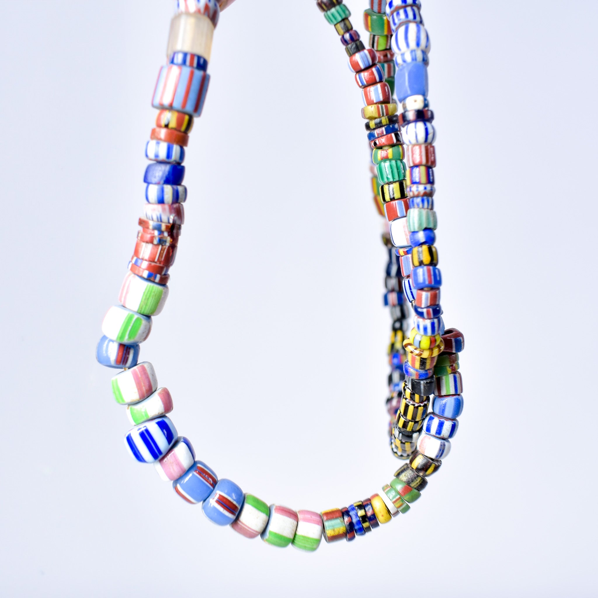 A 25-inch strand of mixed Venetian trade beads is a fascinating collection of diverse colors, shapes, and patterns, each bead telling a unique story of craftsmanship and trade. Crafted in Venice, Italy, these beads showcase the mastery of Venetian glass artisans, who skillfully combined vibrant hues and intricate designs to create stunning works of art. From bold stripes to delicate millefiori patterns, each bead reflects the cultural exchanges and global trade networks that shaped the world's history. These beads were not only prized for their beauty but also served as valuable commodities, exchanged across continents and cultures. A strand of mixed Venetian trade beads is not just a piece of jewelry; it's a tangible link to the rich tapestry of human interaction and creativity that spans centuries.