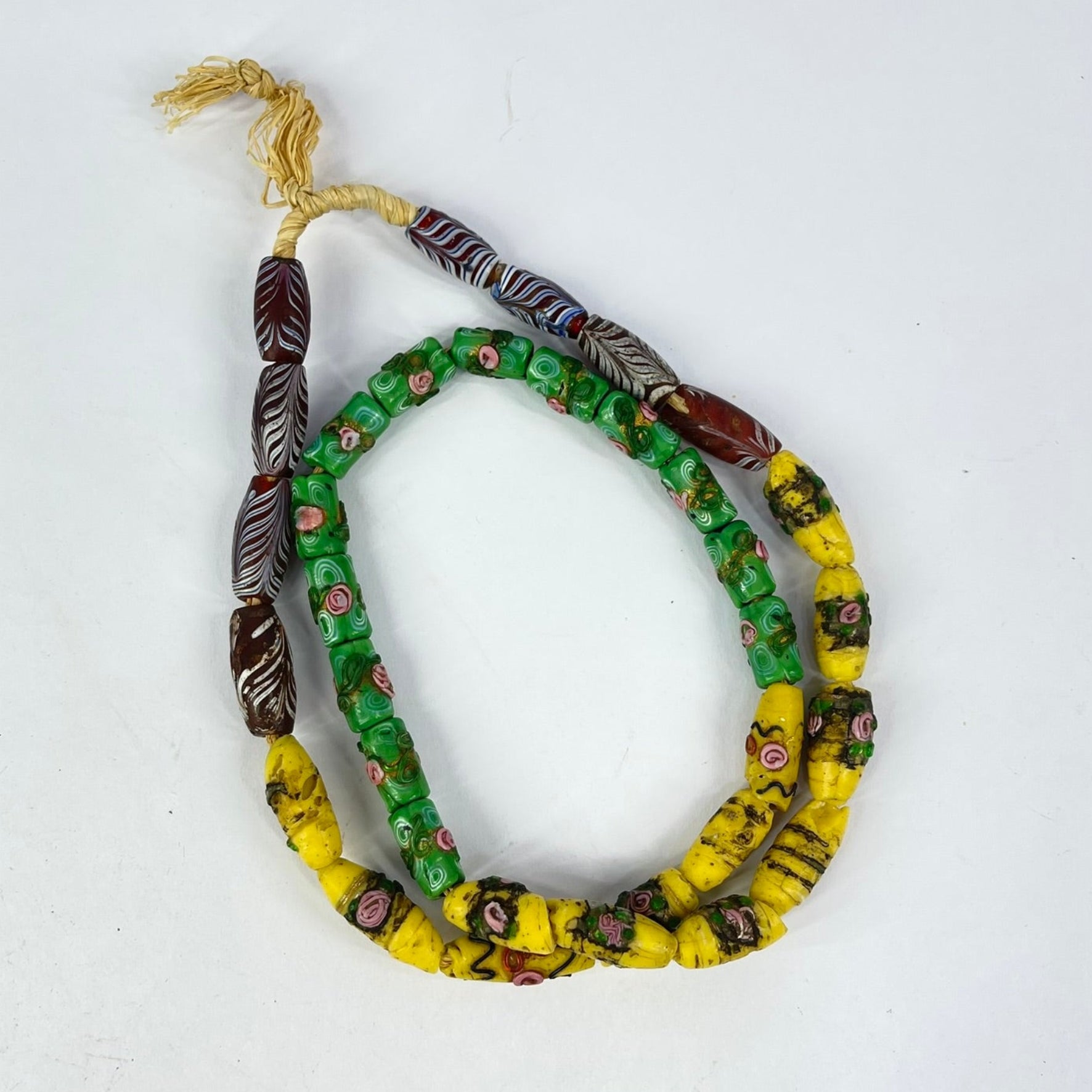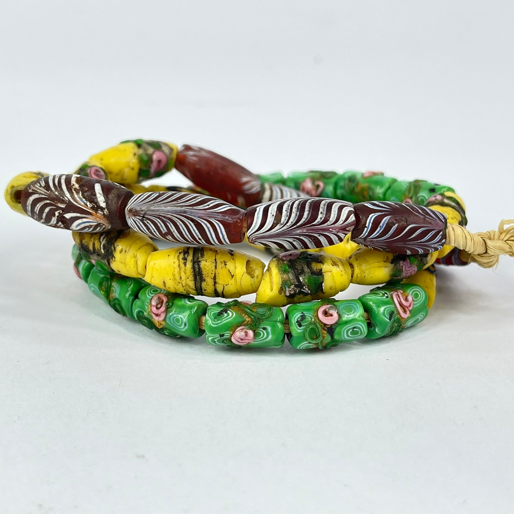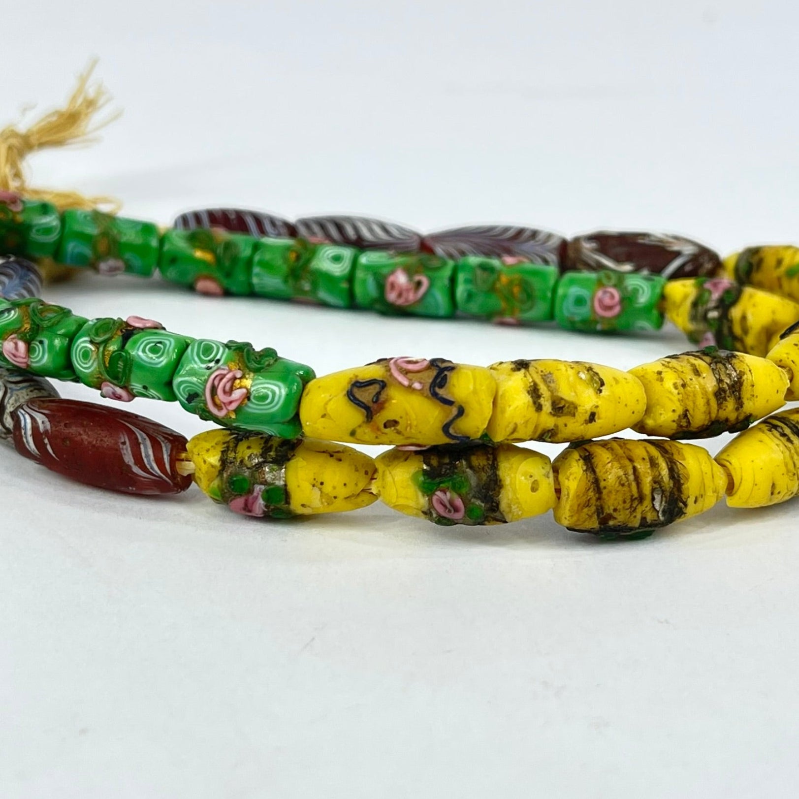 Beautiful yellow, green and red Venetian trade beads, which include feather beads and florals. A rare strand indeed.