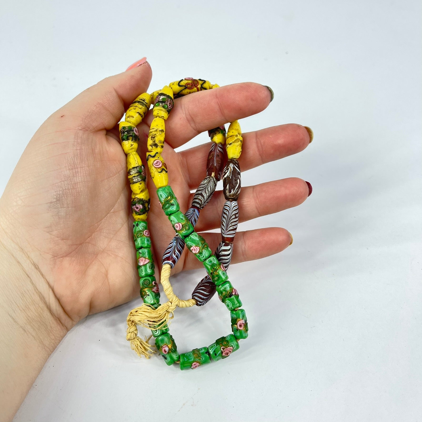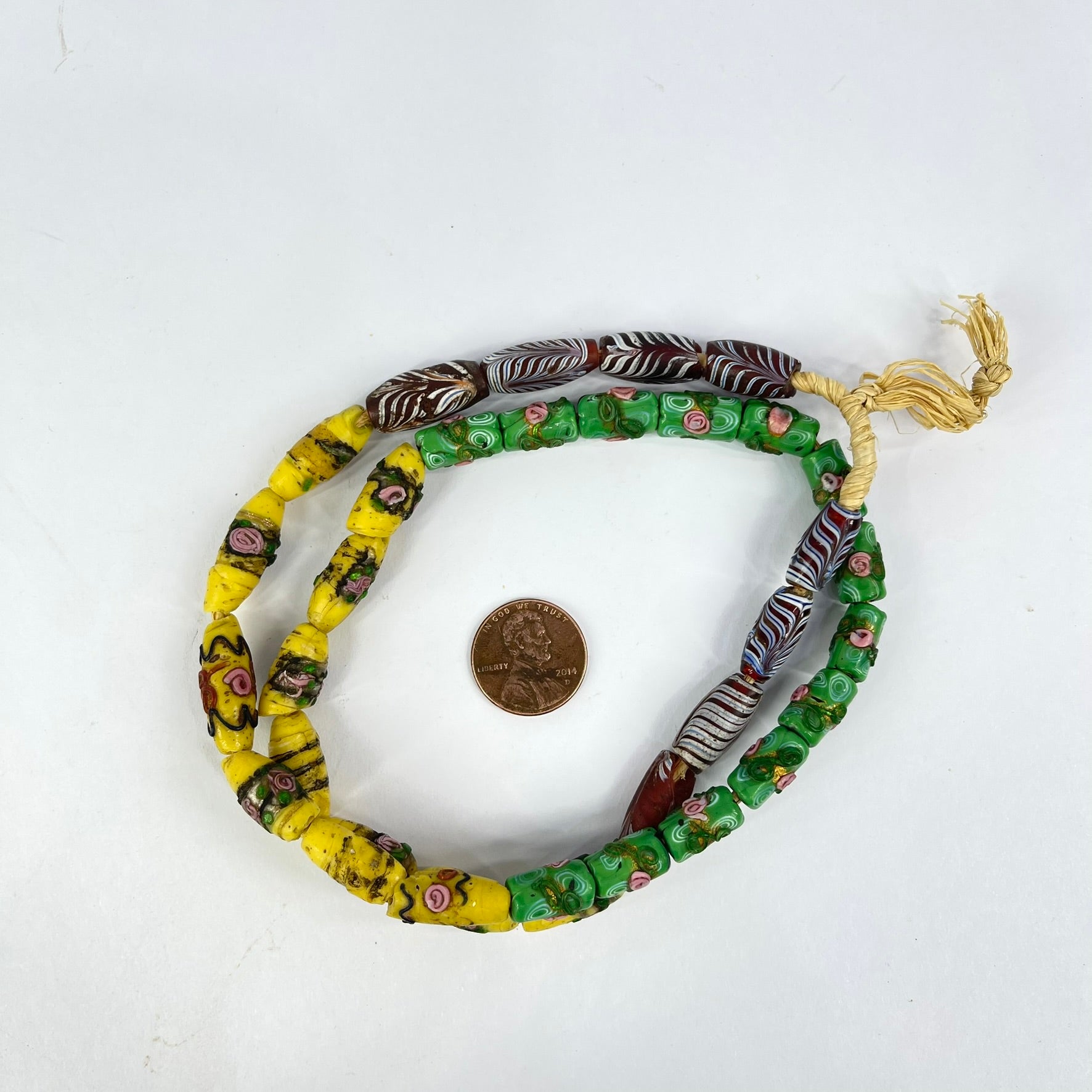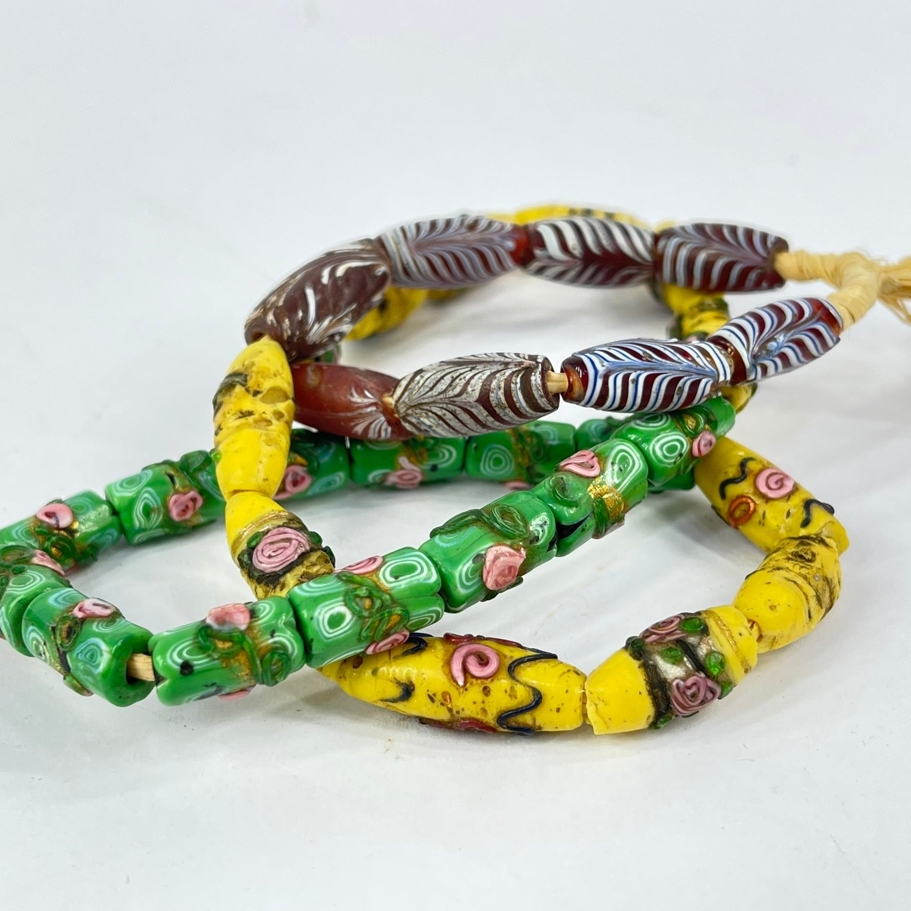Beautiful yellow, green and red Venetian trade beads, which include feather beads and florals. A rare strand indeed.