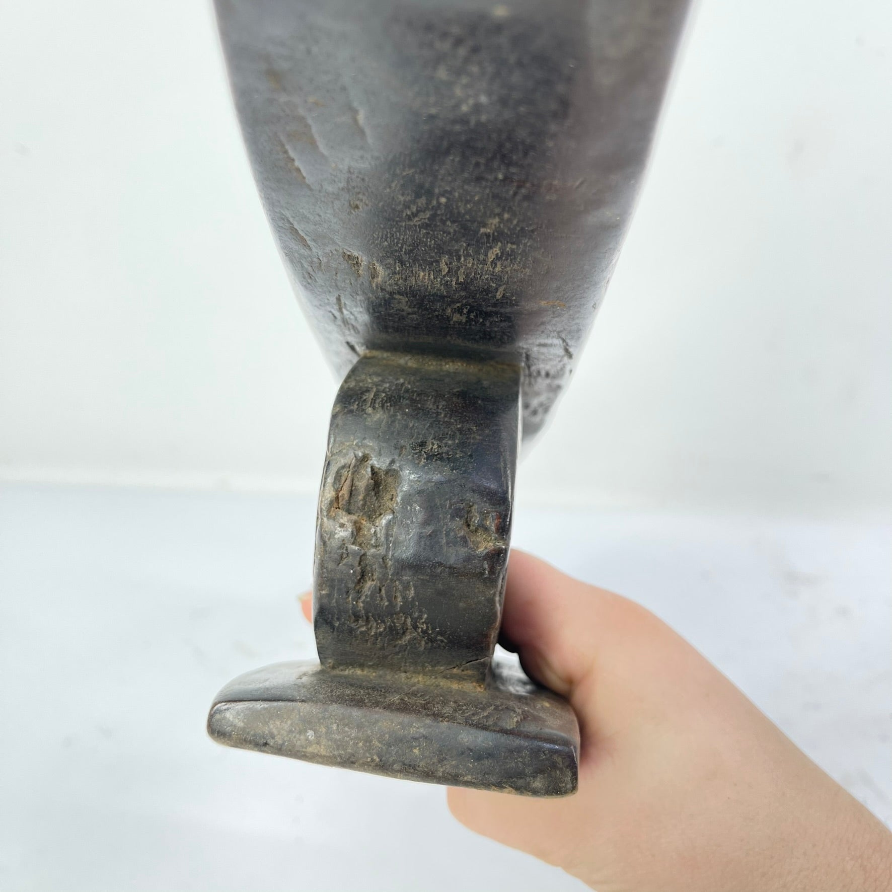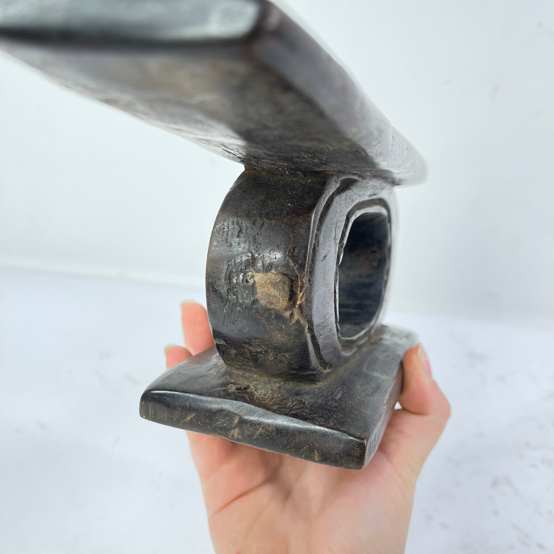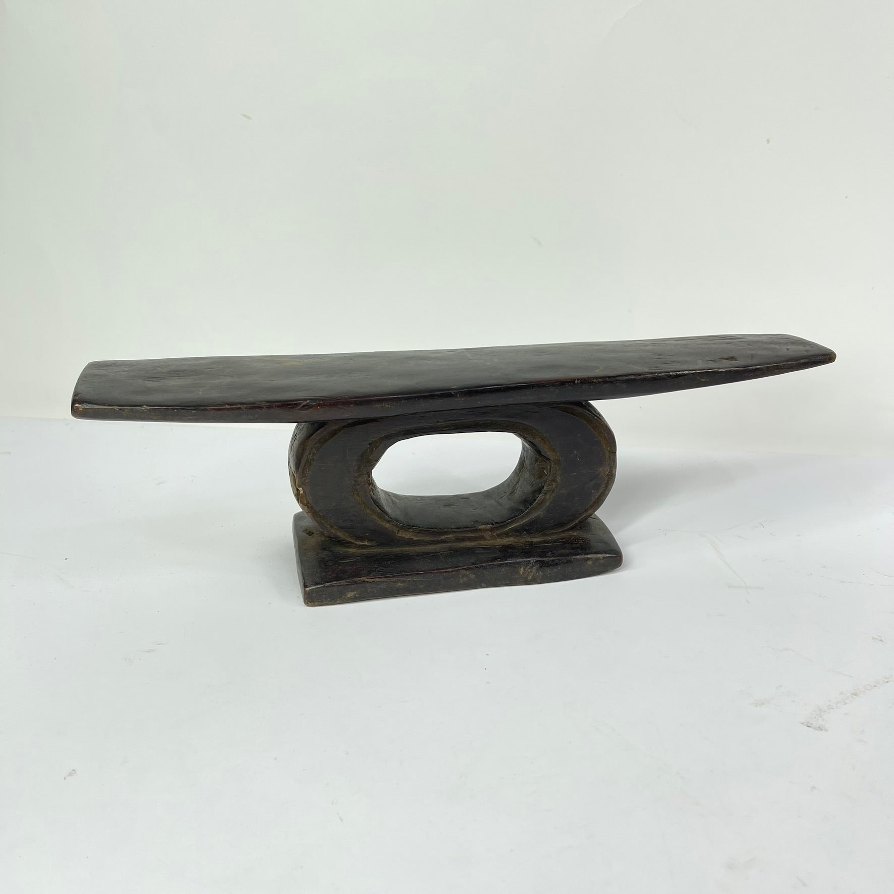 The Shona wood headrest was hand-carved by the Shona people of Zimbabwe. Headrests such as this were designed to support the head while sleeping to protect elaborate hairstyles. These hairstyles are revered as an intimate connection with their wearers as they are vehicles for communicating with their ancestors. In many instances, wooden headrests are buried with their owners along with other personal items. Shona sculptors and their neighbors, the Tsonga, have been credited with the most varied formal solutions to hand-carving wood headrests.