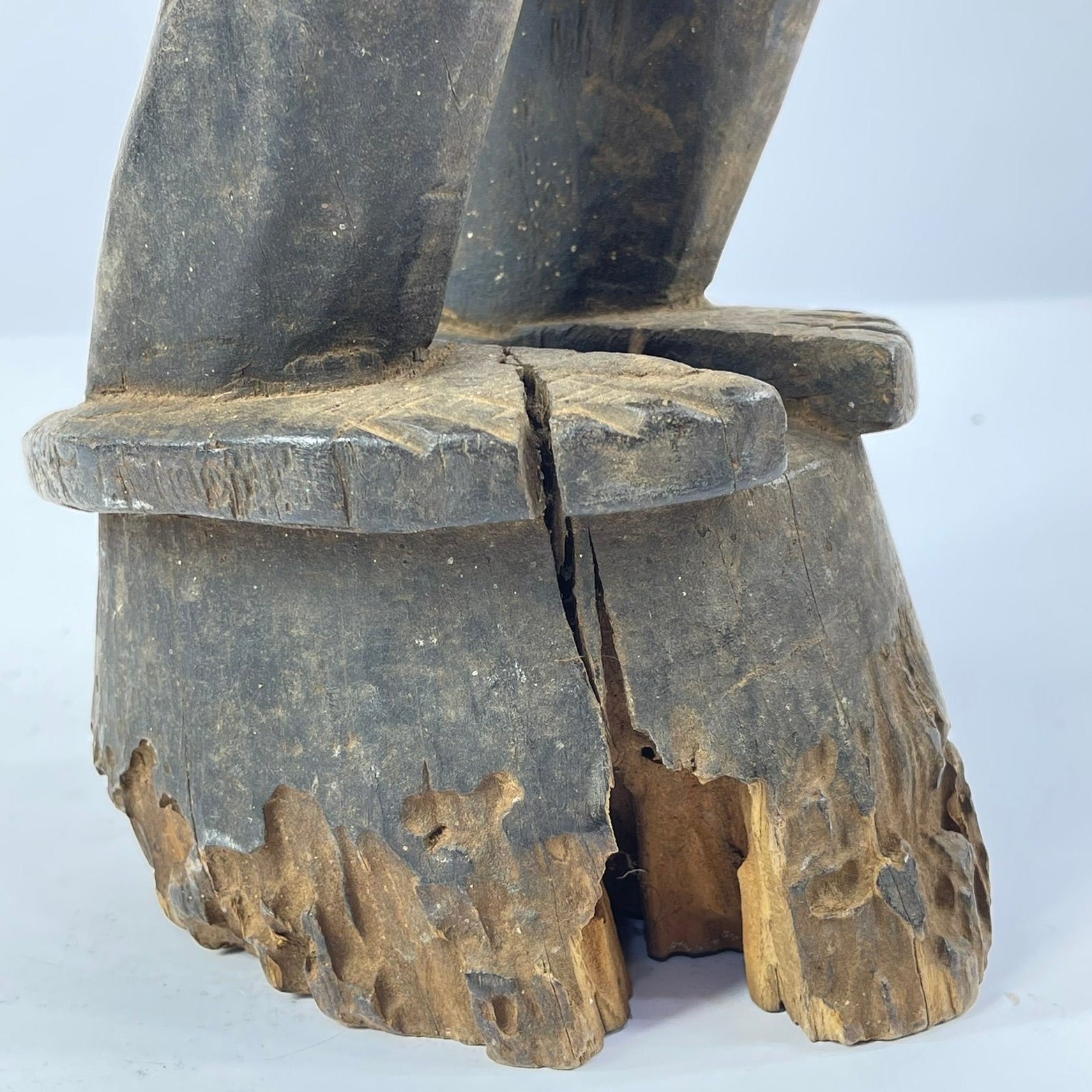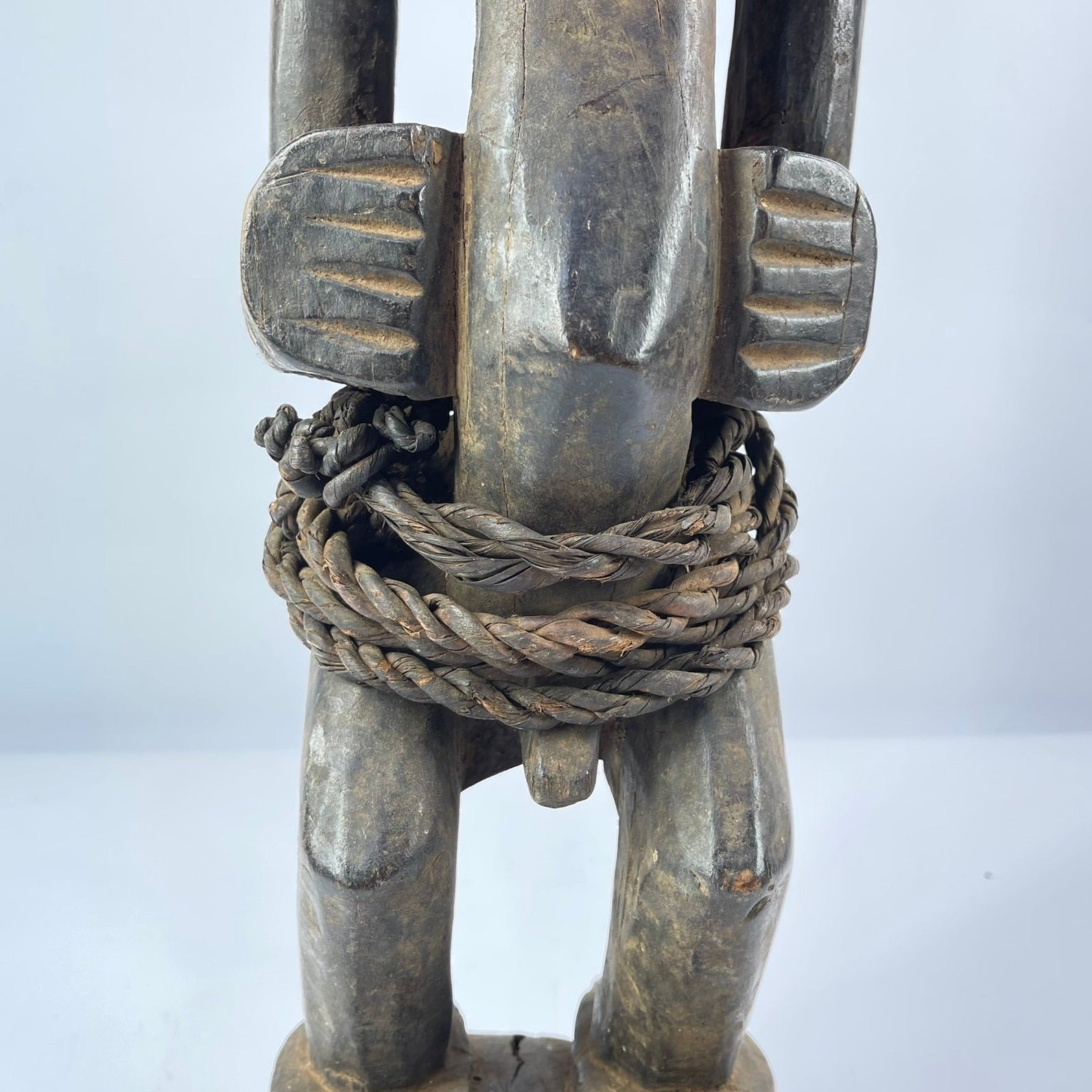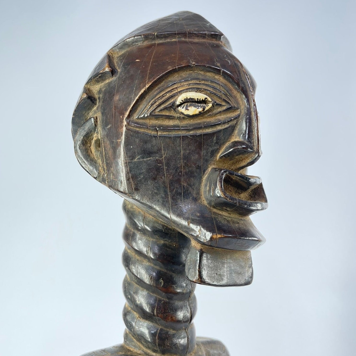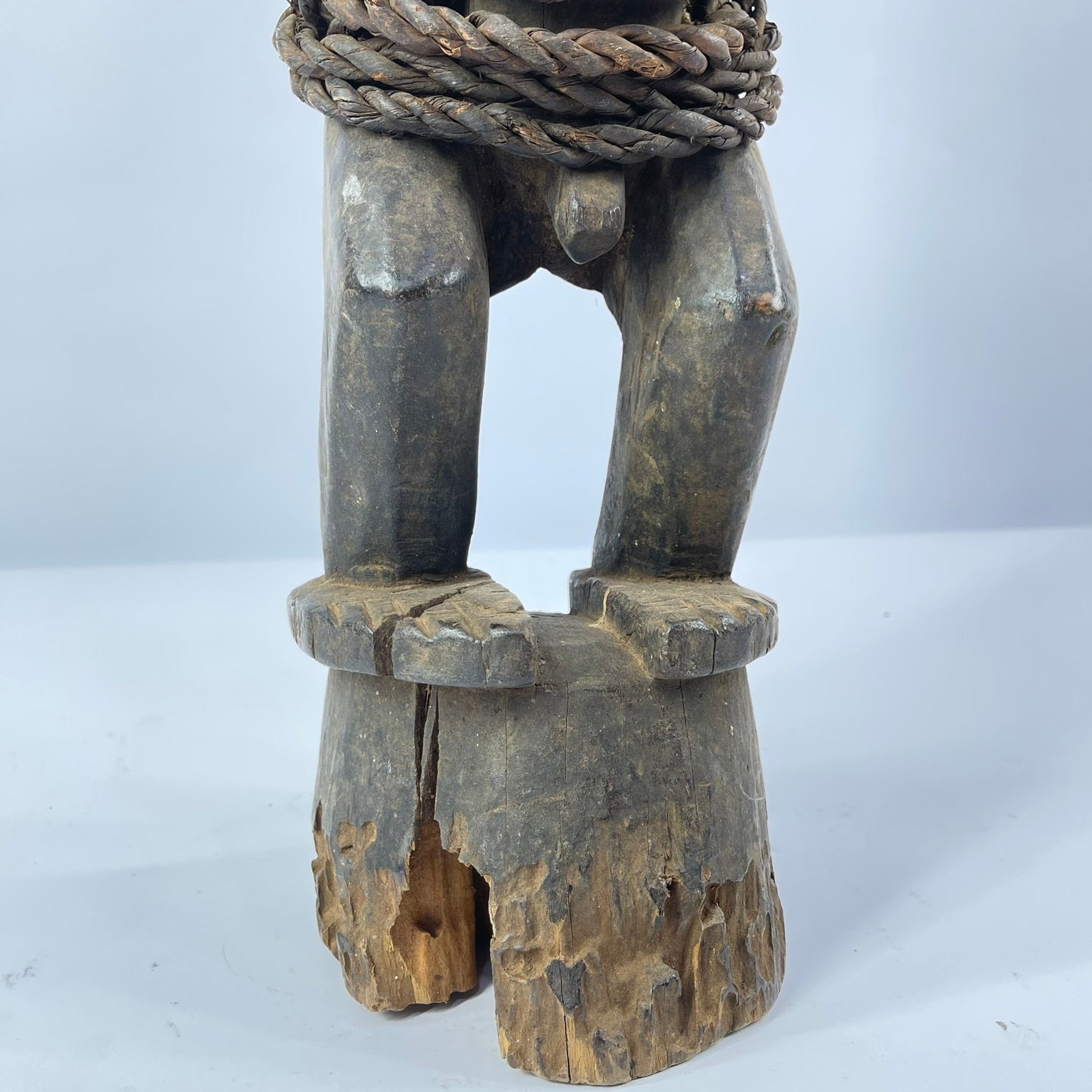 The surface of the figure shows a rich, aged patina, bearing evidence of handling, ritual engagement, and time, all of which contribute to its authenticity and spiritual presence. This sculpture stands as a compelling example of Songye ritual art—both visually striking and deeply rooted in the lived spiritual practices of Central Africa.