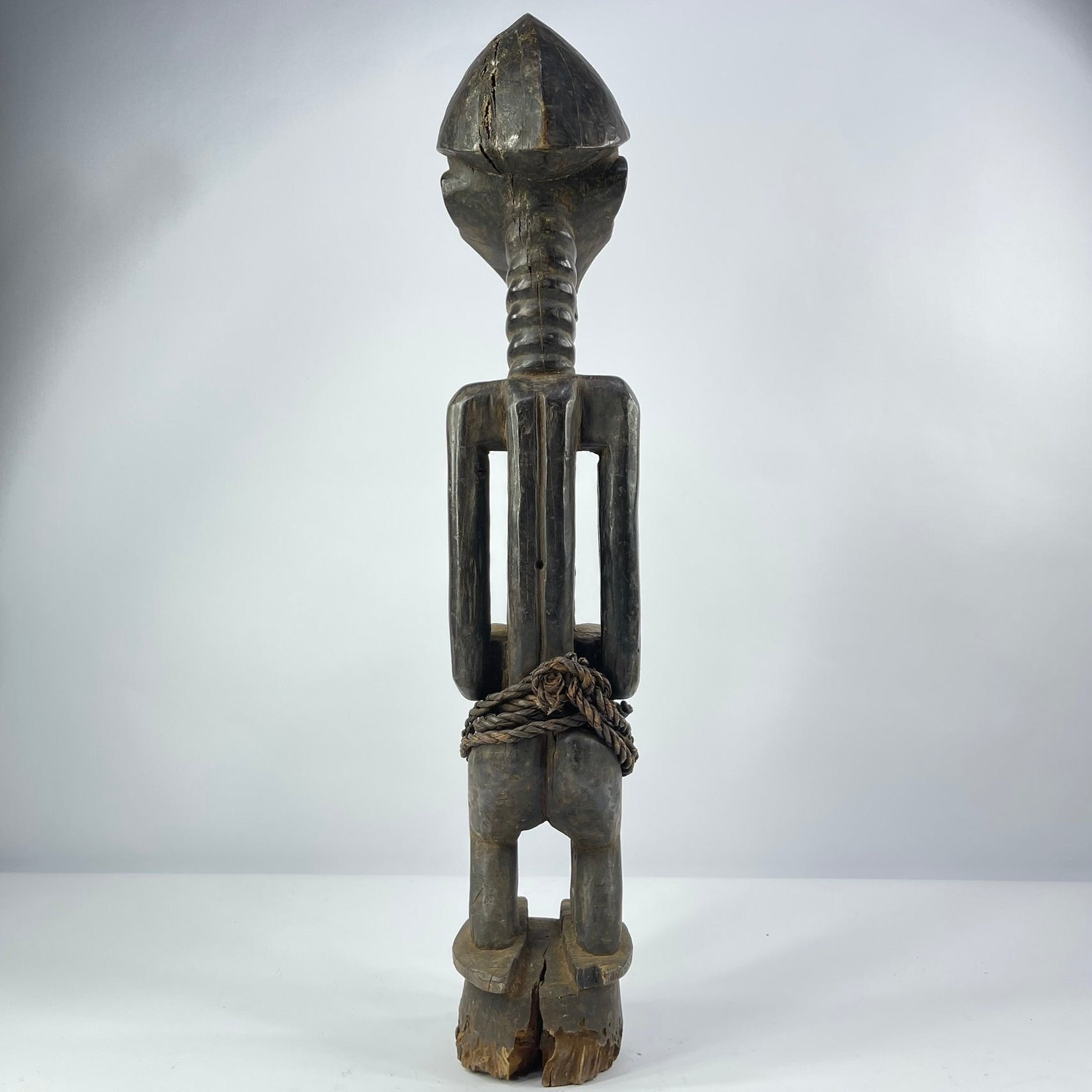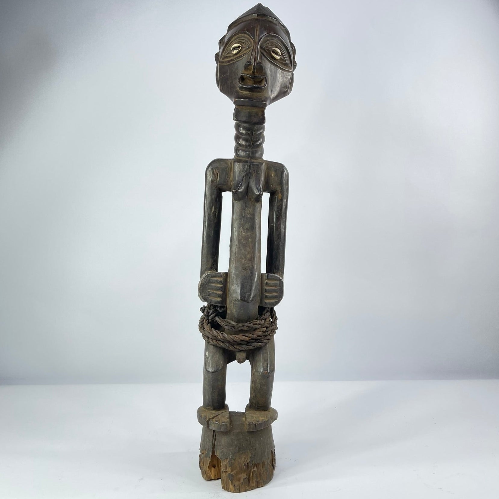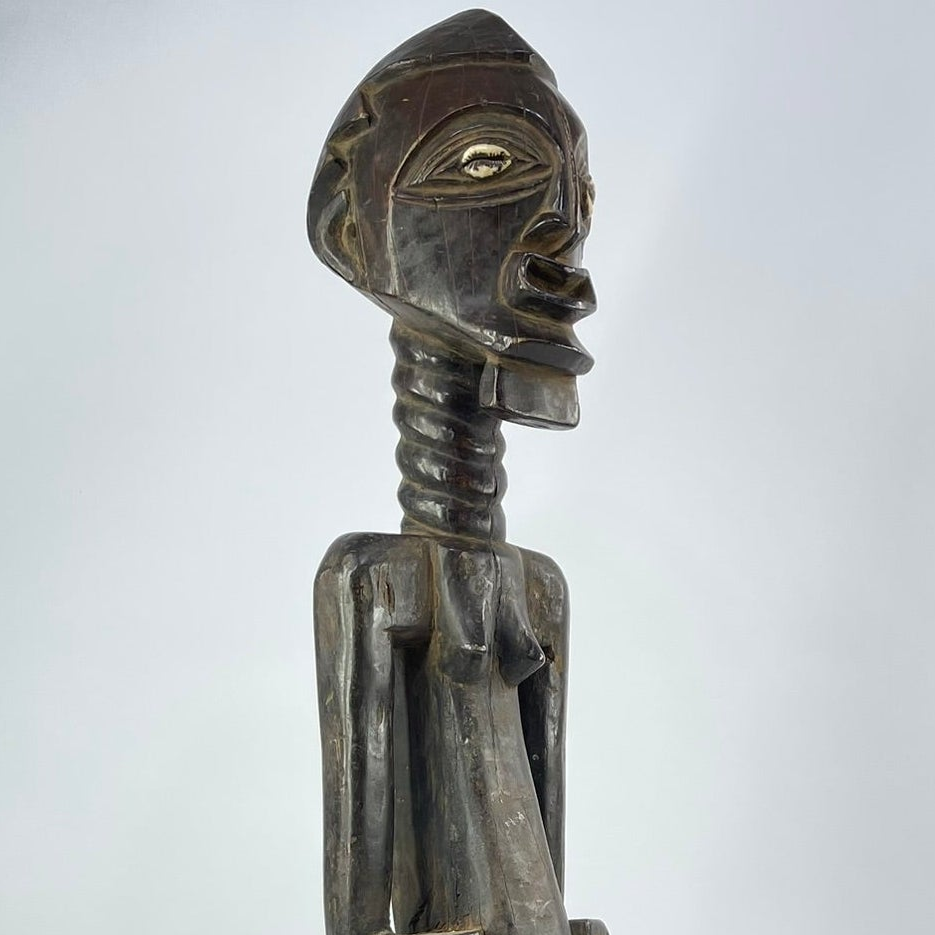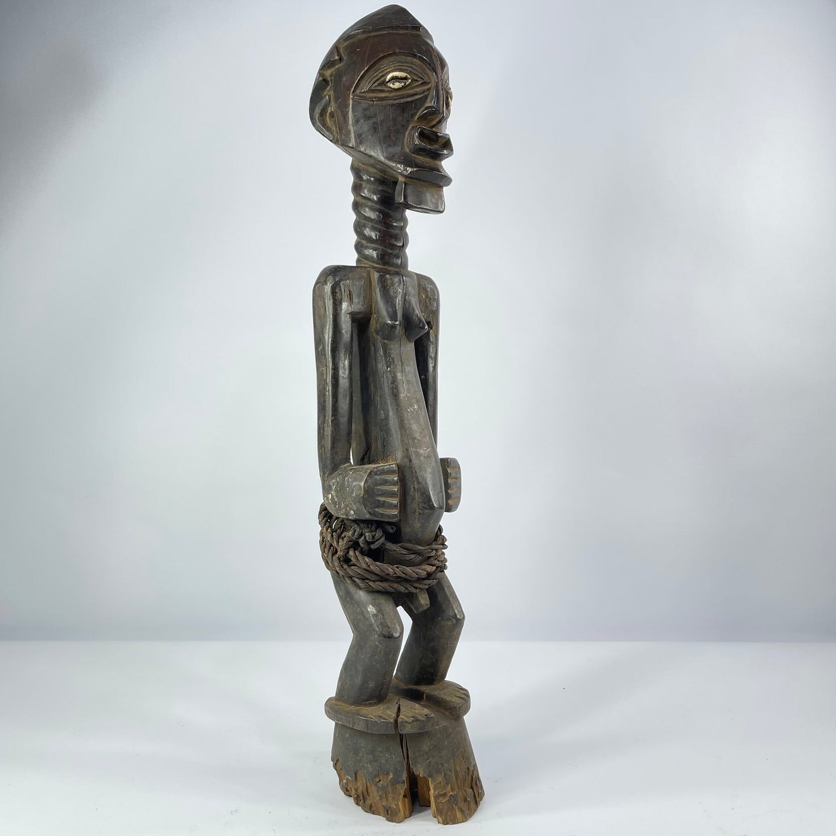 The surface of the figure shows a rich, aged patina, bearing evidence of handling, ritual engagement, and time, all of which contribute to its authenticity and spiritual presence. This sculpture stands as a compelling example of Songye ritual art—both visually striking and deeply rooted in the lived spiritual practices of Central Africa.