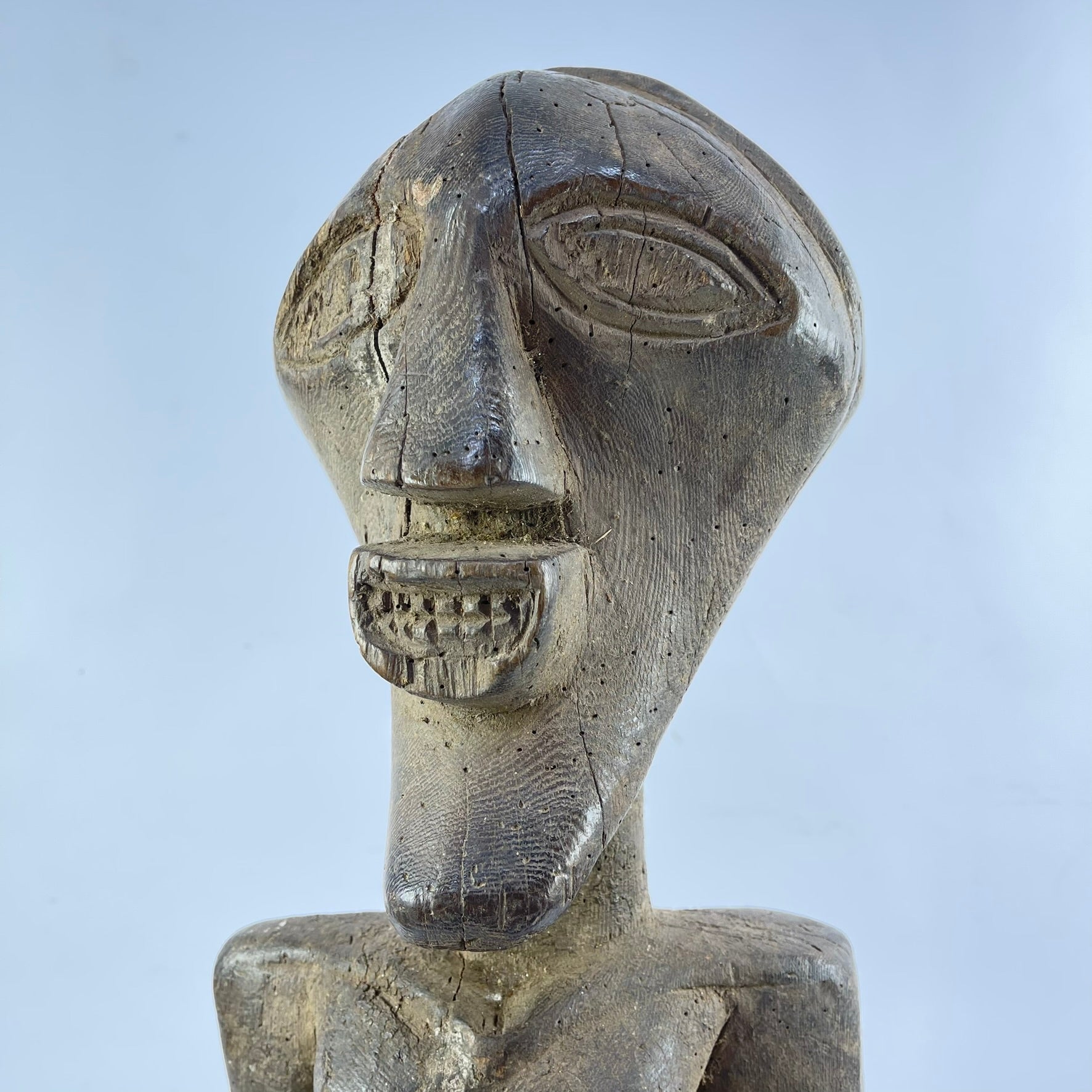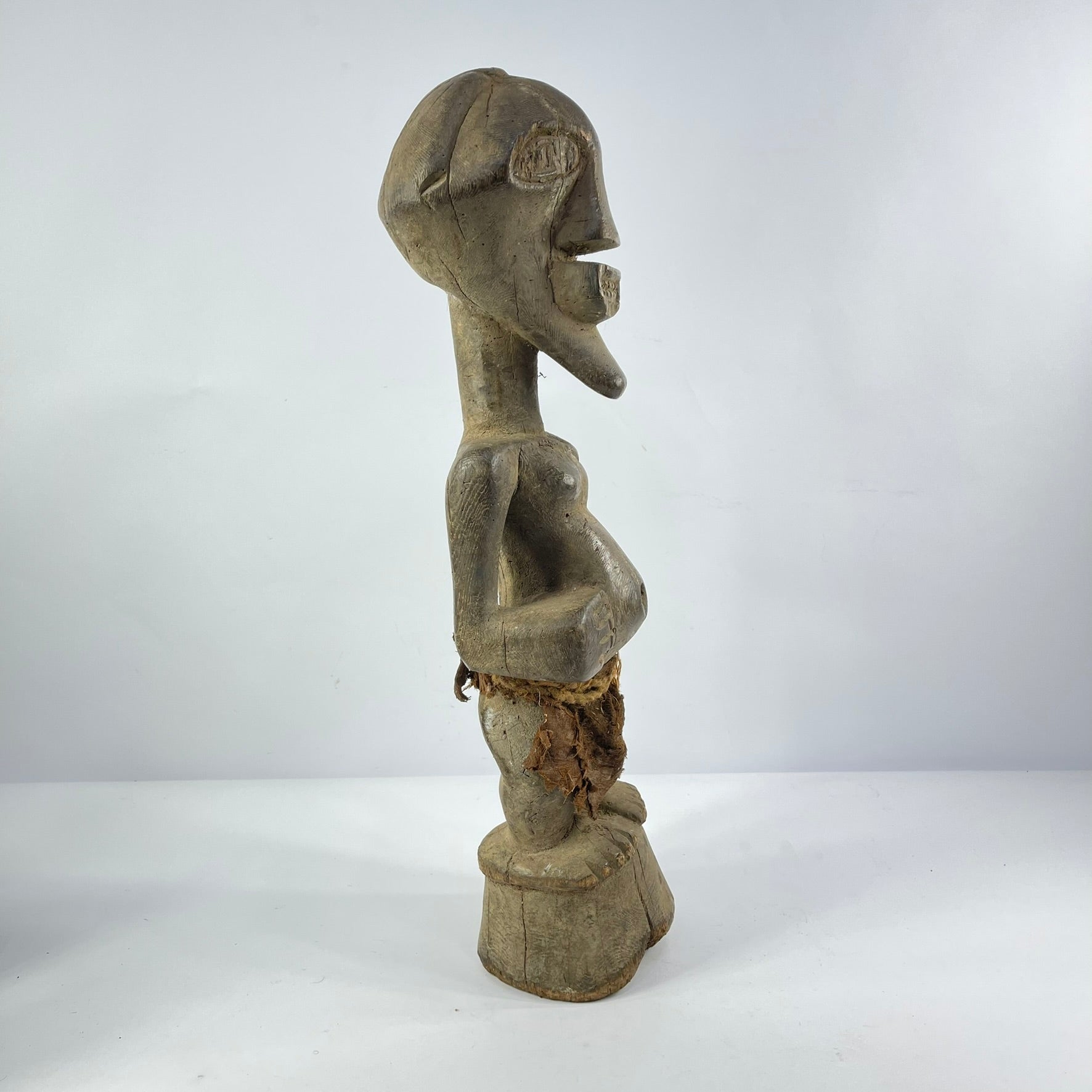 This figure has a strongly defined body and the well-known Songye jutting chin and geometric nose with the eyes sculpturally prominent. Many groups in the greater Congo area, and elsewhere, use art to meet the contingencies of everyday life through the activities of the local priest or diviner known as the Nganga.