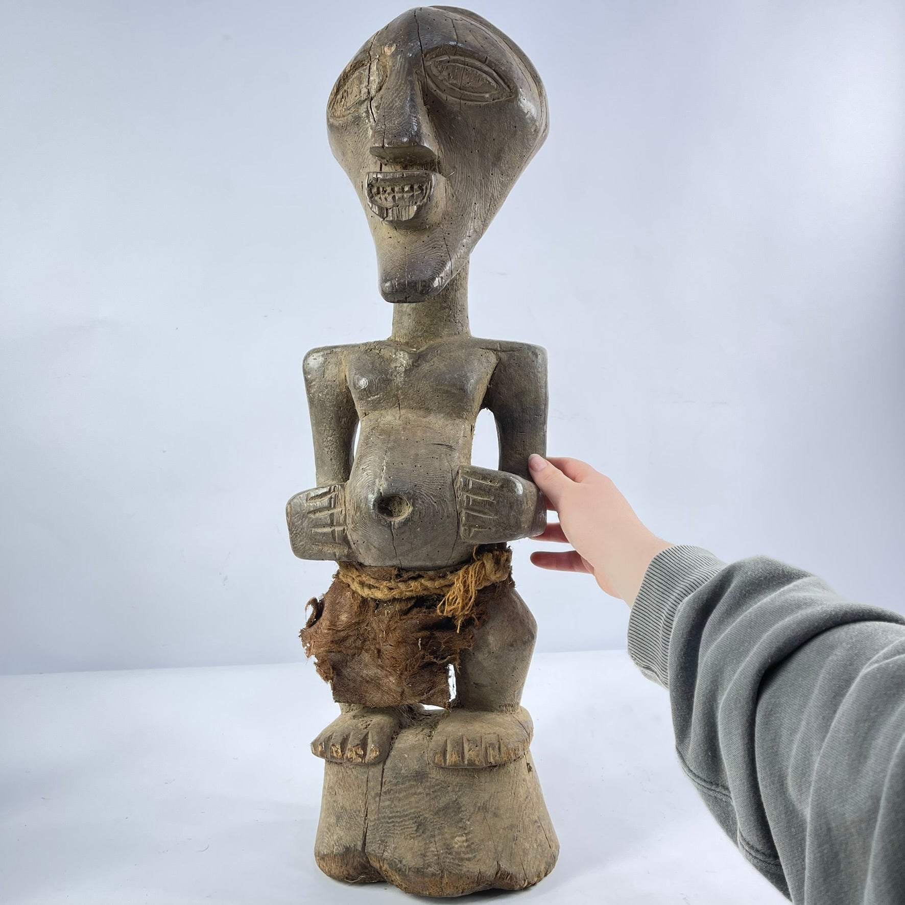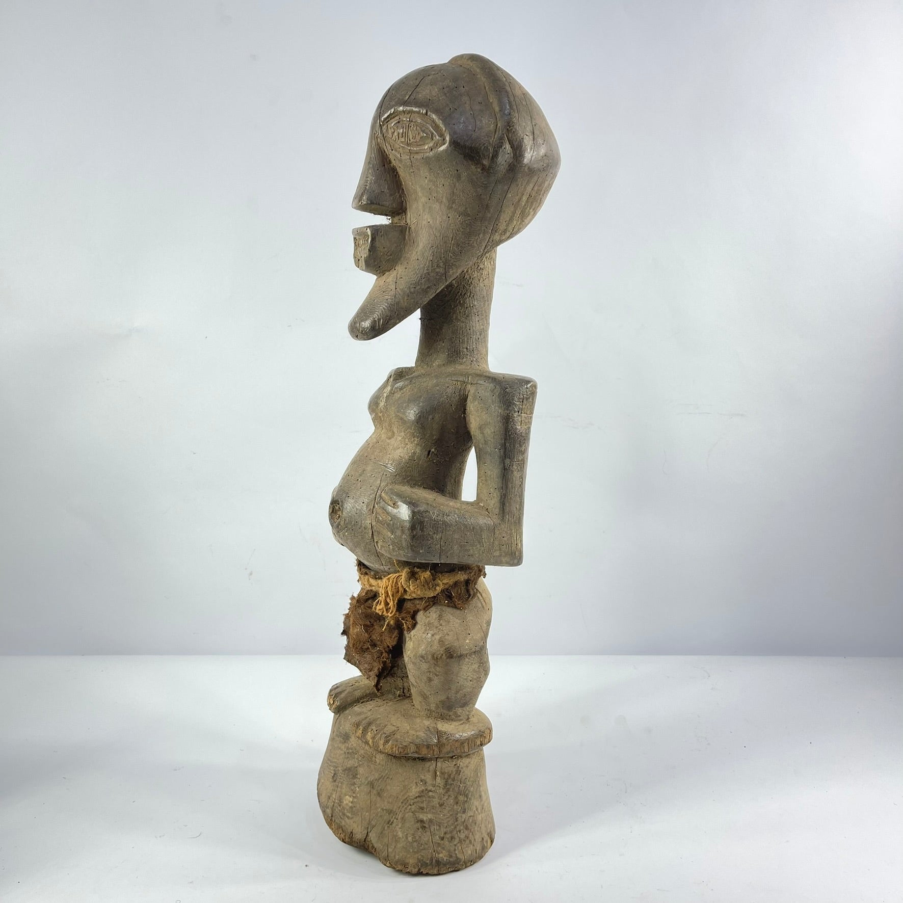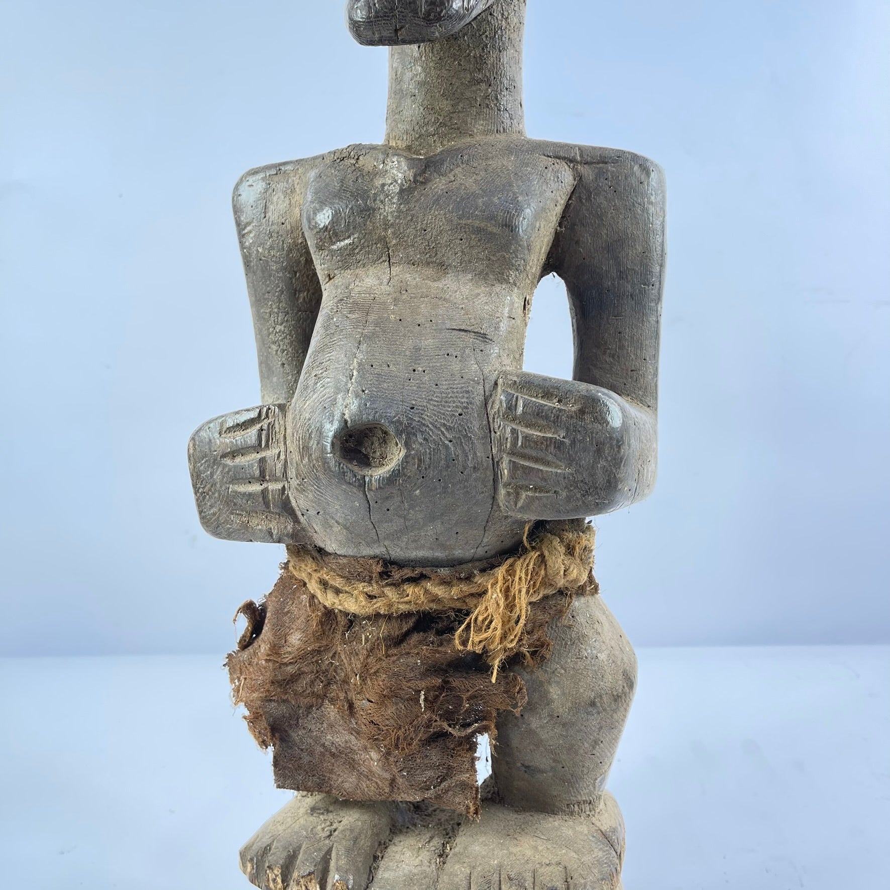 This well-carved Songye standing figure depicts a man with hands on a prominent belly, showcasing classic Songye cubist features with strong lines and distinct facial proportions. Carved from a single dense wood block, the figure exhibits the characteristic jutting chin, geometric nose, and sculpturally prominent eyes typical of Songye art. In the greater Congo region, sculptures like these, known as Nkishi, hold significance in the practices of local priests or diviners called Nganga. These spiritually adept individuals use rituals, secret formulas, and sculptures like the Nkishi for healing, preventing malevolent forces, divination, and connecting with the spirit world. For the Songye and other Bantu language speakers, figures like this serve as a nexus between the diviner's rituals and spiritual presence, evident in the object's aged surface from extended use and accumulated elements.