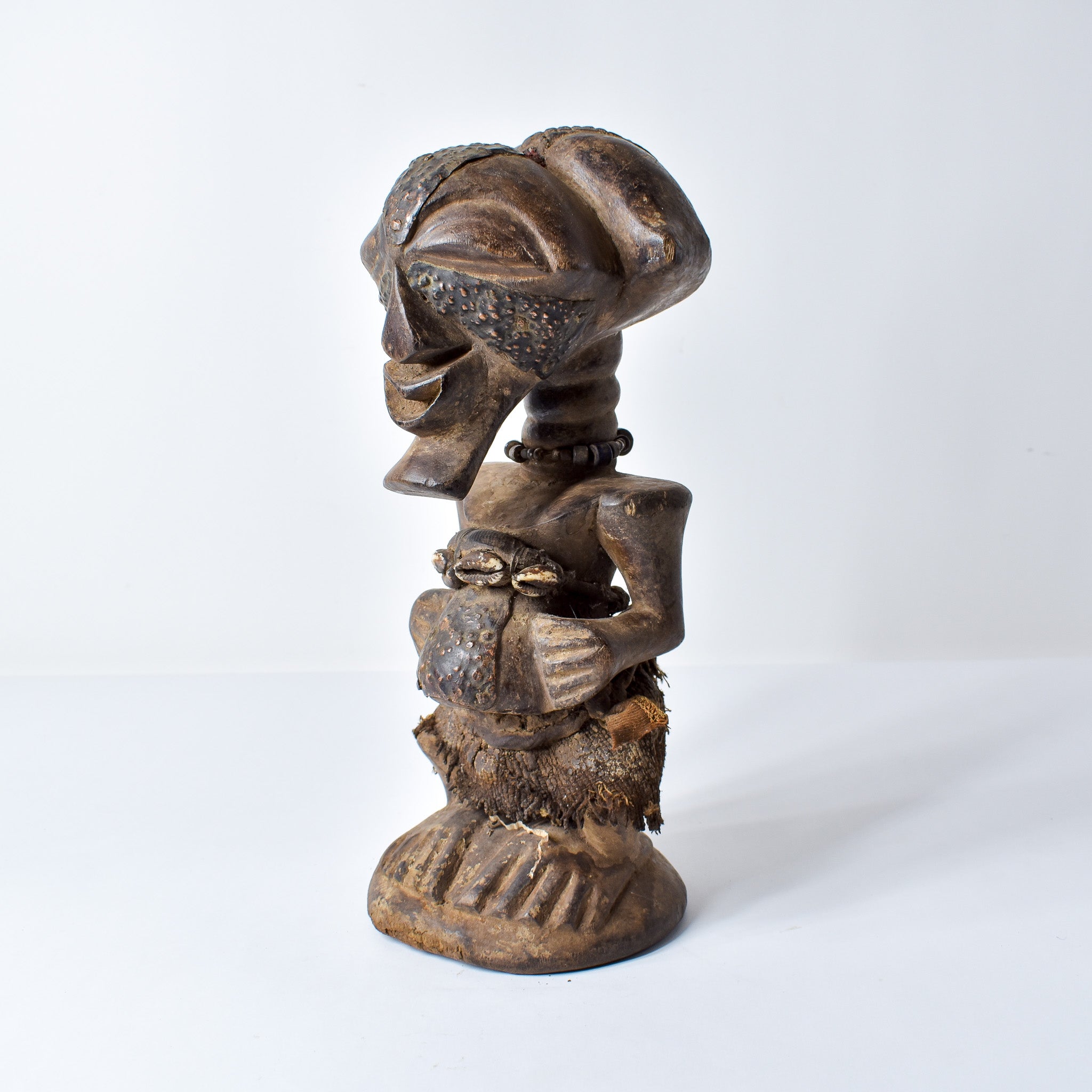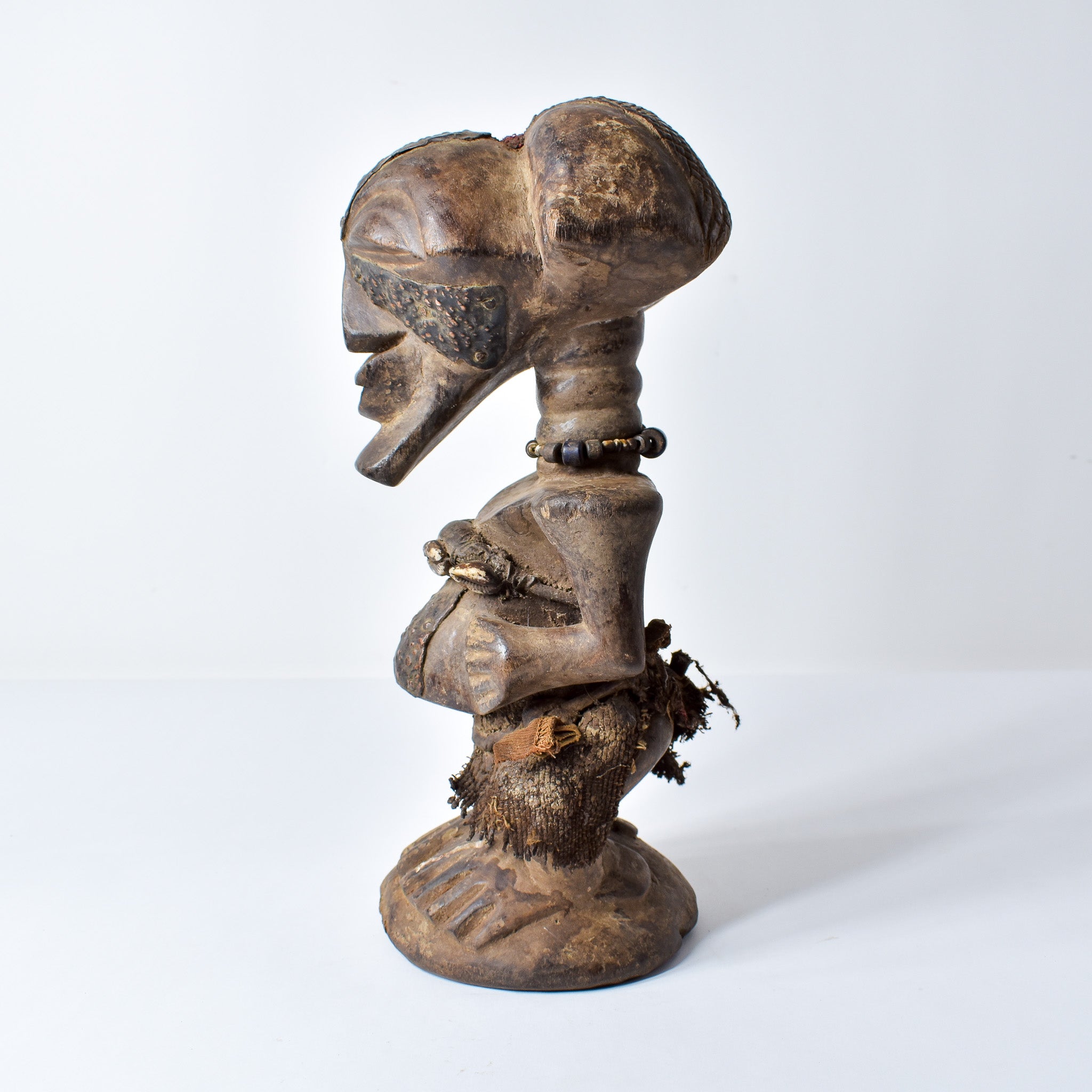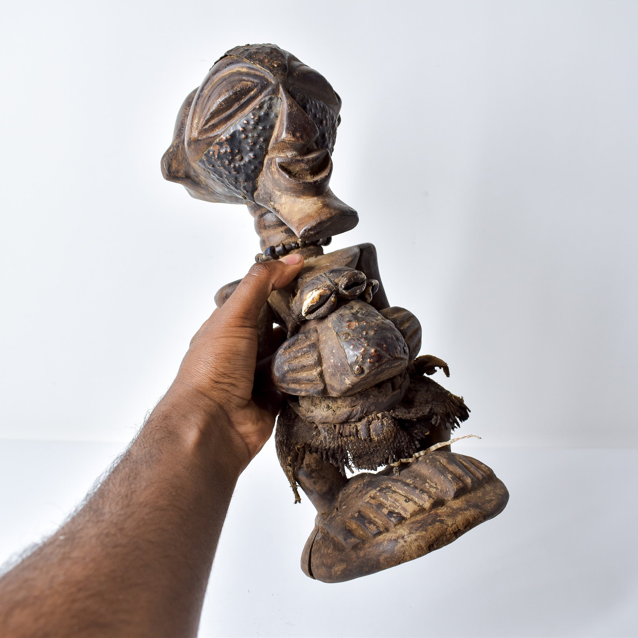 The Songye Nkishi power fetish figure originates from the Lualaba River in the savanna territory. Figures like this are usually placed on family or village altars to commune with ancestors and nature spirits alongside prayers, other animal spirits, and offerings. Sculptures like the Nkishi are integral to the practices of Nganga, spiritual leaders with divinatory abilities who utilized rituals and sculptures to heal, for protection, and interact with the spiritual realm. Most Nkishi power figures contain magical materials on their pronounced bellies and serve as a conduit between the Nganga's ritualistic actions and the spiritual entities that accompany them.