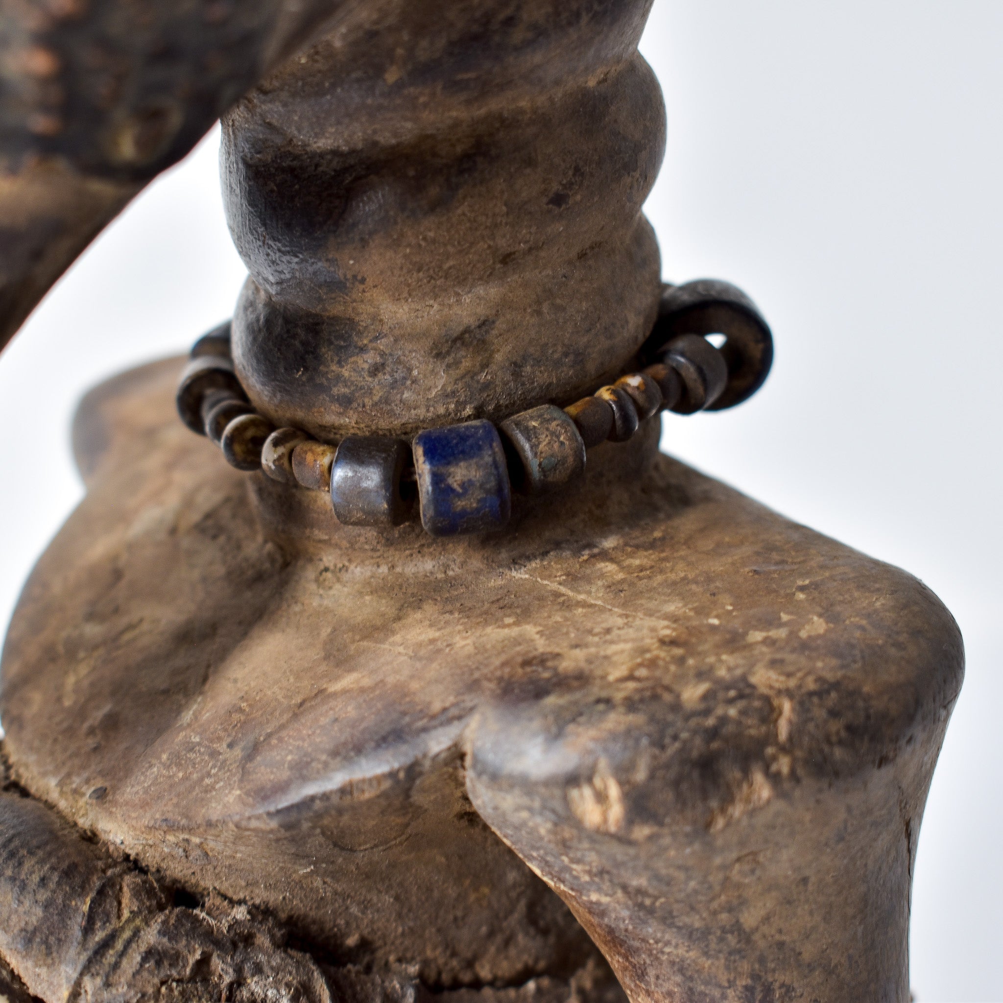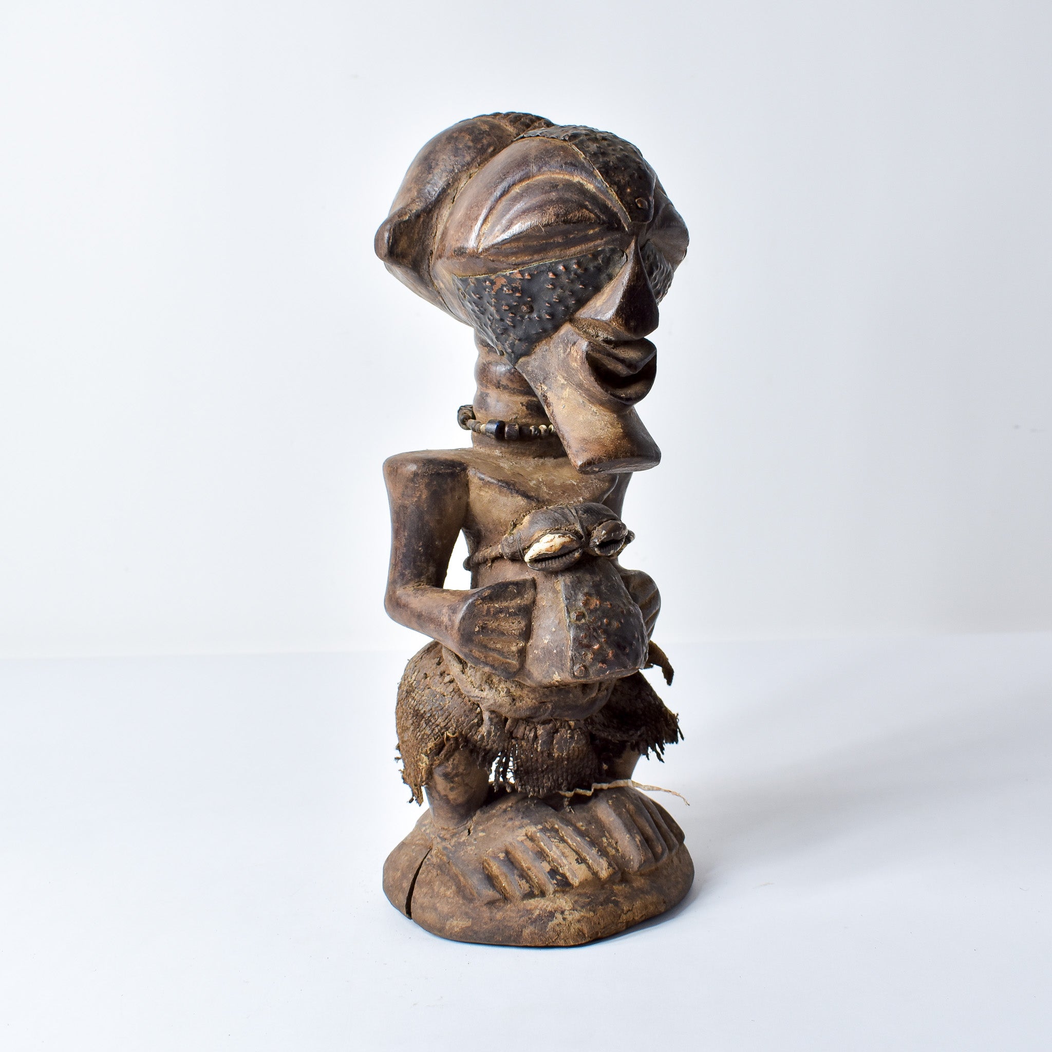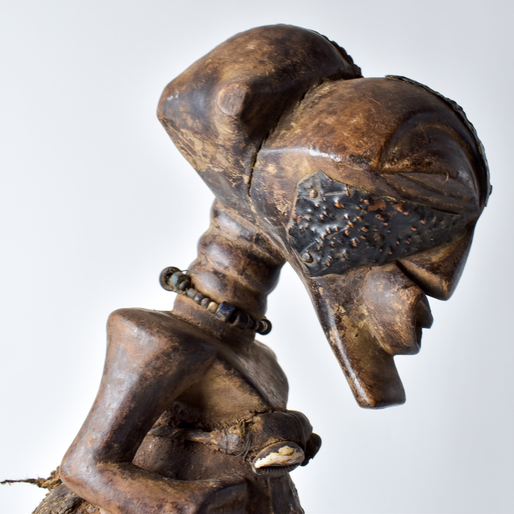 The Songye Nkishi power fetish figure originates from the Lualaba River in the savanna territory. Figures like this are usually placed on family or village altars to commune with ancestors and nature spirits alongside prayers, other animal spirits, and offerings. Sculptures like the Nkishi are integral to the practices of Nganga, spiritual leaders with divinatory abilities who utilized rituals and sculptures to heal, for protection, and interact with the spiritual realm. Most Nkishi power figures contain magical materials on their pronounced bellies and serve as a conduit between the Nganga's ritualistic actions and the spiritual entities that accompany them.