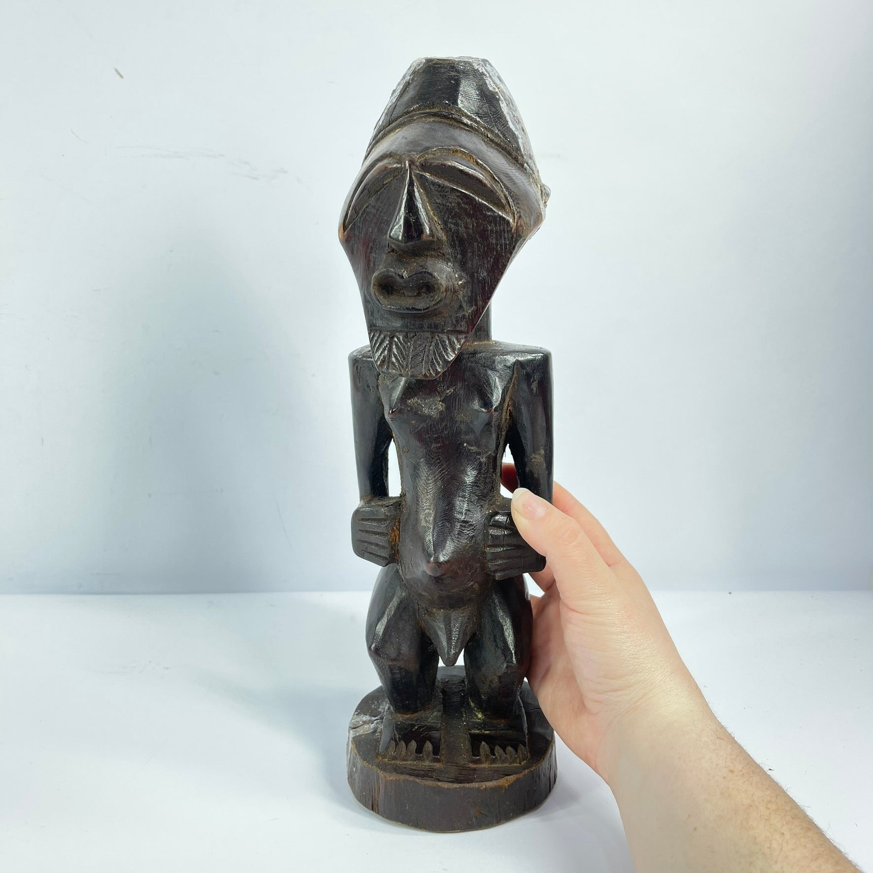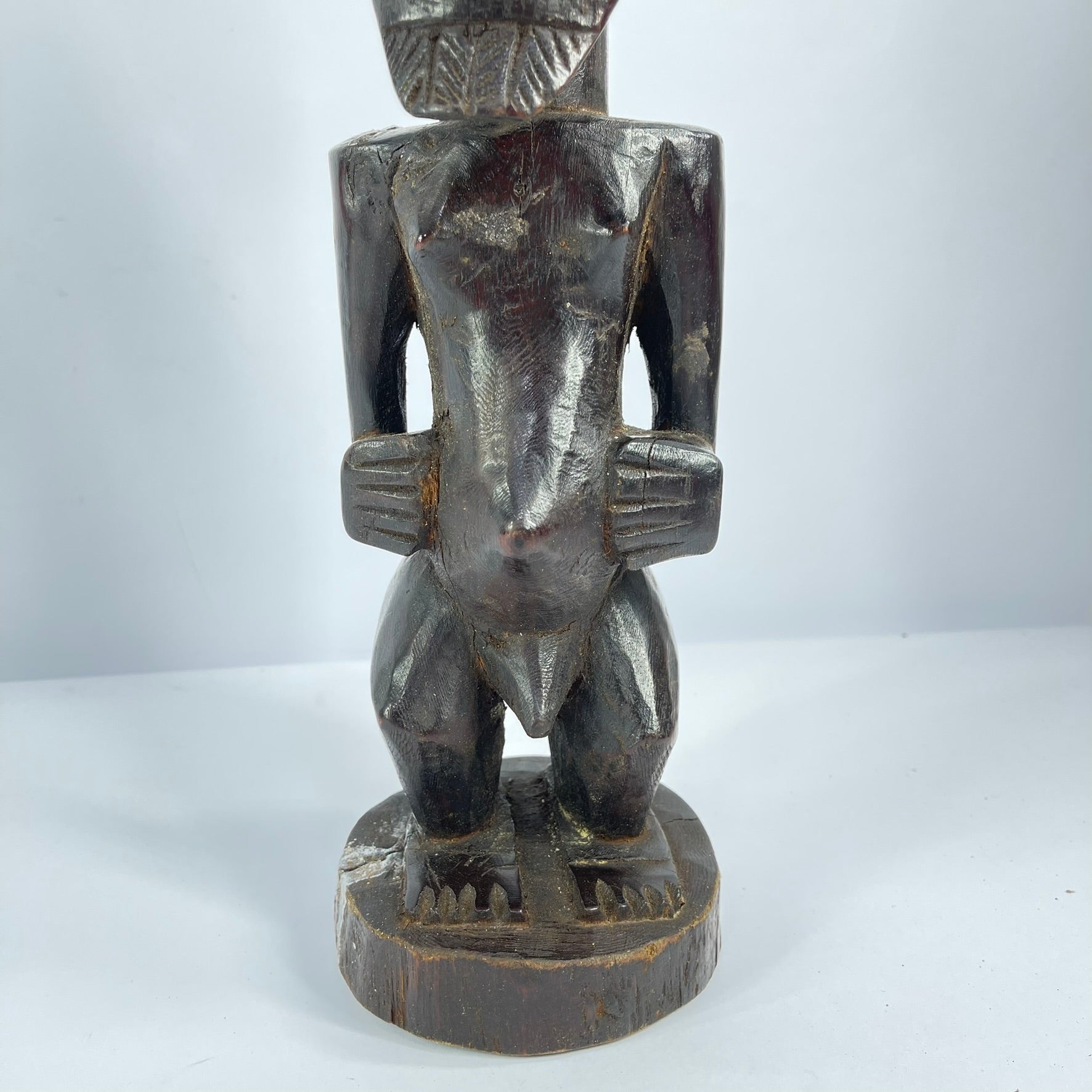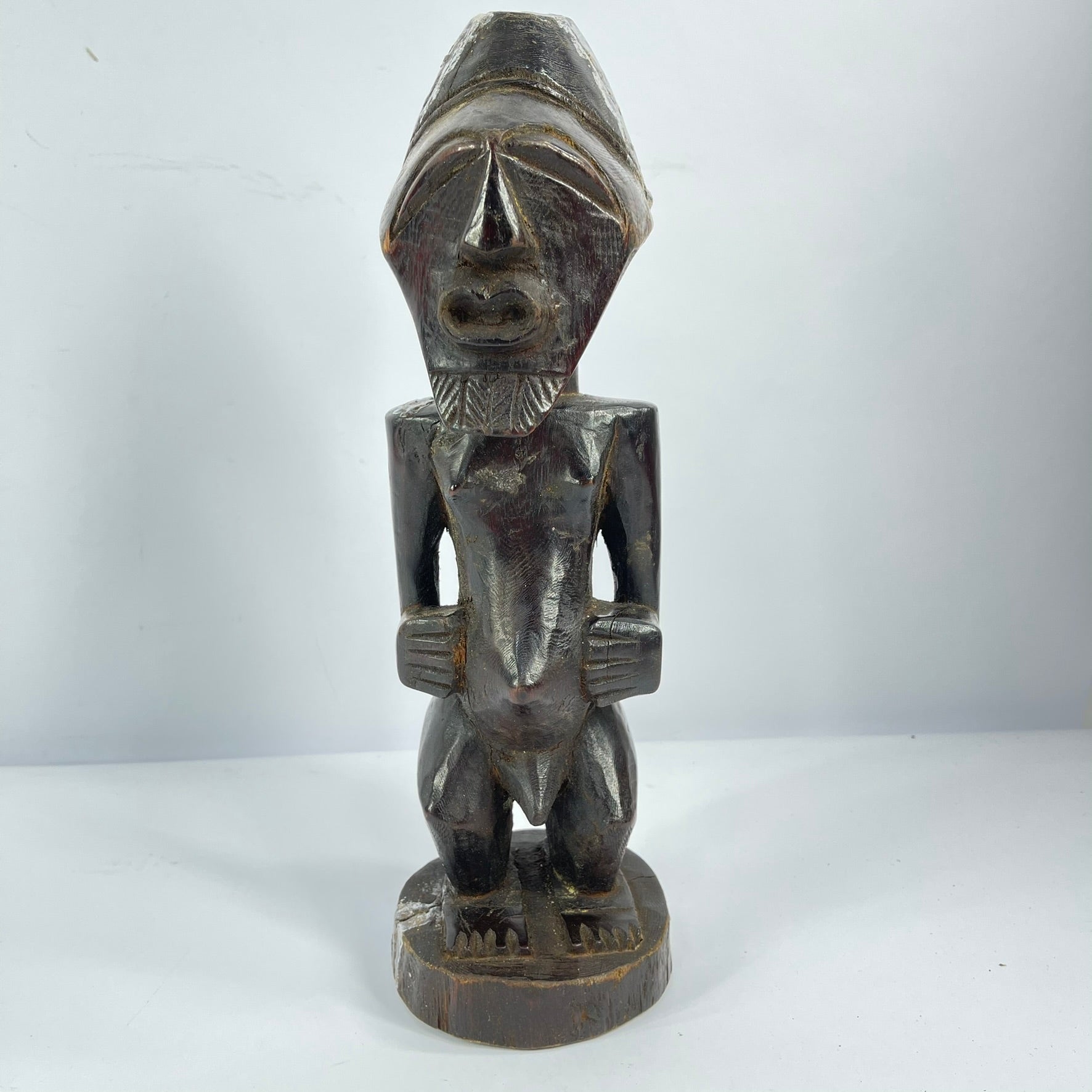 The Songye Nkishi power fetish figure originates from the Lualaba River in the savanna territory. Figures like this are usually placed on family or village altars to commune with ancestors and nature spirits alongside prayers, other animal spirits, and offerings. Sculptures like the Nkishi are integral to the practices of Nganga, spiritual leaders with divinatory abilities who utilize rituals and sculptures to heal, for protection, and interact with the spiritual realm. Most Nkishi power figures contain magical materials on their pronounced bellies and serve as a conduit between the Nganga's ritualistic actions and the spiritual entities that accompany them.
