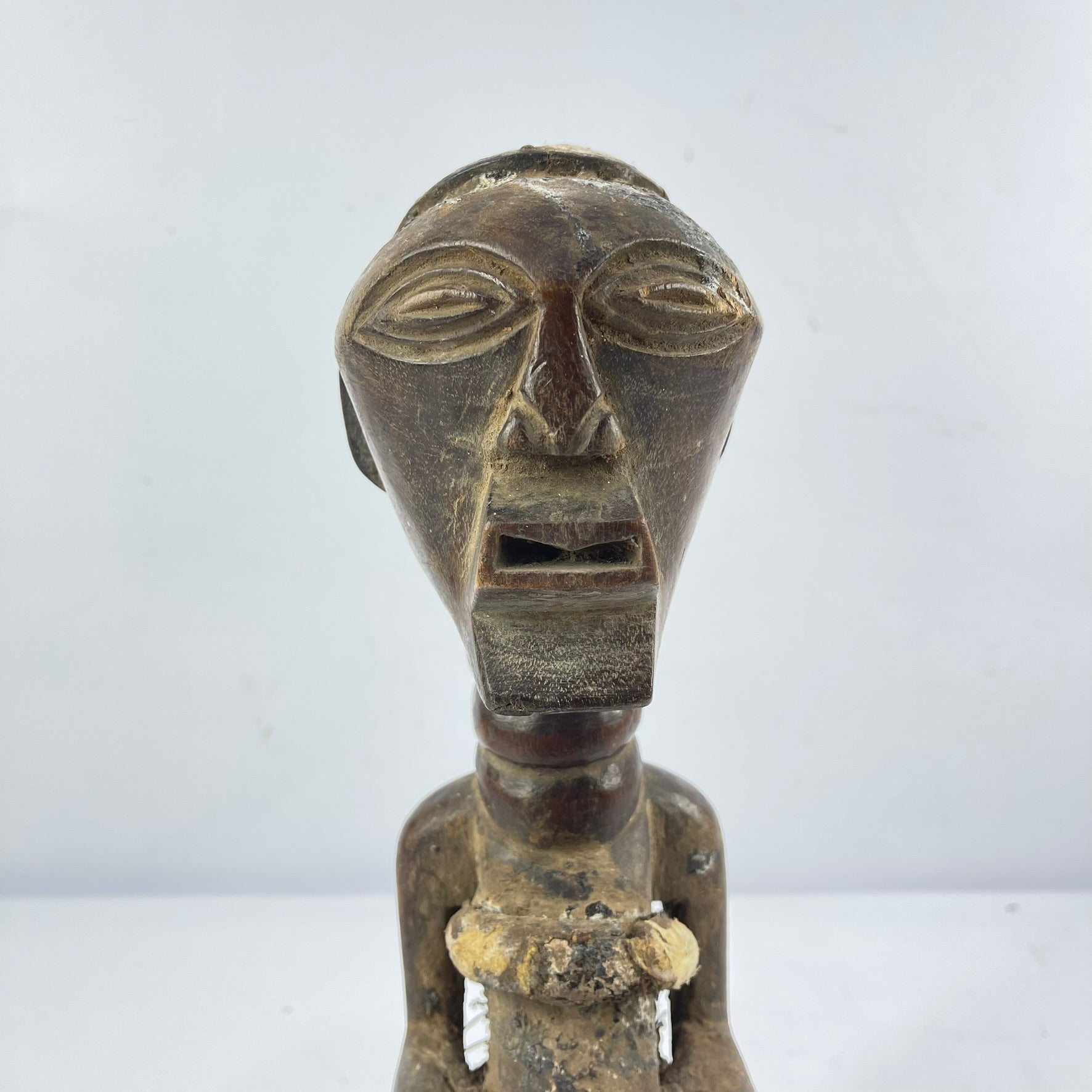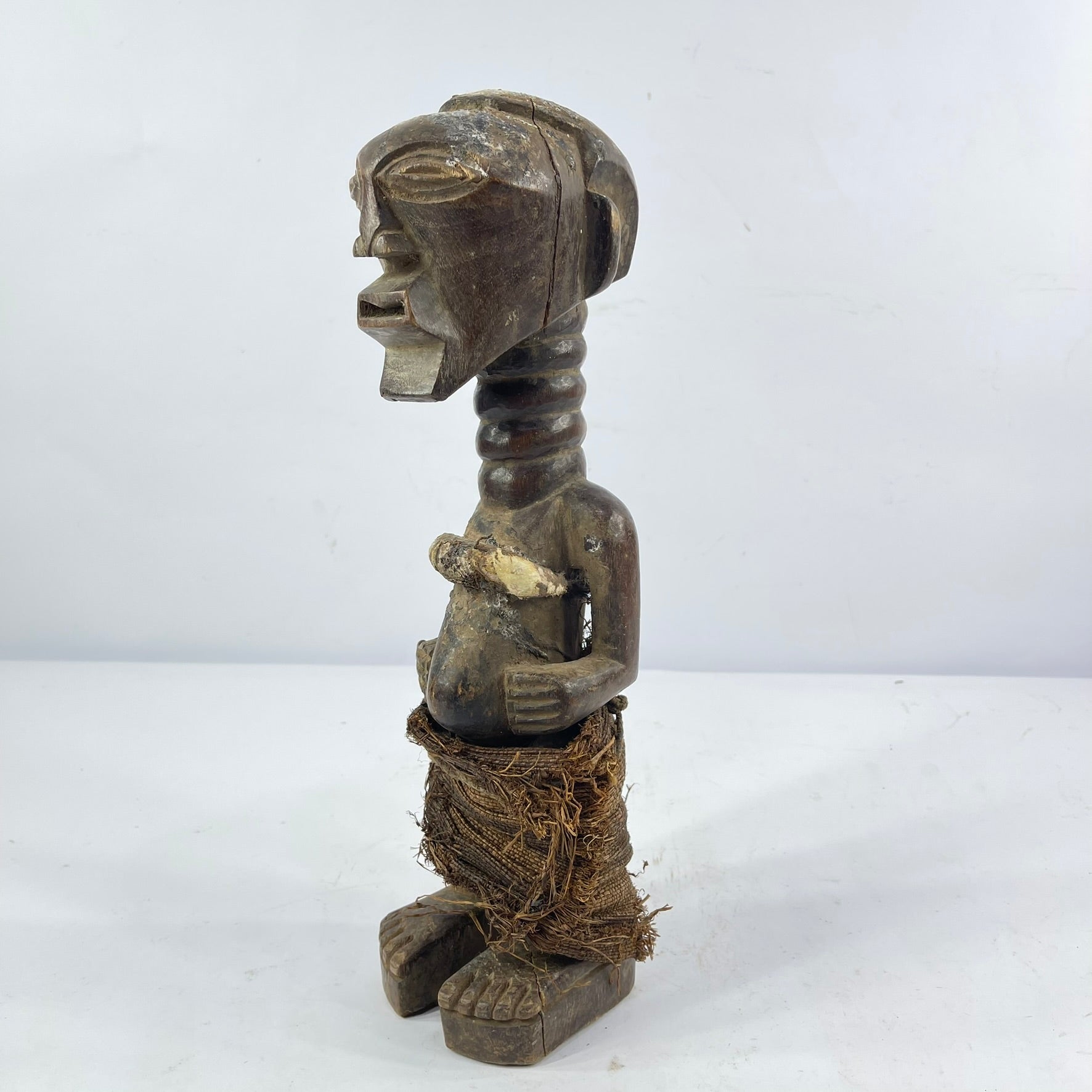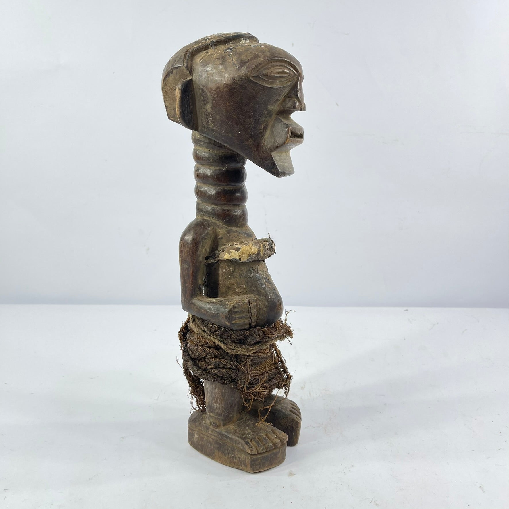 The Songye Nkishi power fetish figure originates from the Lualaba River in the savanna territory. Figures like this are usually placed on family or village altars to commune with ancestors and nature spirits alongside prayers, other animal spirits, and offerings. Sculptures like the Nkishi are integral to the practices of Nganga, spiritual leaders with divinatory abilities who utilize rituals and sculptures to heal, for protection, and interact with the spiritual realm. Most Nkishi power figures contain magical materials on their pronounced bellies and serve as a conduit between the Nganga's ritualistic actions and the spiritual entities that accompany them.