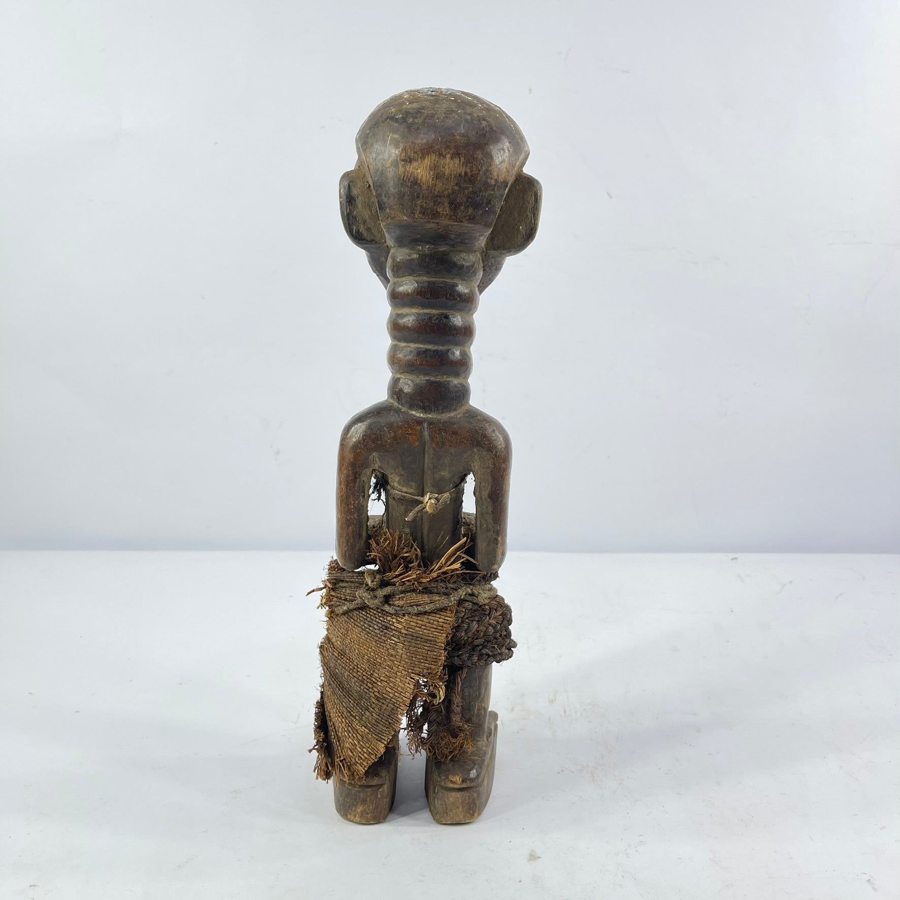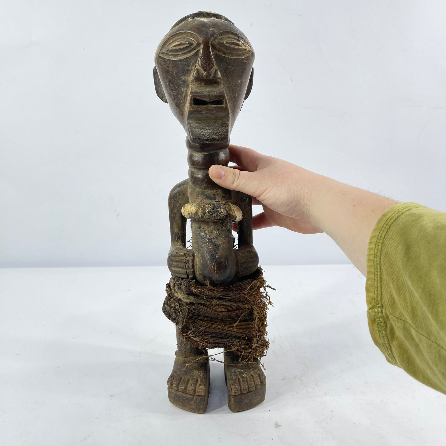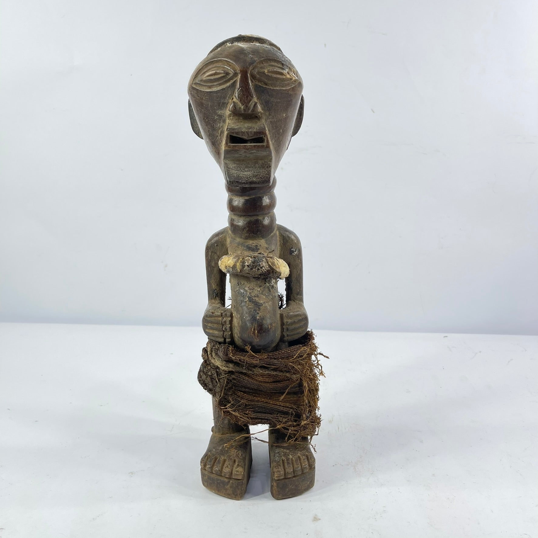 The Songye Nkishi power fetish figure originates from the Lualaba River in the savanna territory. Figures like this are usually placed on family or village altars to commune with ancestors and nature spirits alongside prayers, other animal spirits, and offerings. Sculptures like the Nkishi are integral to the practices of Nganga, spiritual leaders with divinatory abilities who utilize rituals and sculptures to heal, for protection, and interact with the spiritual realm. Most Nkishi power figures contain magical materials on their pronounced bellies and serve as a conduit between the Nganga's ritualistic actions and the spiritual entities that accompany them.