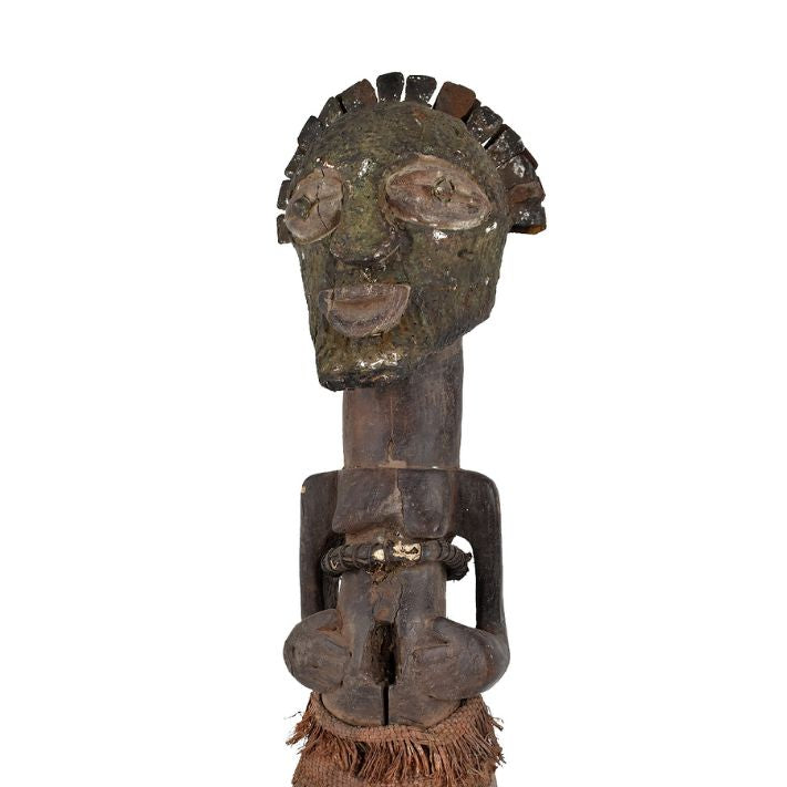 This figure has a strongly defined body and the well-known Songye jutting chin and geometric nose, with the eyes sculpturally prominent. Many groups in the greater Congo area, and elsewhere, use art to meet the contingencies of everyday life through the activities of the local priest or diviner known as the Nganga.