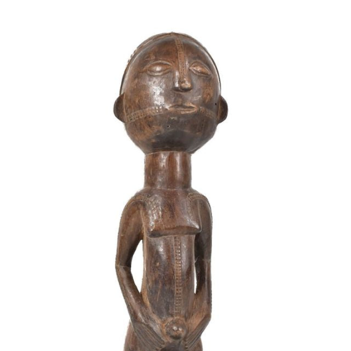 The Tabwa male figure stands as a remarkable embodiment of tradition and cultural identity within the Tabwa community of the Democratic Republic of the Congo, Zambia, and Tanzania. Crafted with meticulous detail and reverence, this wooden sculpture portrays the essence of Tabwa masculinity and societal roles. The figure's form exudes strength and dignity, reflecting the revered status of Tabwa men within their community. Adorned with intricate scarification patterns known as vindala, meticulously carved along the face and body, the figure symbolizes not only individual identity but also social hierarchy and spiritual connection. These scarifications serve as a visual narrative of the wearer's journey through life, marking milestones and achievements within Tabwa society. From its noble posture to its expressive facial features, every aspect of the Tabwa male figure speaks to a rich cultural heritage and deep-rooted symbolism, making it a captivating piece for collectors and a profound representation of Tabwa artistry and tradition.