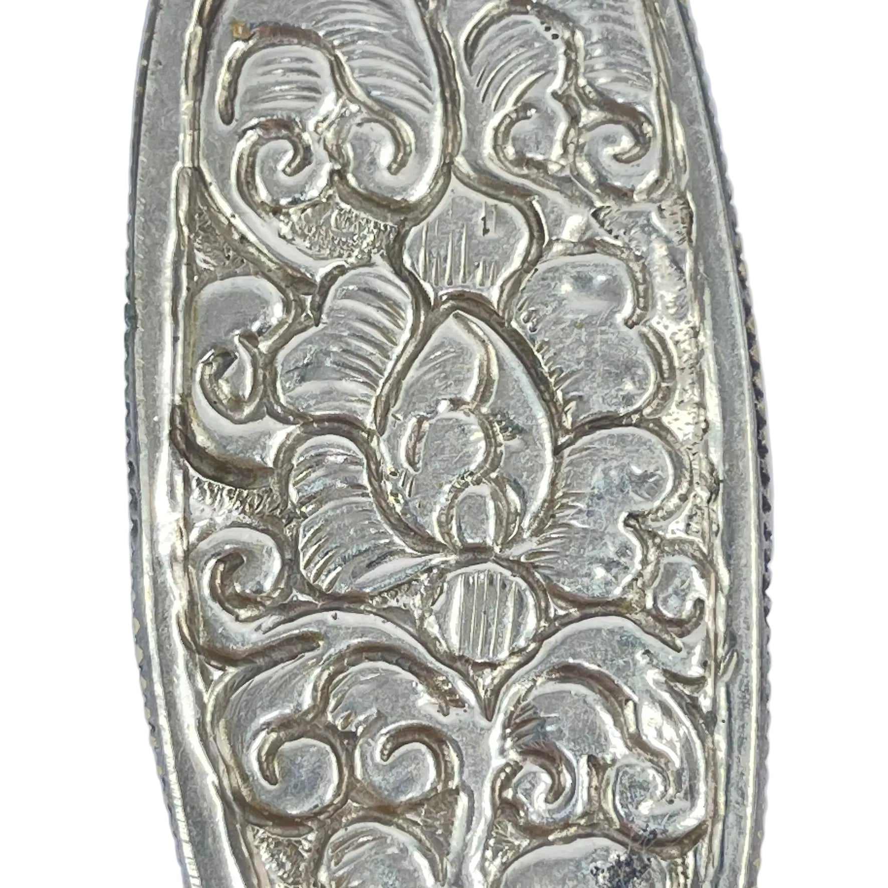 Crafted with meticulous attention to detail, these pendants feature a base of high-quality stone, meticulously molded into teardrop shapes. The stone is a canvas for the intricate silver repousse work that adorns its surface. Silver repousse, an ancient metalworking technique, involves delicately hammering and shaping thin sheets of silver to create intricate designs and relief patterns. In the case of these pendants, the silver is skillfully applied onto the stone base, resulting in stunningly detailed motifs that seem to come alive with depth and texture.