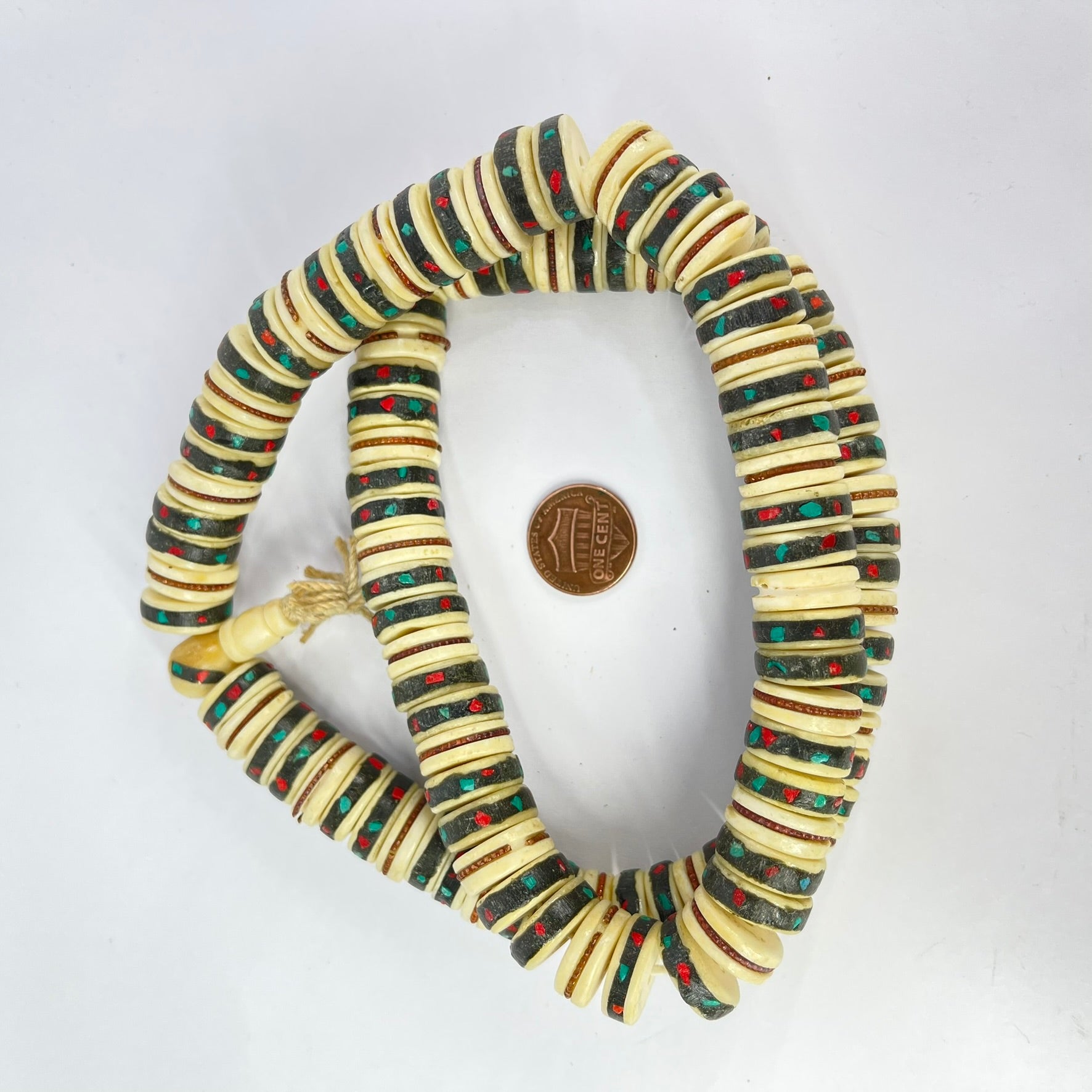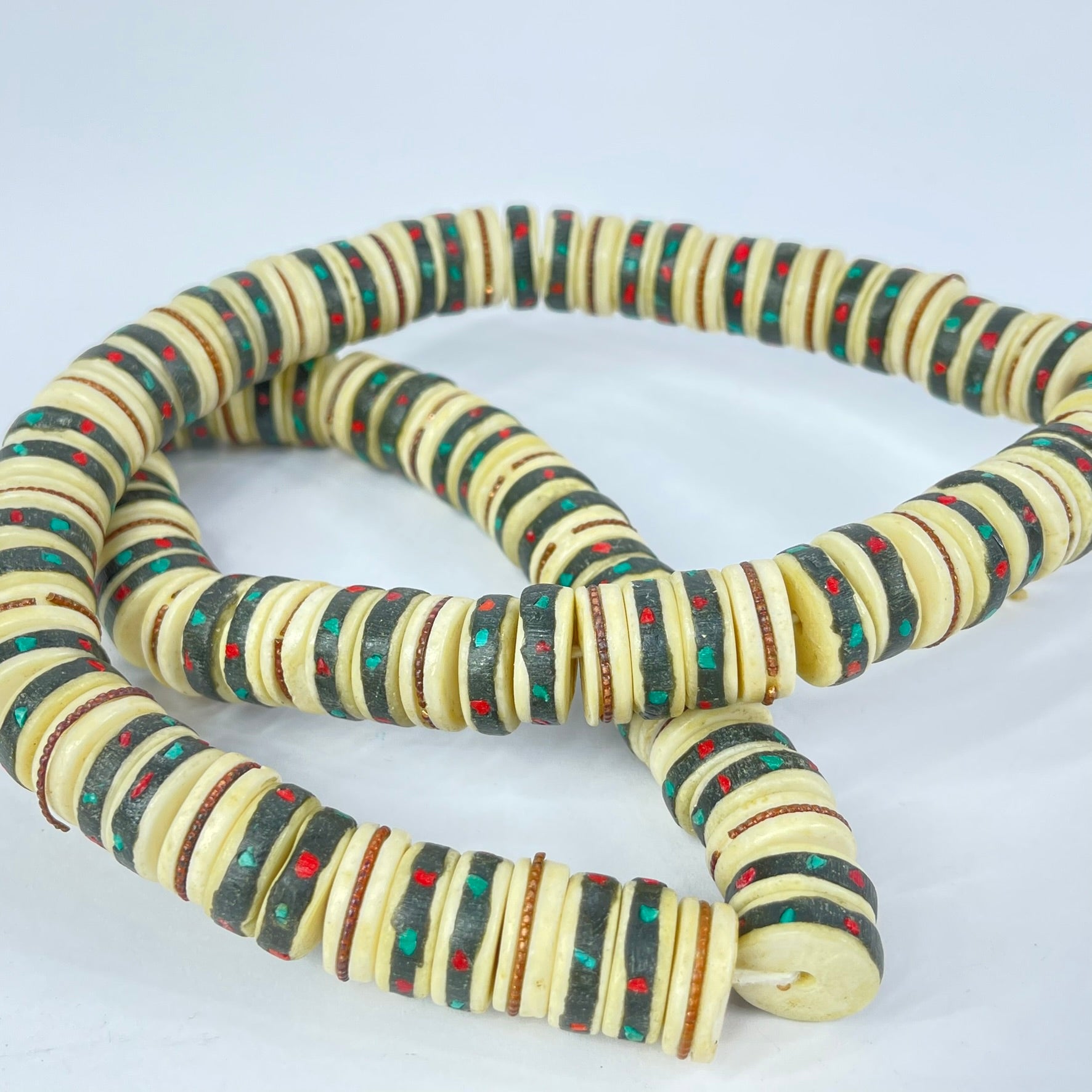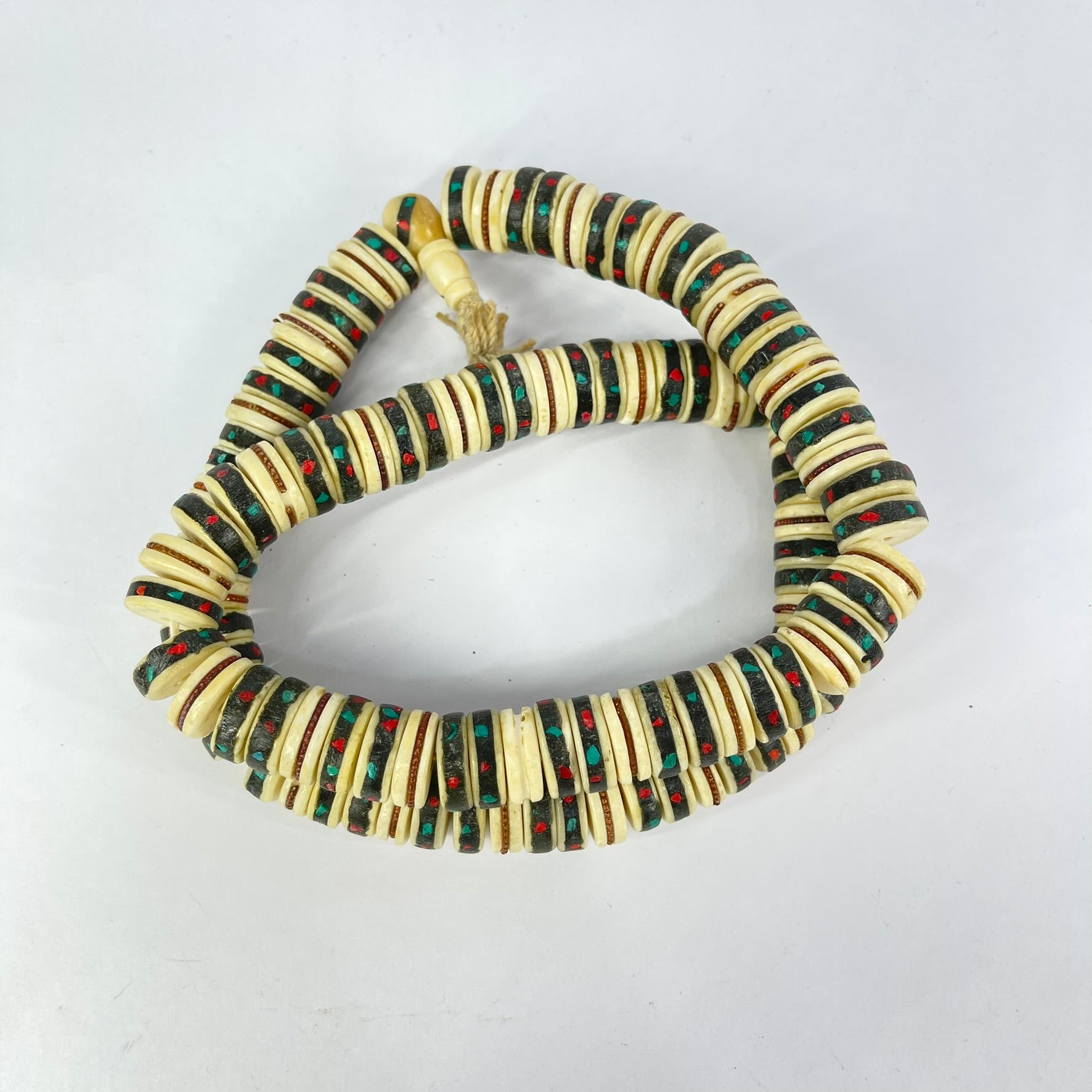 These beautiful prayer beads are inlaid with bone, copper, turquoise, and coral.
