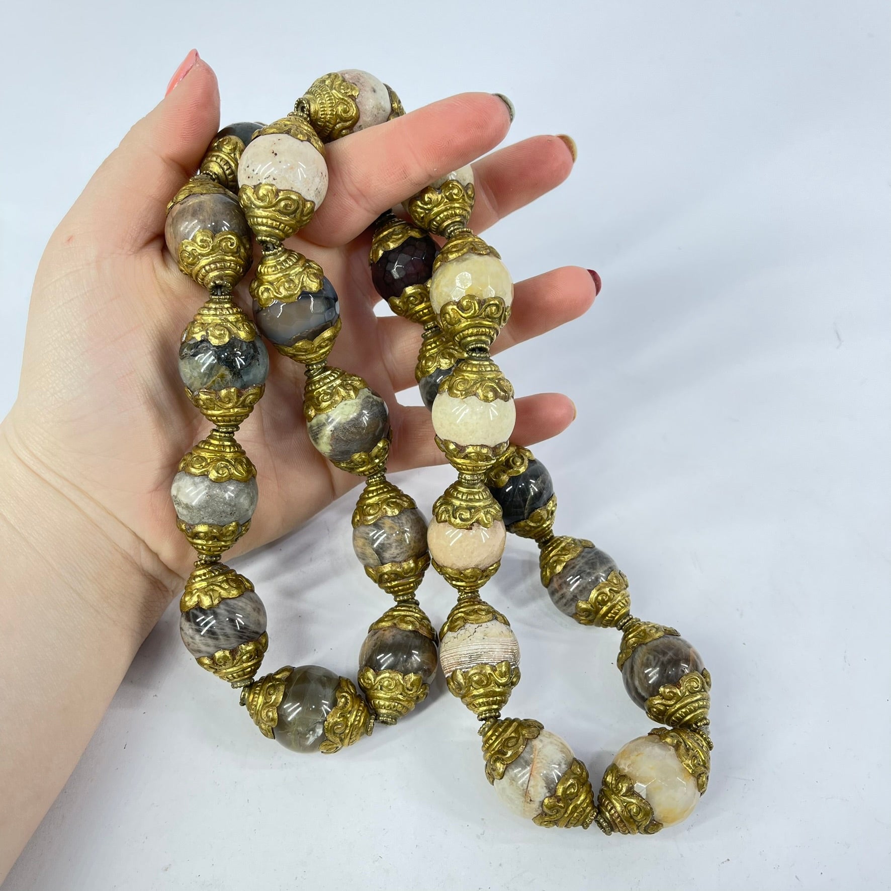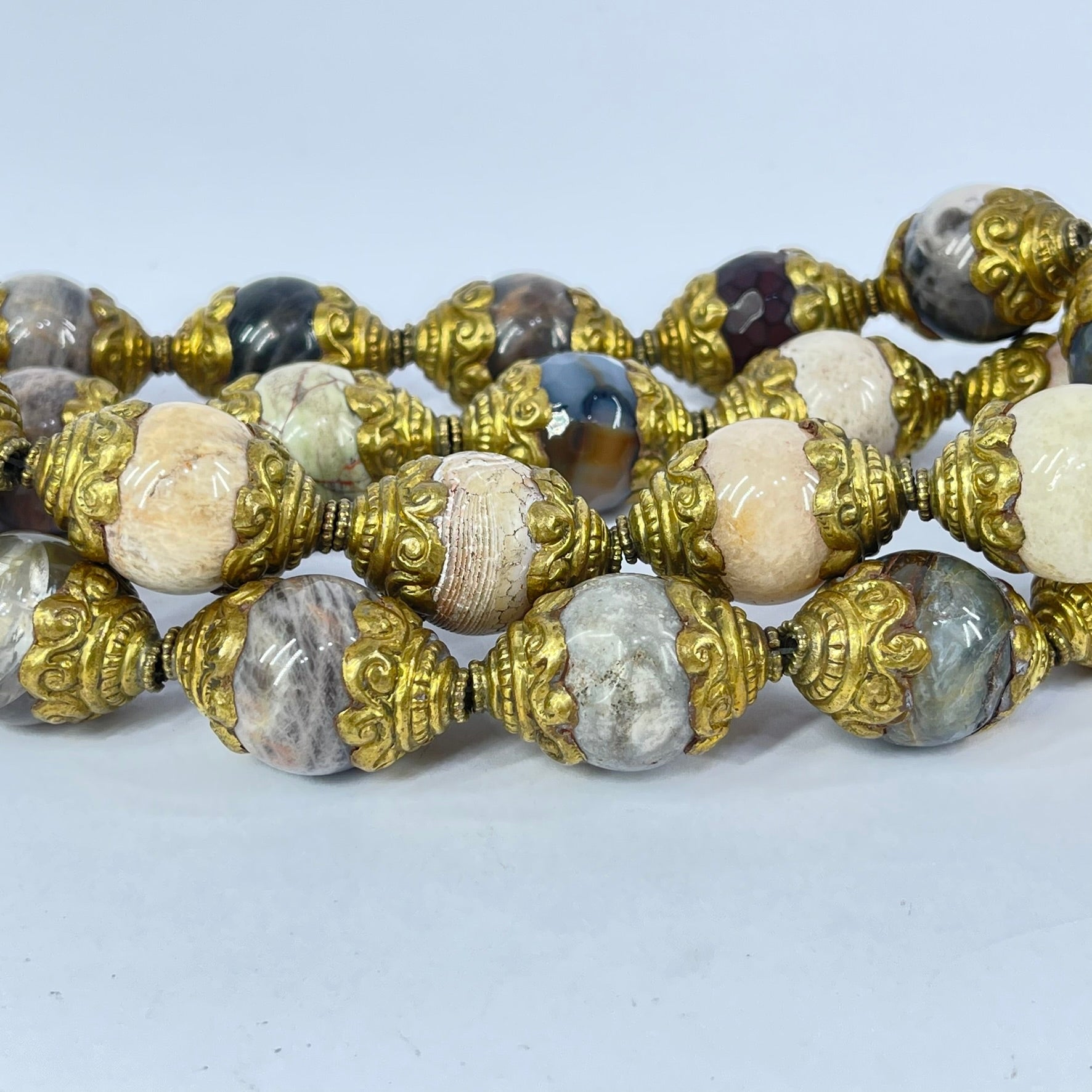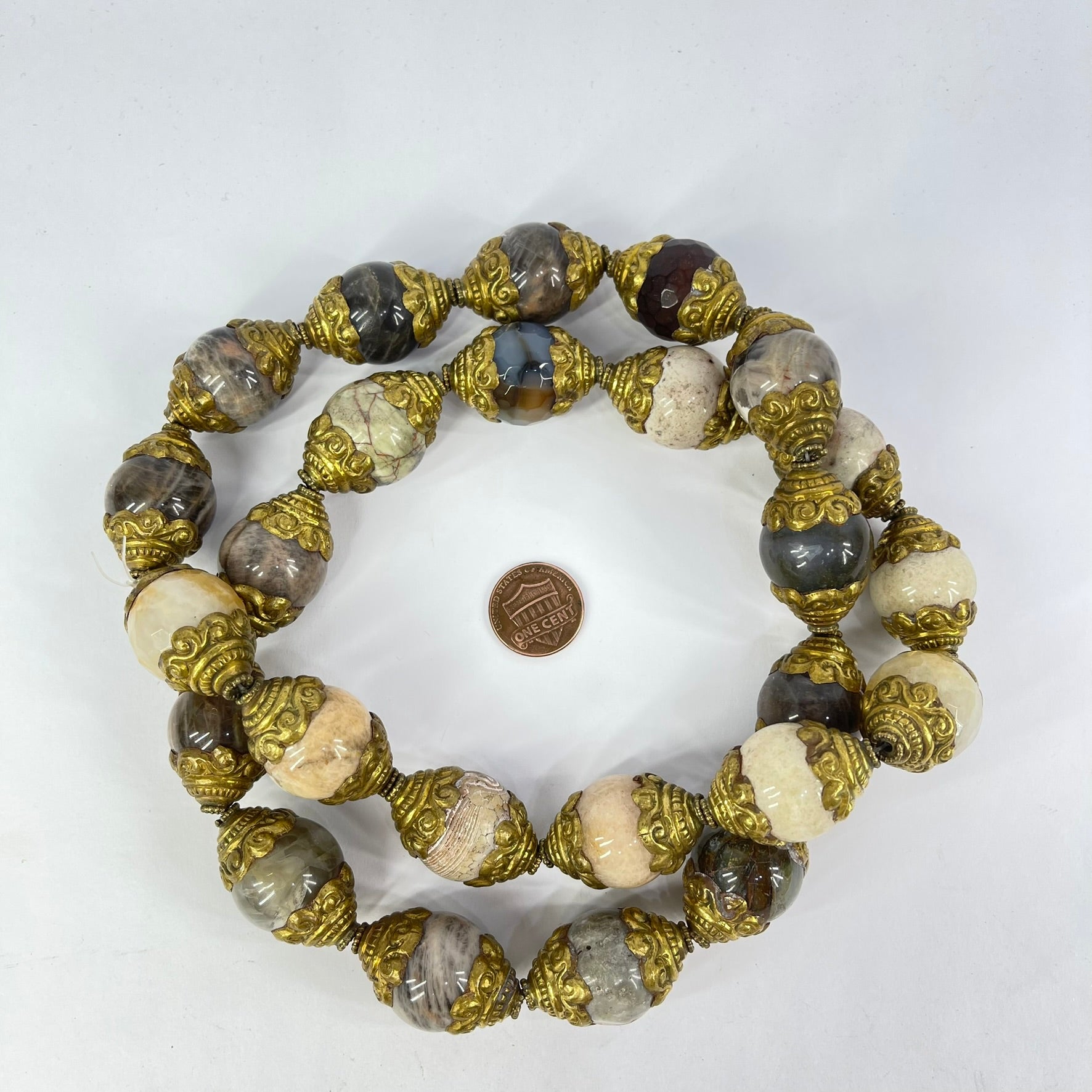 Tibetan Repoussé Brass Capped Stone Trade Beads 30inch