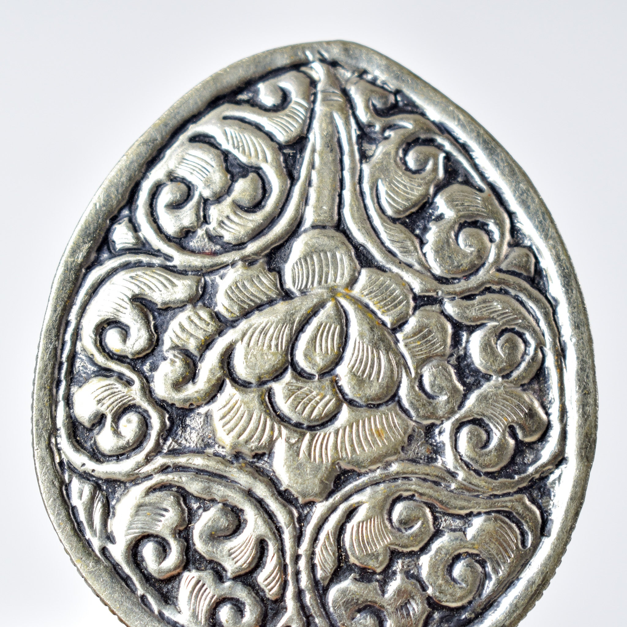 Repoussé is a method of embossing a metal sheet (silver, copper, brass) by punching and hammering a design from the back, then polishing it up in front with a chasing hammer, producing a three-dimensional bas-relief surface.