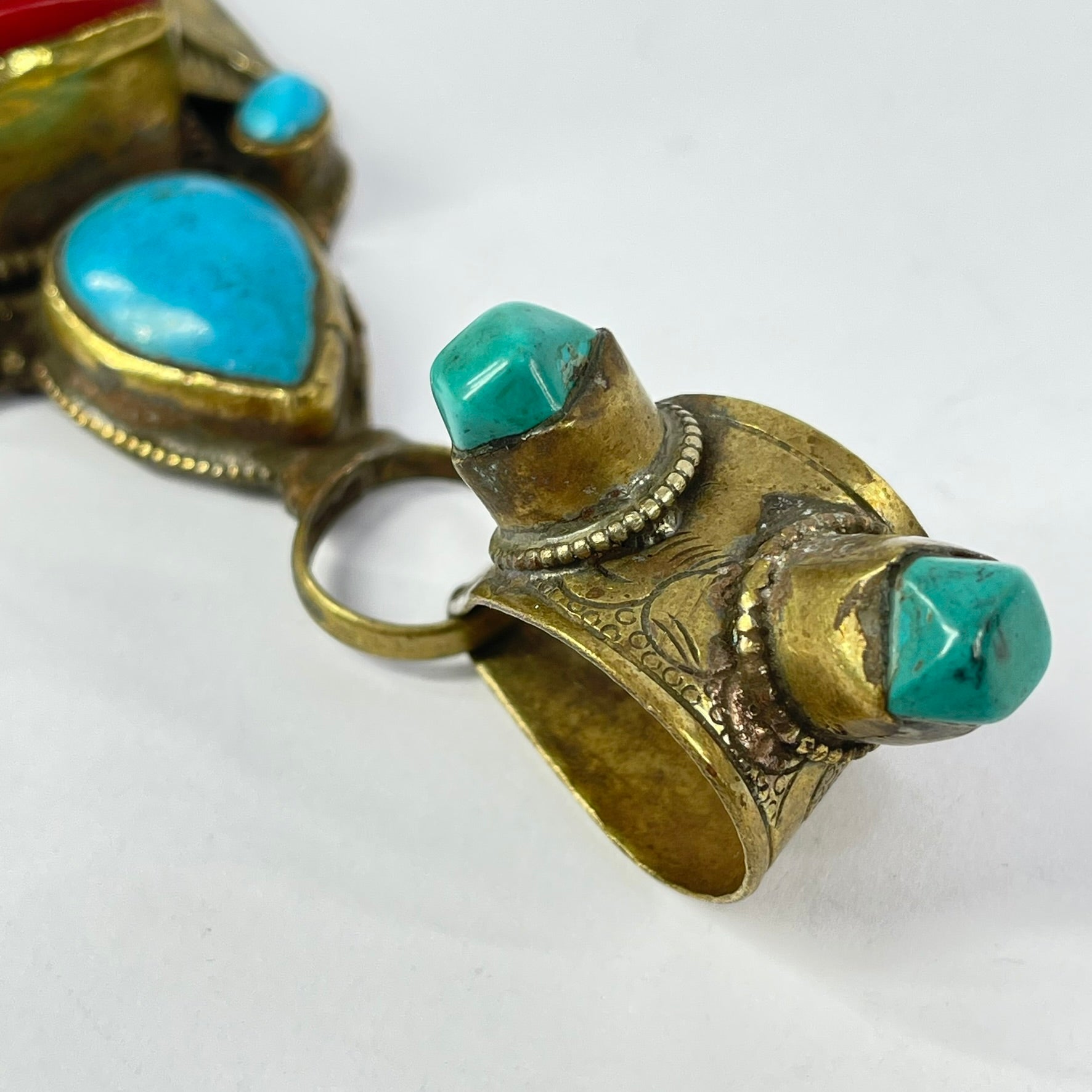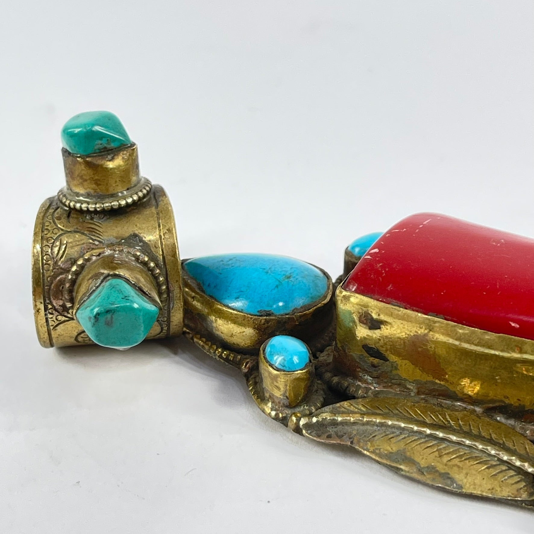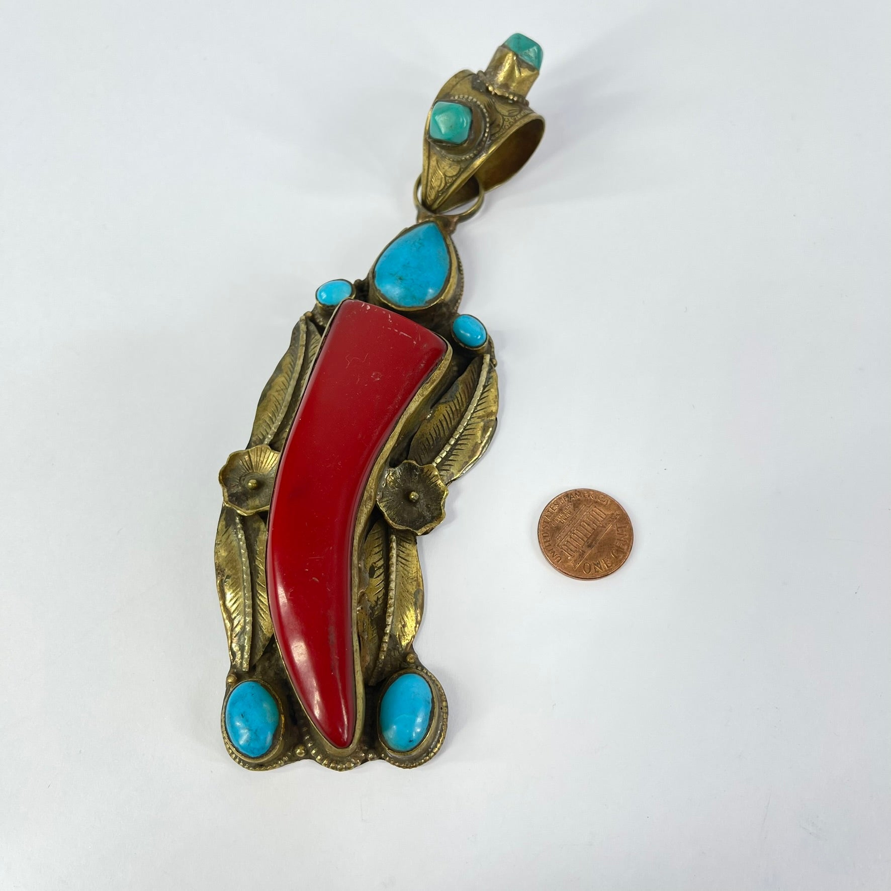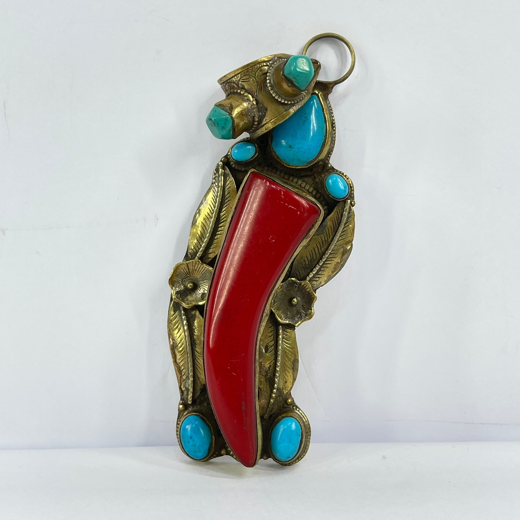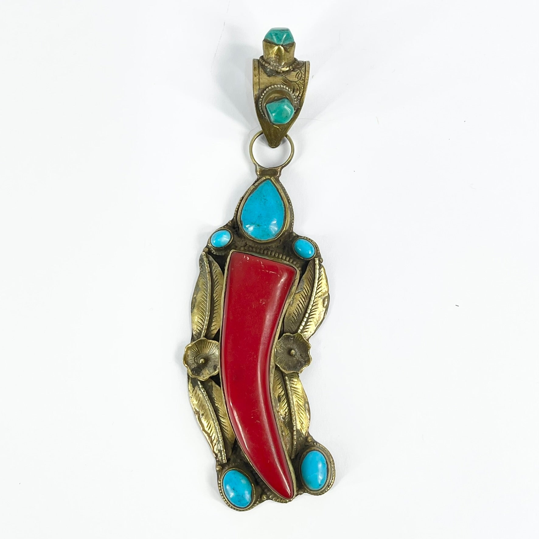 Tibetan Turquoise and Red Brass Repoussé Pendant