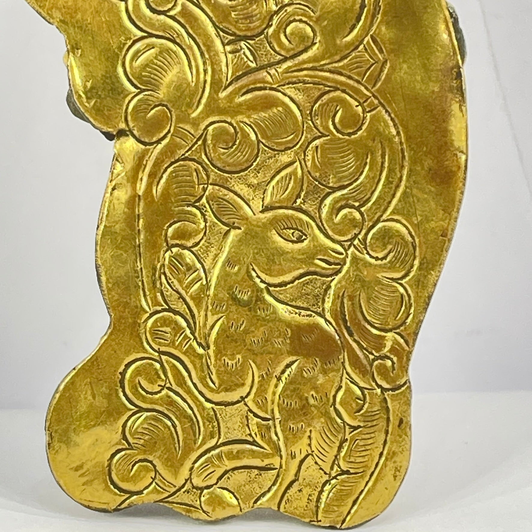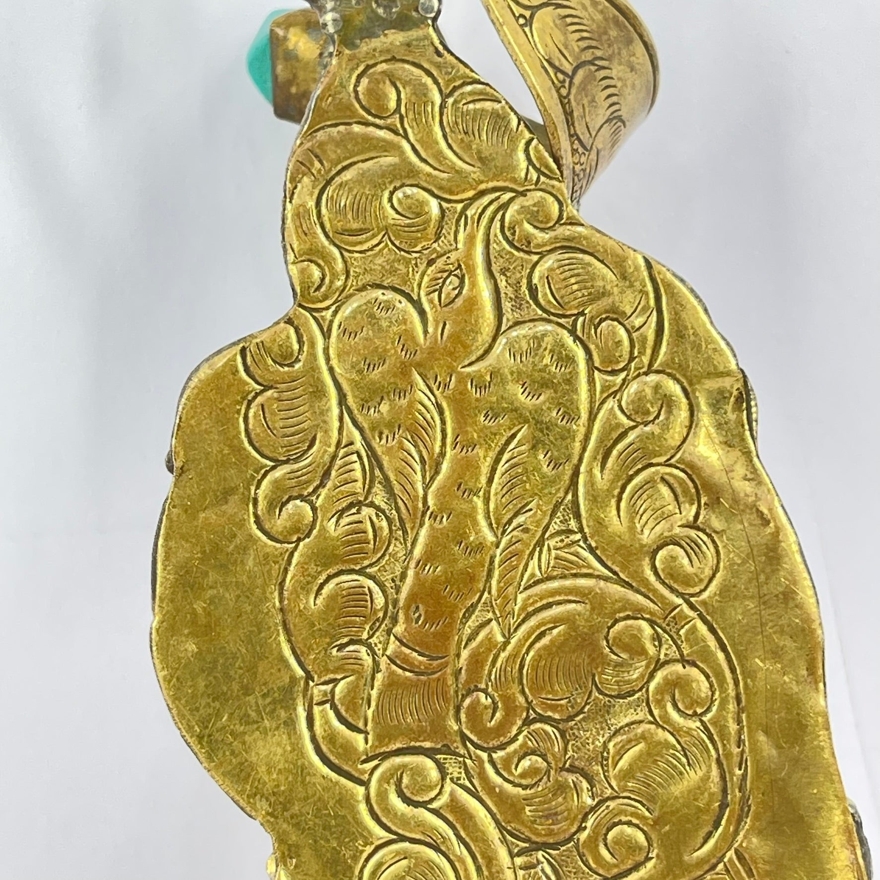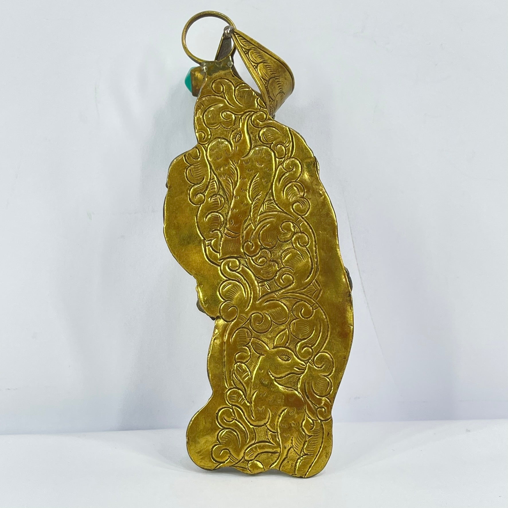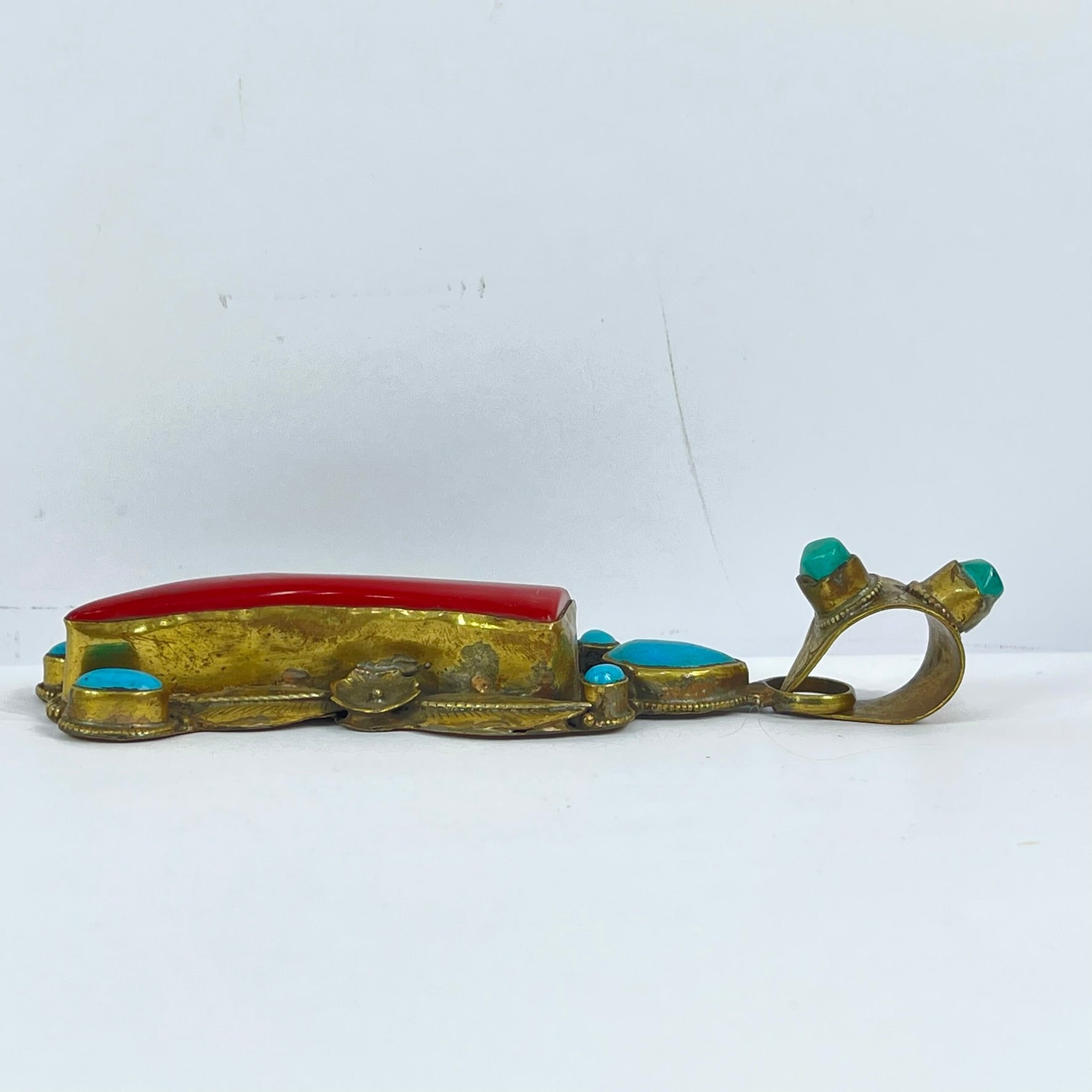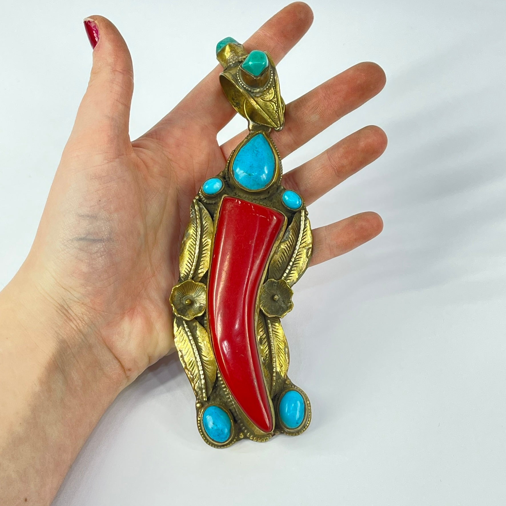Tibetan Turquoise and Red Brass Repoussé Pendant