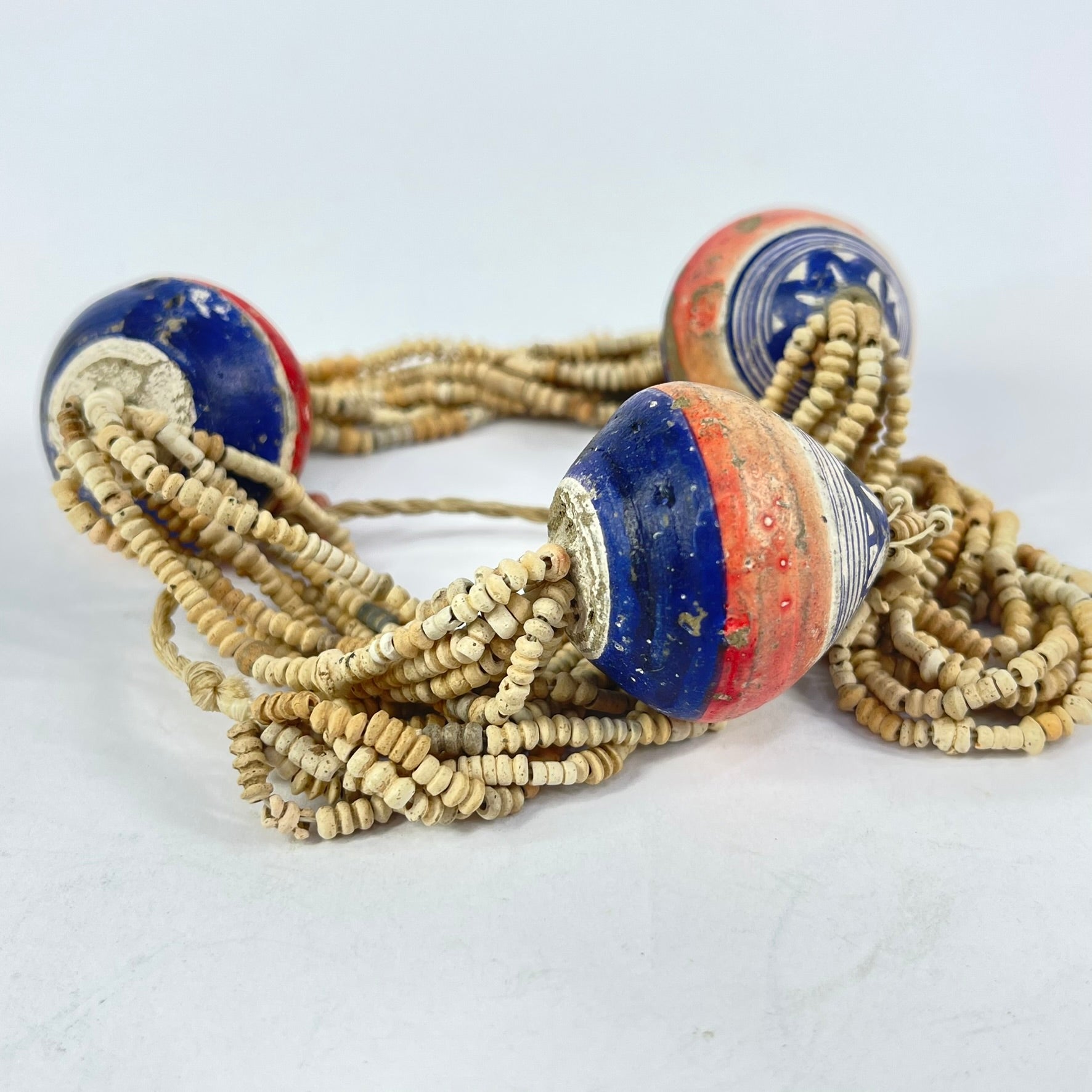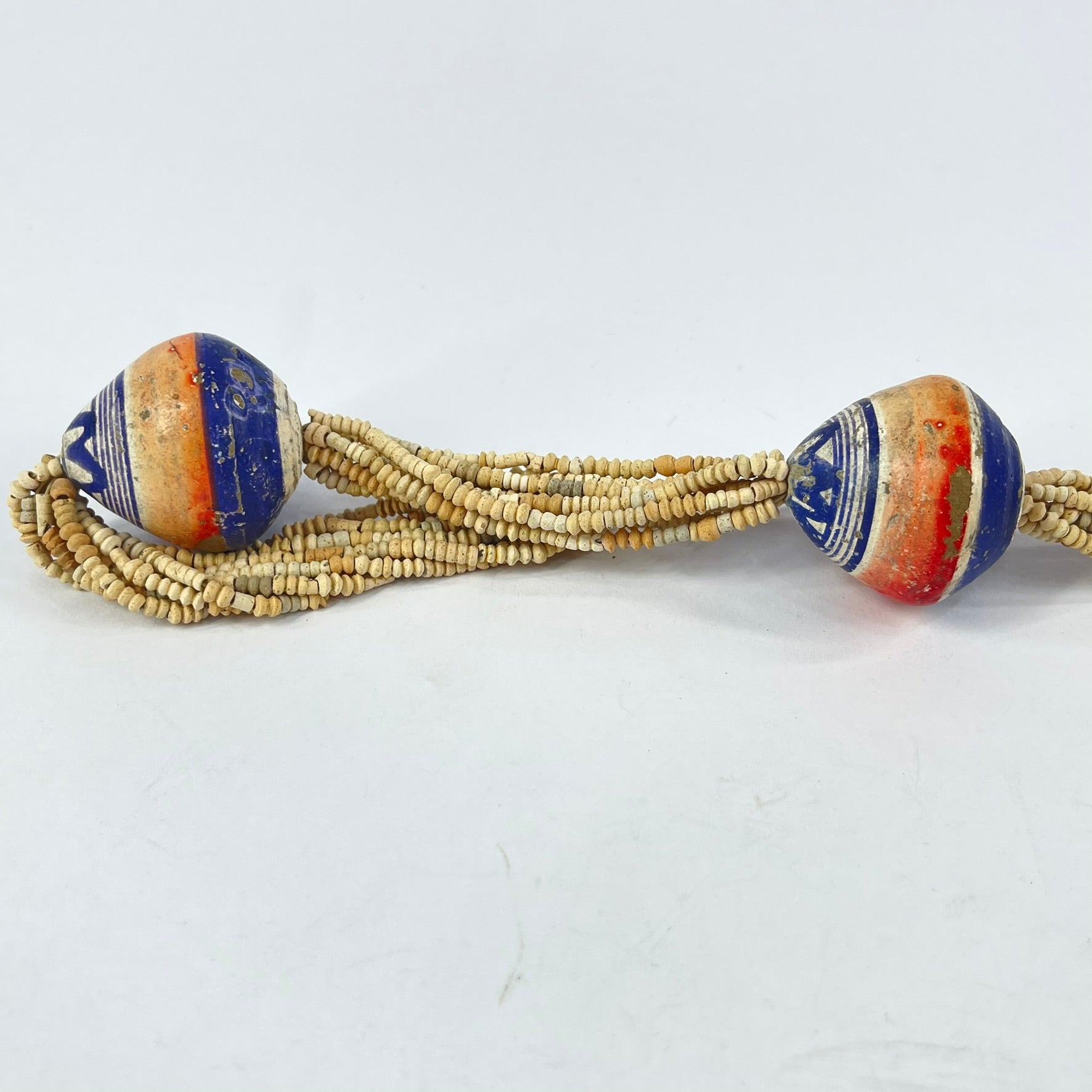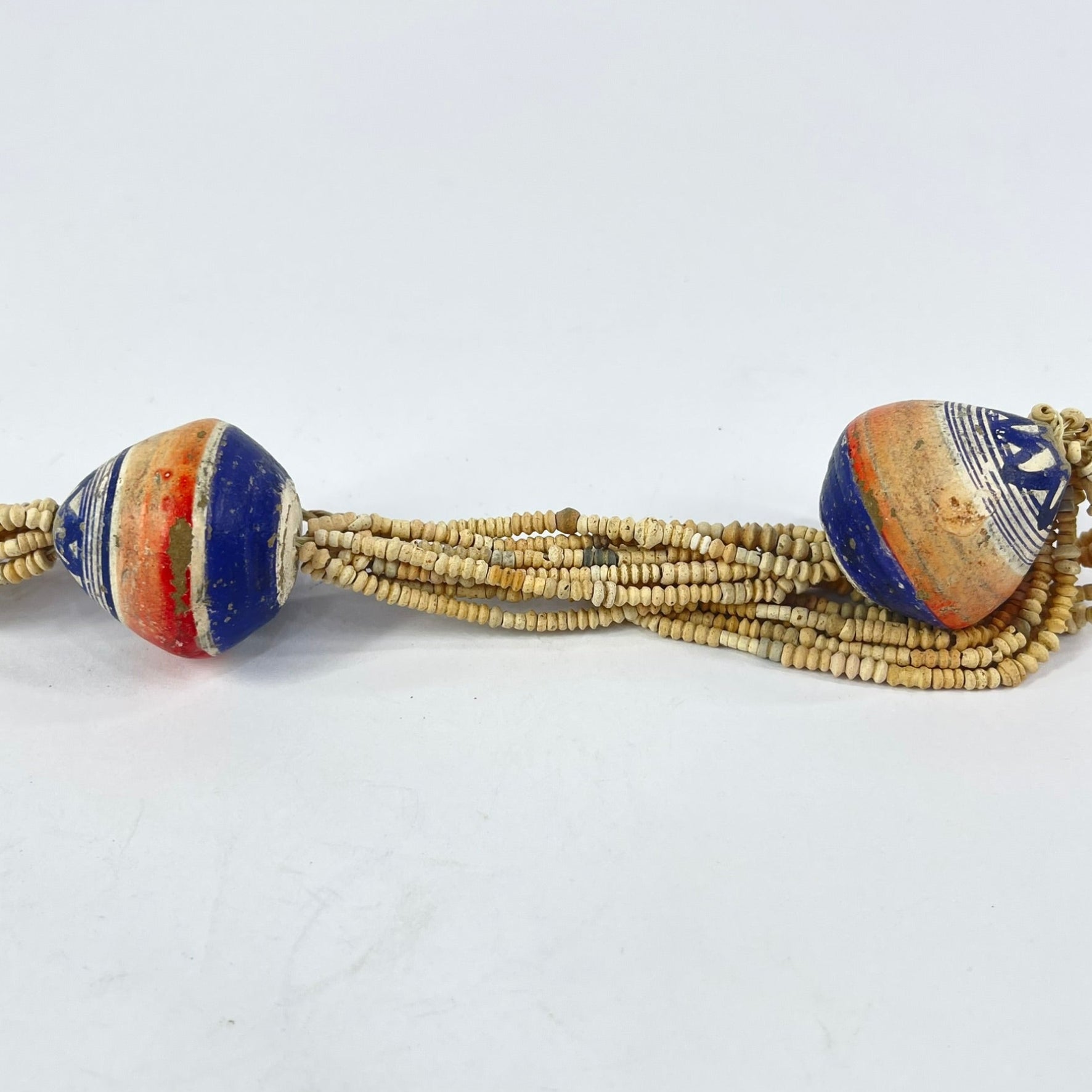 Painted Clay Beads: Hand-formed from local clay and decorated with simple linear or geometric motifs, these beads demonstrate regional craftsmanship using readily available materials. The painted surfaces — often in earthy reds, blacks, and whites — reflect aesthetic traditions seen across Mali’s historic communities. Their lightweight nature made them practical for everyday wear while still visually striking.