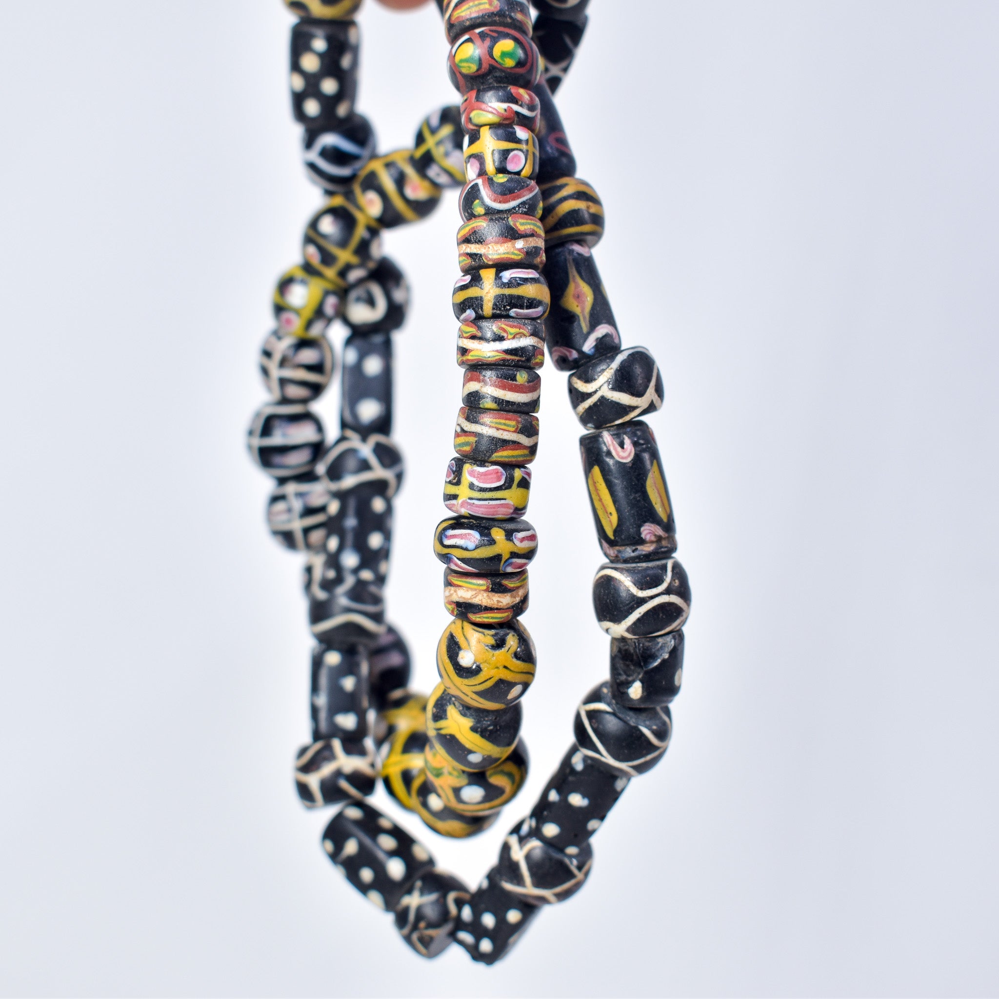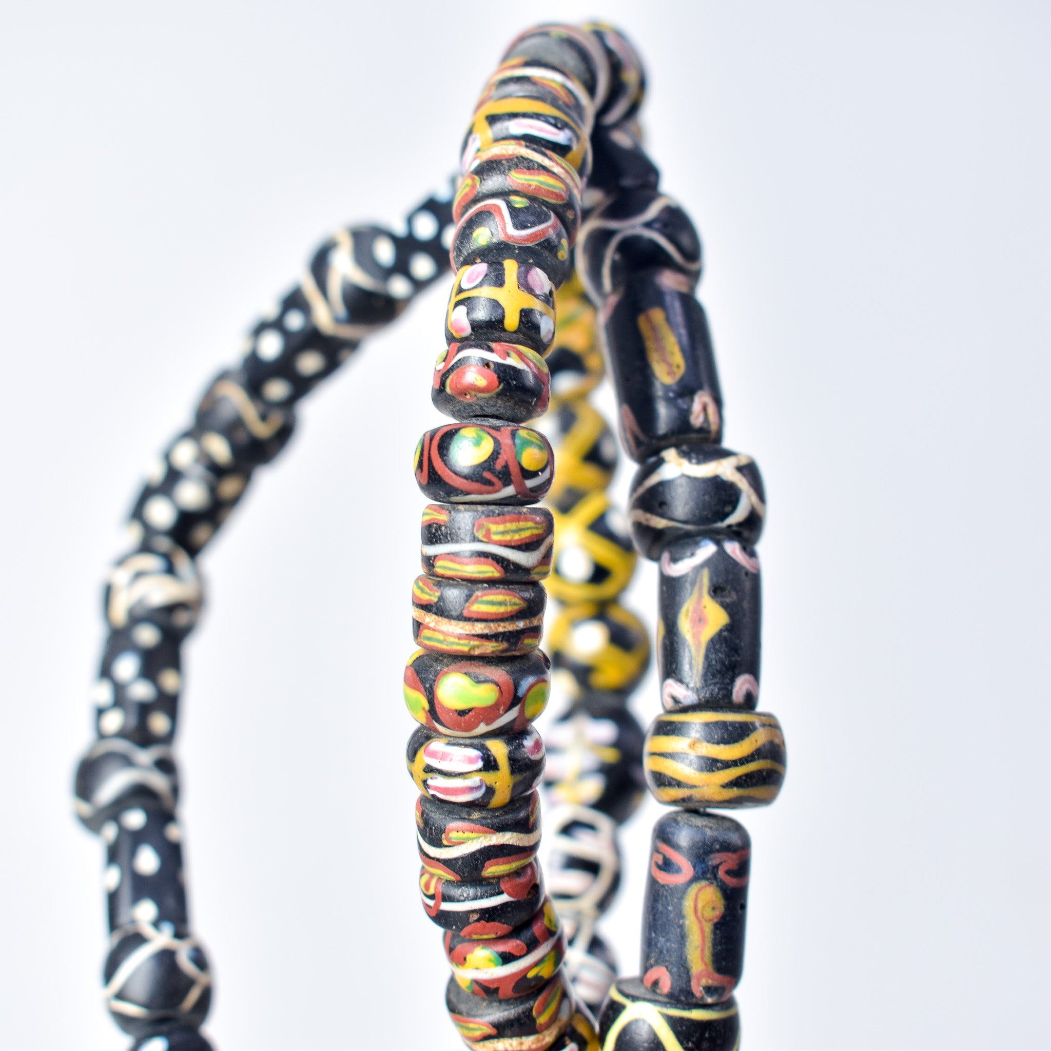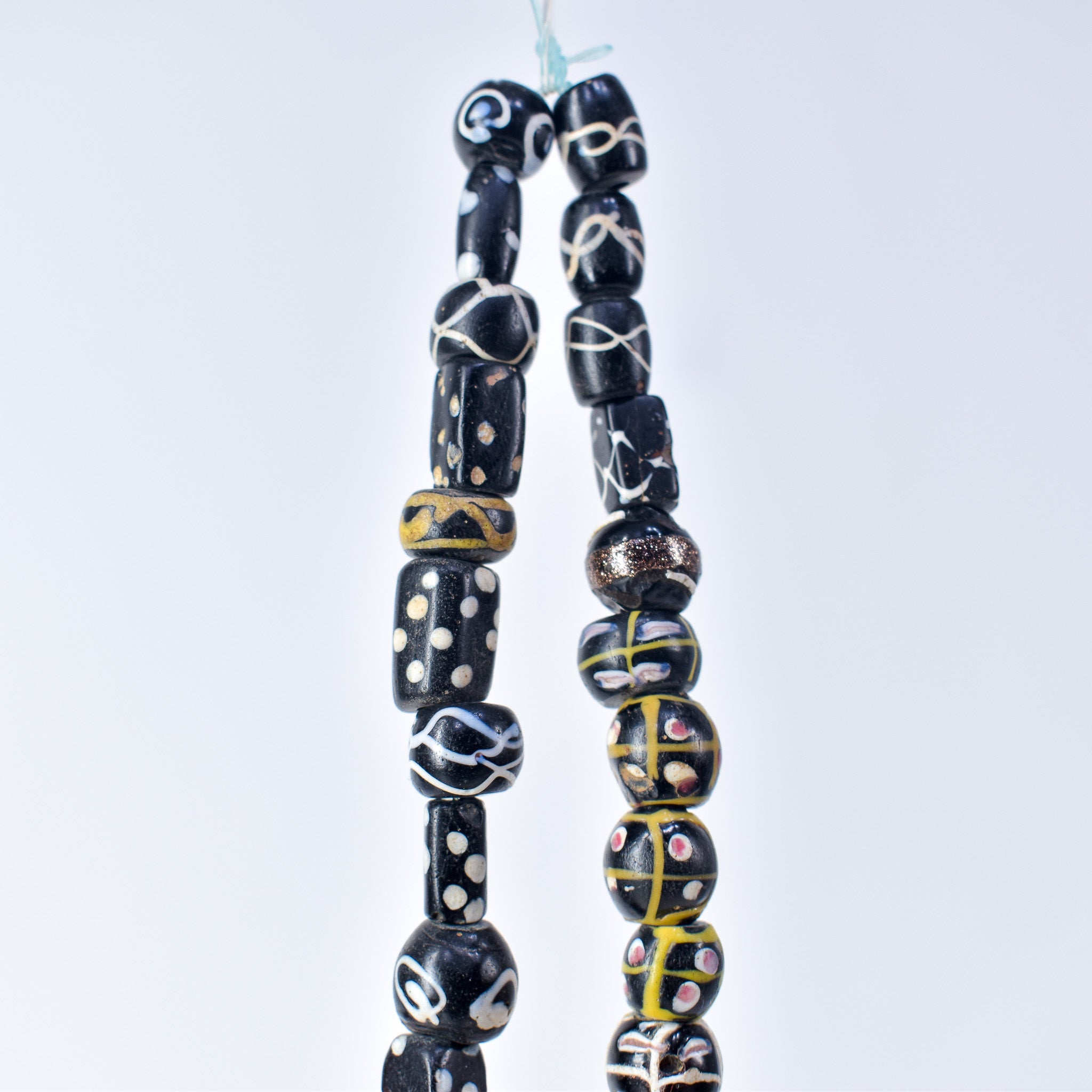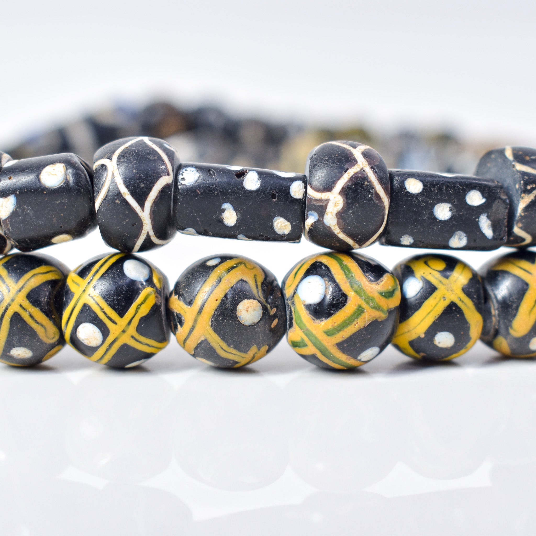 "Trade Beads" refer to beads primarily produced in Venice, Bohemia, and other European countries from the late 1400s to the early 1900s, traded in Africa and the Americas. The peak of this trade occurred from the mid-1800s to the early 1900s, with the Venetians dominating production. J.F. Sick and Co. and Moses Lewin Levin played significant roles as bead brokers/importers. The beads gained renewed popularity in the late 1960s when exported from Africa to the U.S. and Europe. The term "Trade Beads" became widely used, and they were also known as "Love Beads" during the Hippie era. As demand grew, specific names like "Russian Blues" and "Dutch Donuts" emerged, contributing to the beads' collectability. Today, these beads are highly sought after, with some styles becoming rarer as African traders venture deeper into the continent to find them.