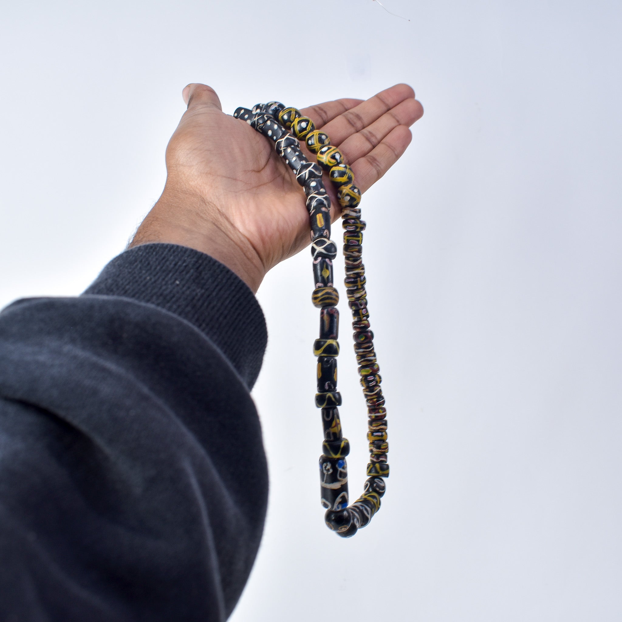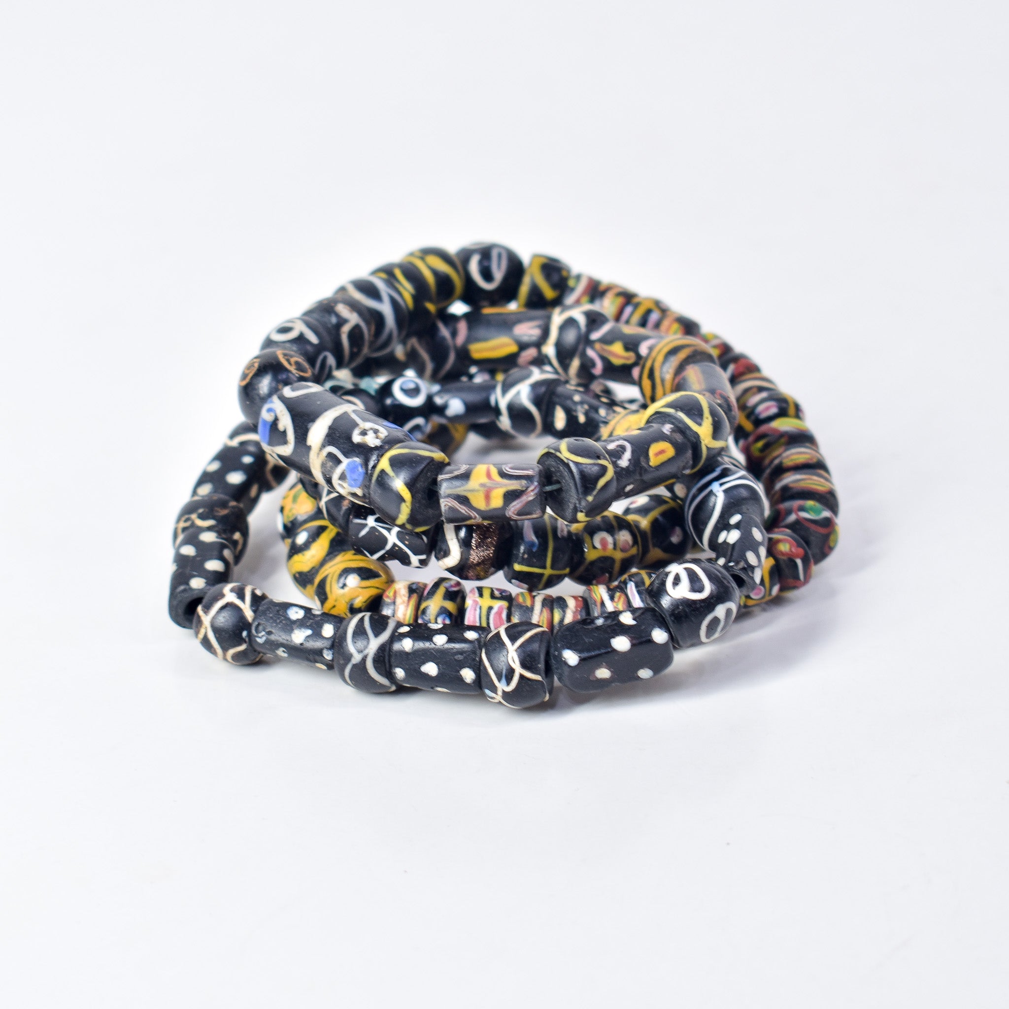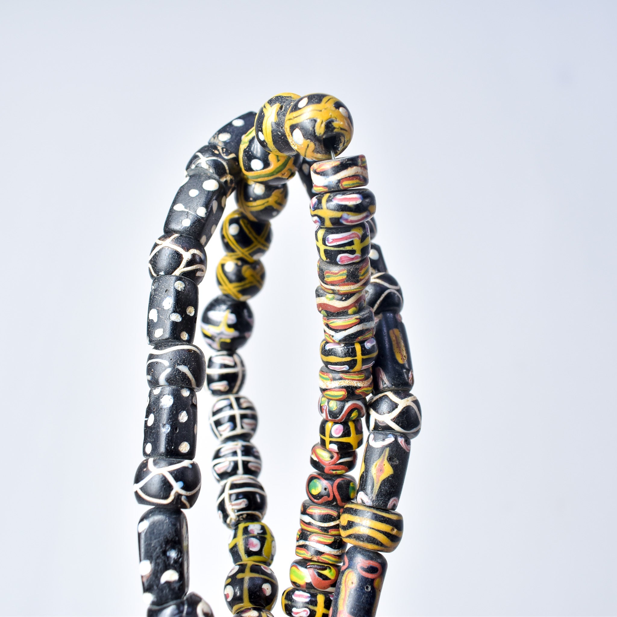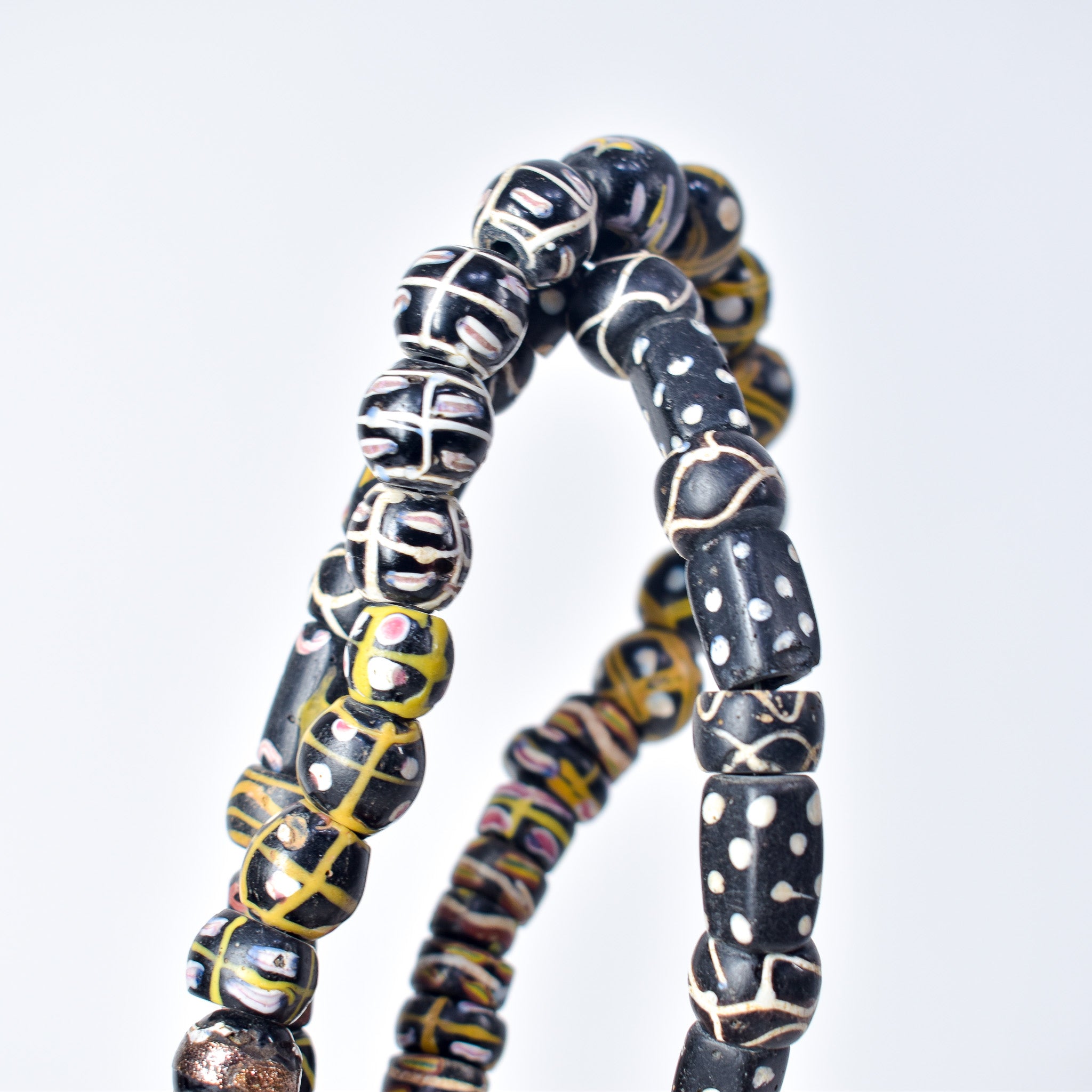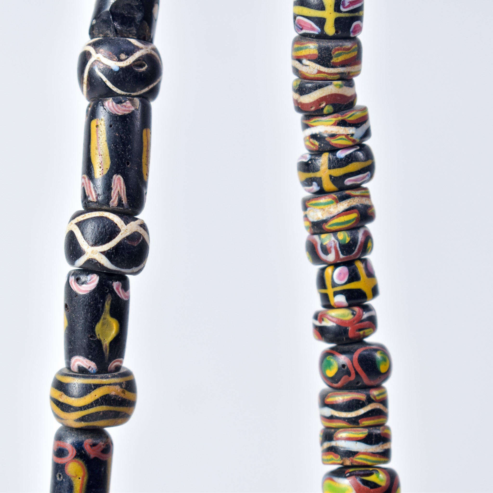 "Trade Beads" refer to beads primarily produced in Venice, Bohemia, and other European countries from the late 1400s to the early 1900s, traded in Africa and the Americas. The peak of this trade occurred from the mid-1800s to the early 1900s, with the Venetians dominating production. J.F. Sick and Co. and Moses Lewin Levin played significant roles as bead brokers/importers. The beads gained renewed popularity in the late 1960s when exported from Africa to the U.S. and Europe. The term "Trade Beads" became widely used, and they were also known as "Love Beads" during the Hippie era. As demand grew, specific names like "Russian Blues" and "Dutch Donuts" emerged, contributing to the beads' collectability. Today, these beads are highly sought after, with some styles becoming rarer as African traders venture deeper into the continent to find them.