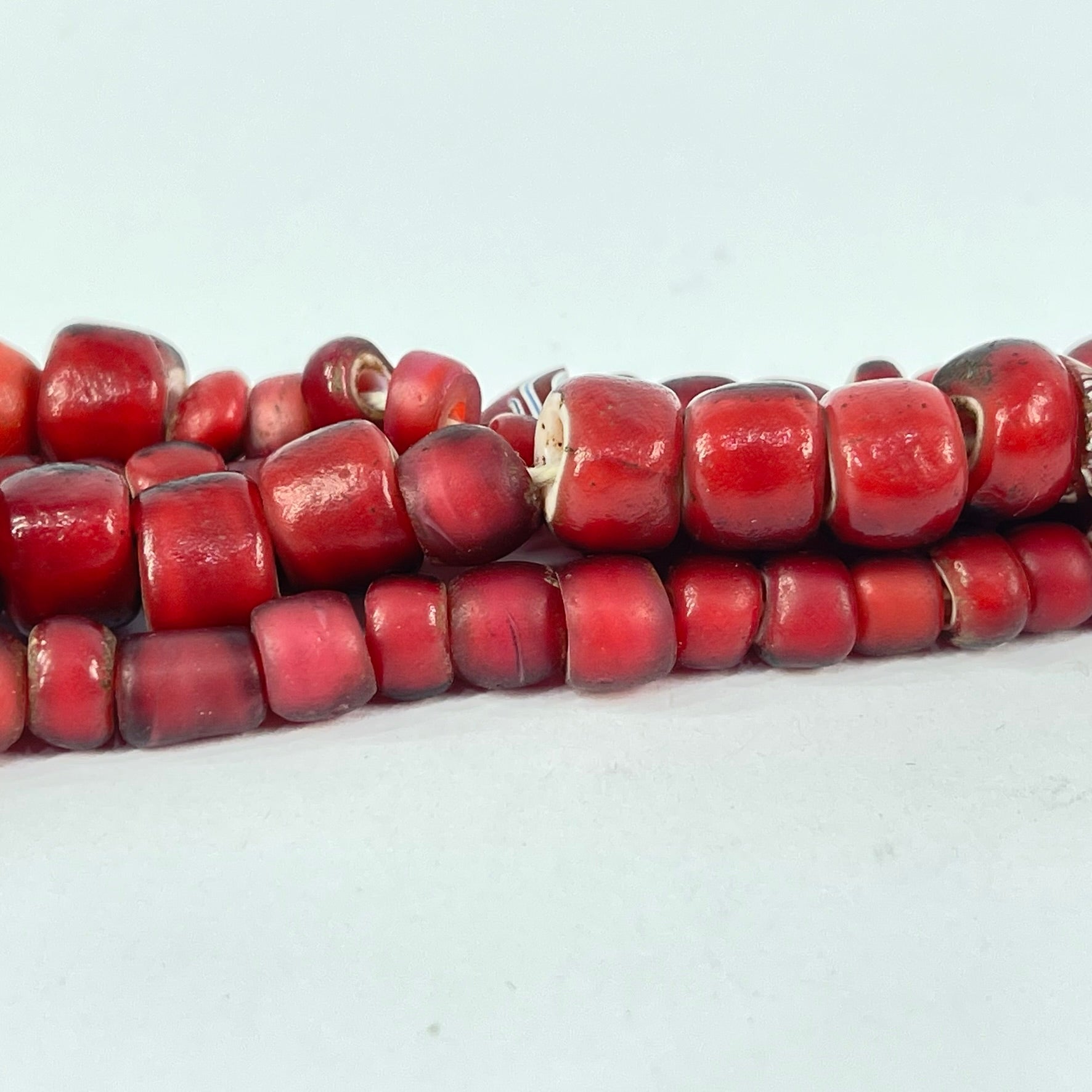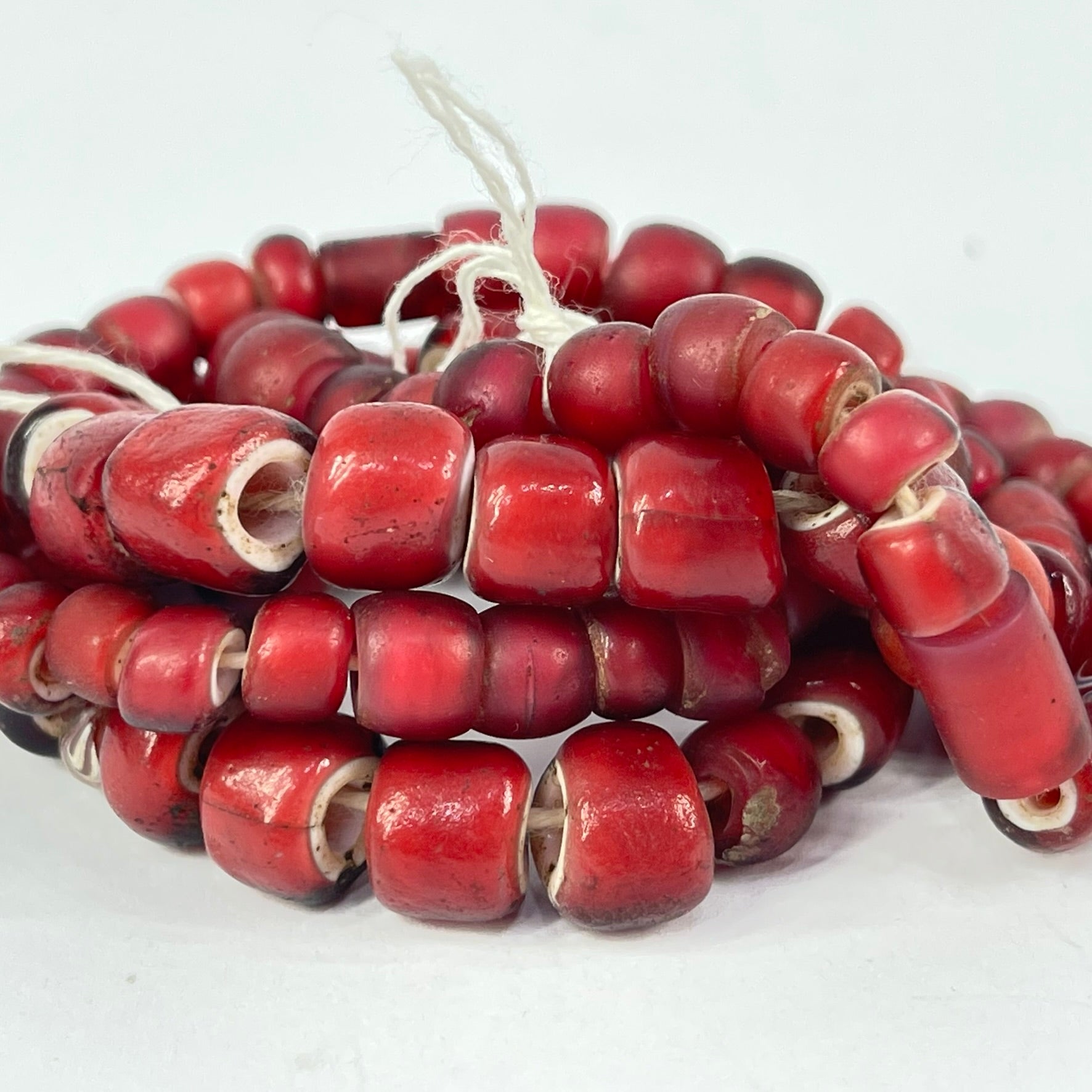 They have an off-white or light yellow core covered by a layer of scarlet, orange, or dark red glass. Historical evidence suggests that the vivid red color of some White Heart Beads was achieved by adding gold oxide to the glass.