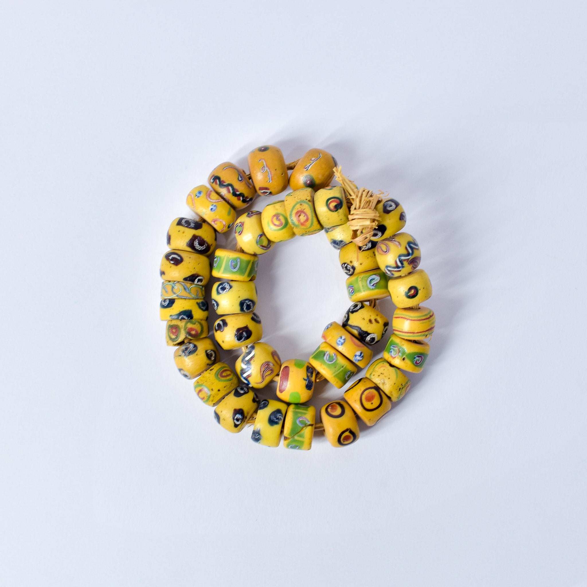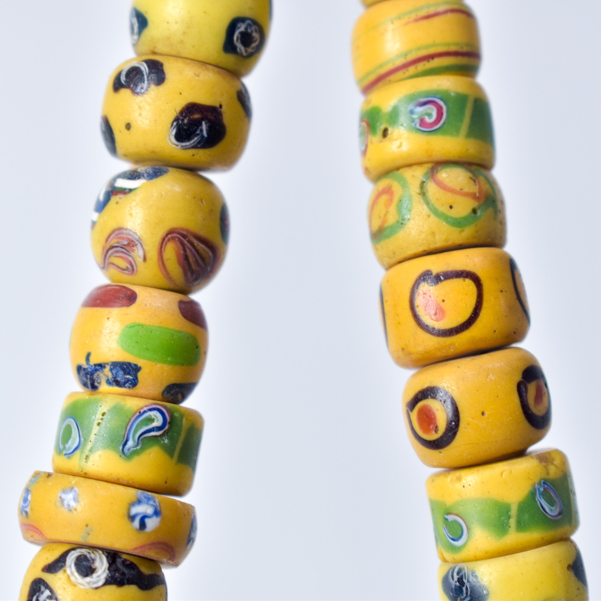 A strand of mixed yellow Venetian trade beads is a fascinating collection of diverse shapes and patterns, each bead telling a unique story of craftsmanship and trade. Crafted in Venice, Italy, these beads showcase the mastery of Venetian glass artisans, who skillfully combined vibrant hues and intricate designs to create stunning works of art. From bold stripes to delicate millefiori patterns, each bead reflects the cultural exchanges and global trade networks that shaped the world's history. These beads were not only prized for their beauty but also served as valuable commodities, exchanged across continents and cultures. A strand of mixed Venetian trade beads is not just a piece of jewelry; it's a tangible link to the rich tapestry of human interaction and creativity that spans centuries.