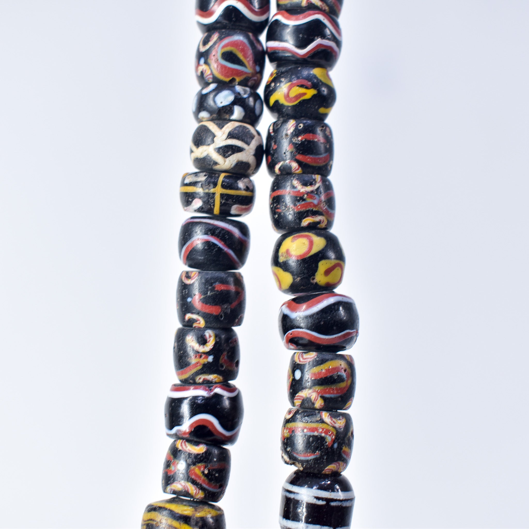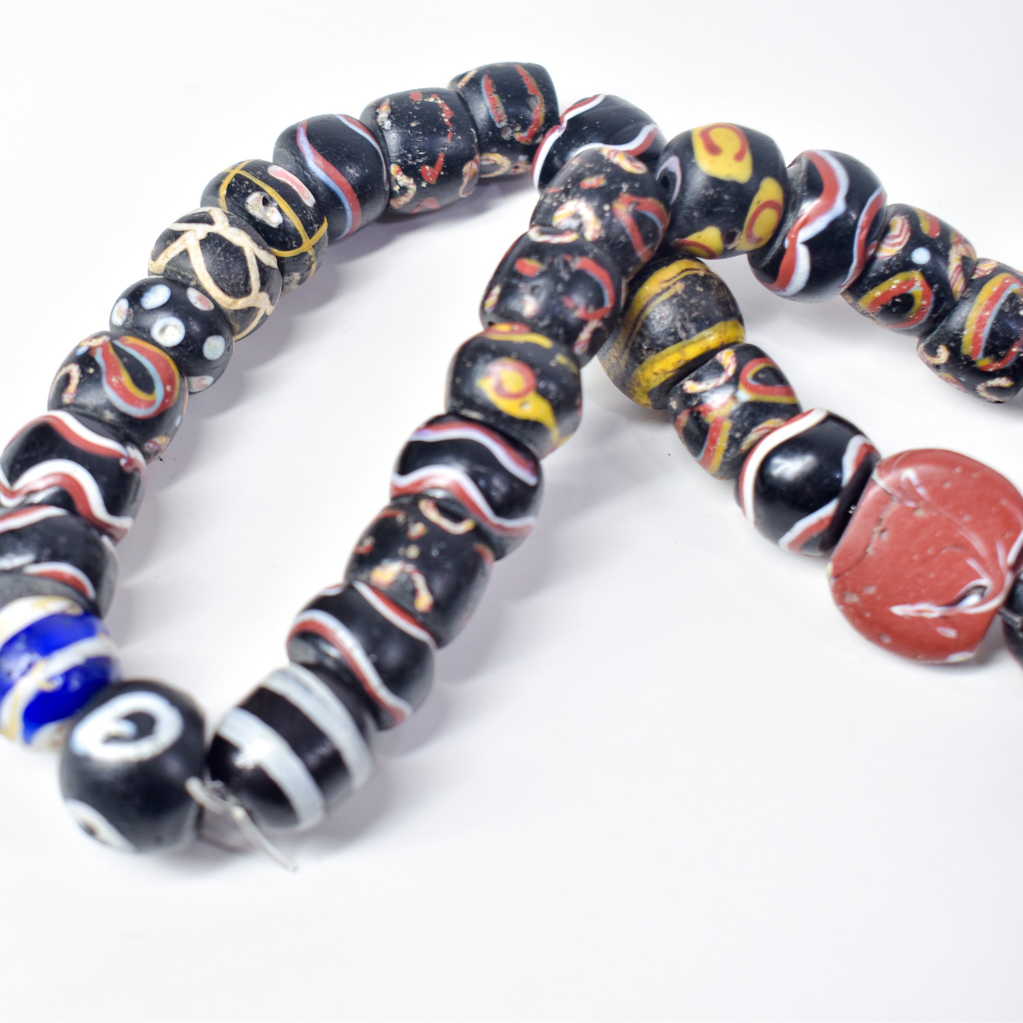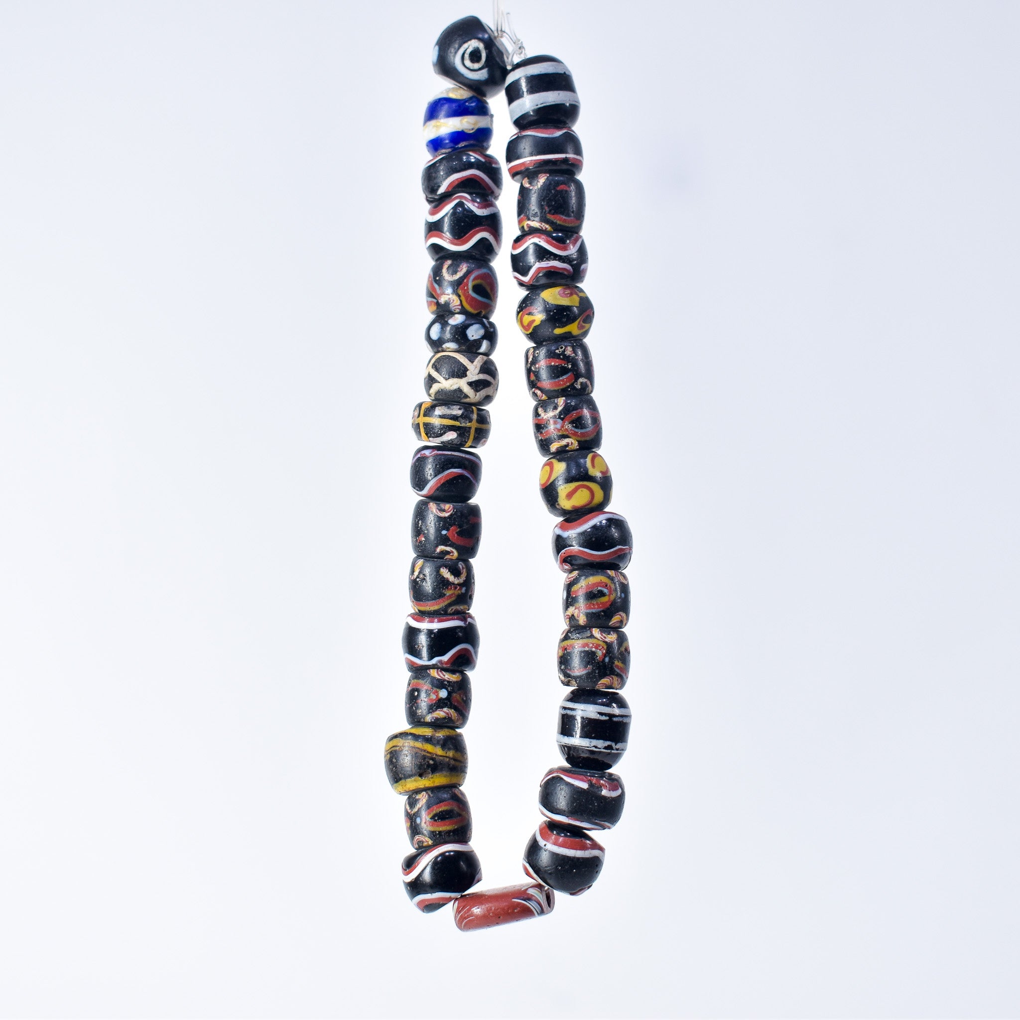 Fun mix of black, burgandy and white Venetian trade beads. Comes with all beads pictured. Strung to keep them together.