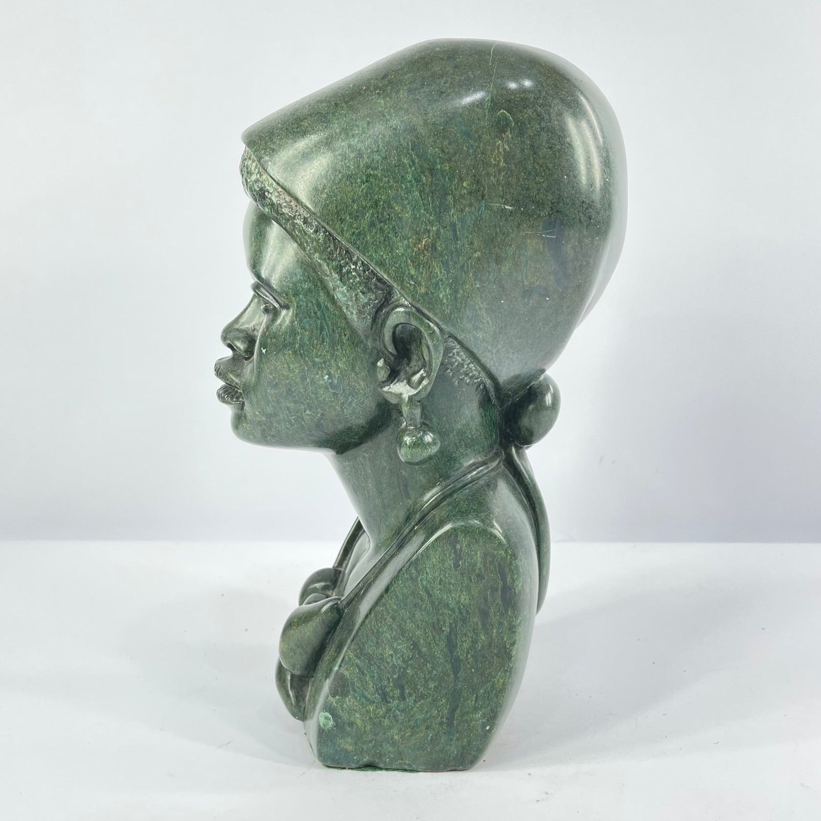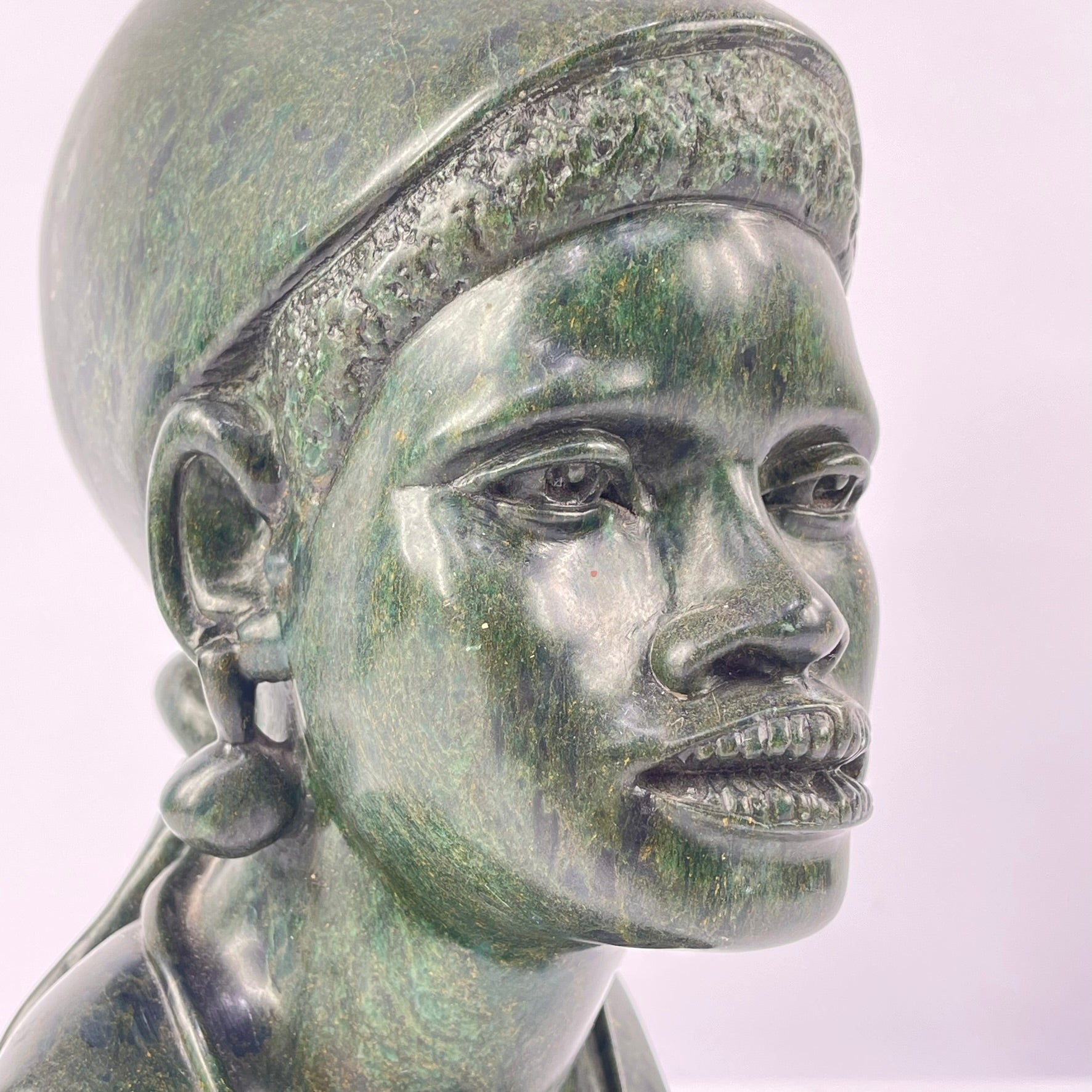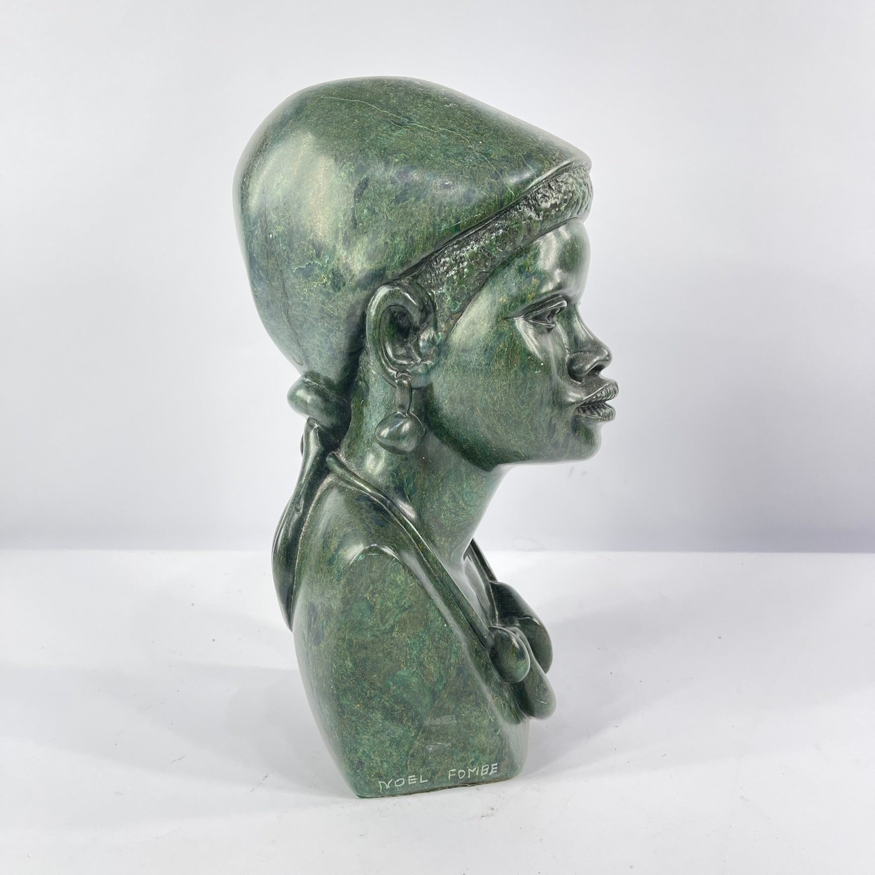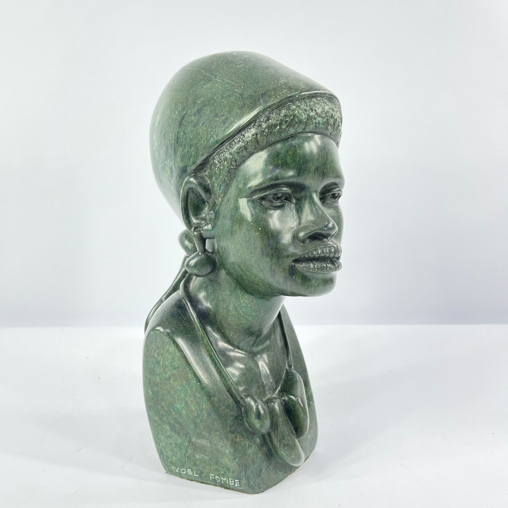 This hand-carved stone bust by Noel Fombe depicts a woman adorned with traditional jewelry and a head covering, rendered with smooth polished surfaces and expressive detail. Sculpted from rich green stone and signed by the artist, the piece reflects the beauty and strength often celebrated in African portrait sculpture. Fombe’s work is associated with the renowned stone carving traditions of Zimbabwe. A striking decorative sculpture and a distinctive addition to any collection of African art.