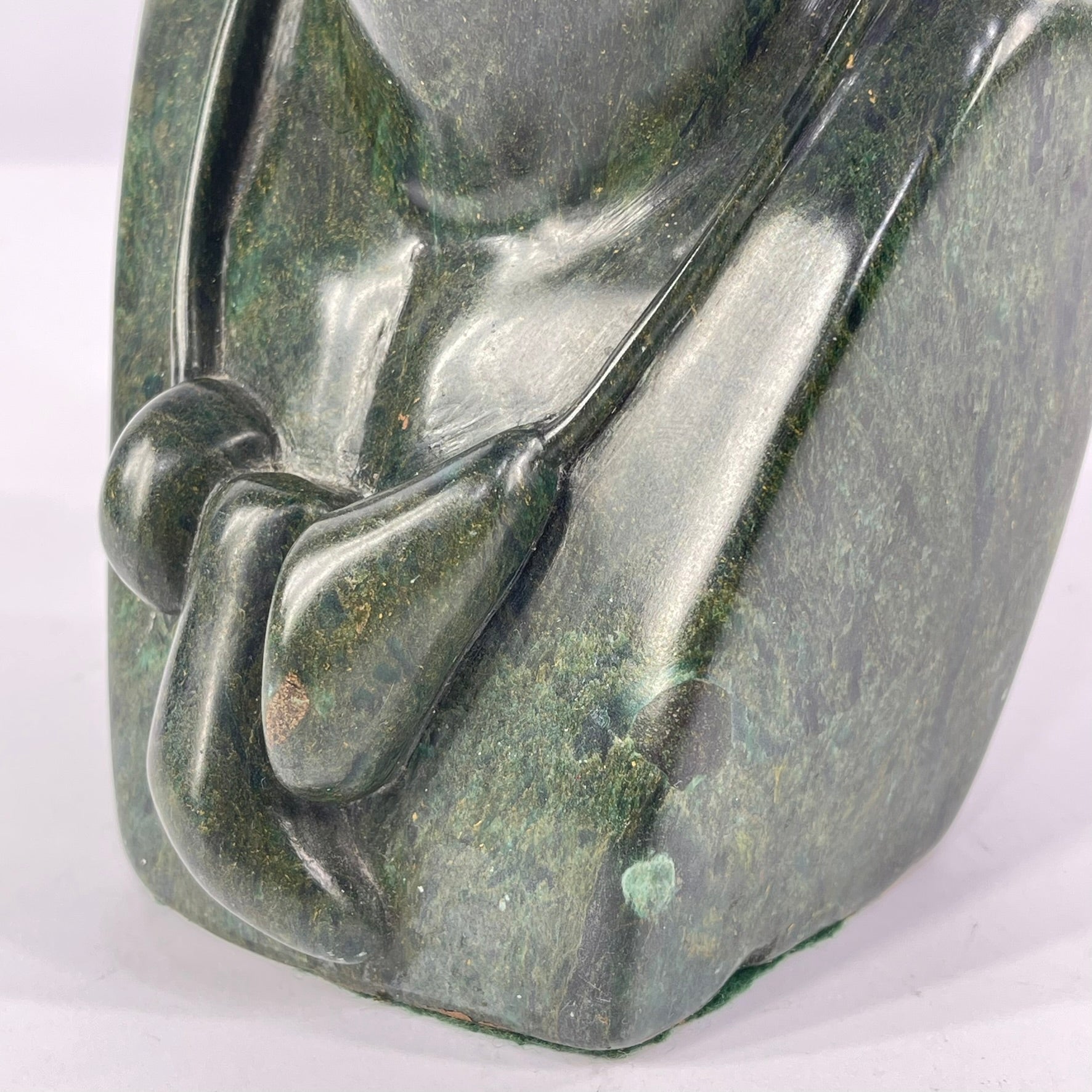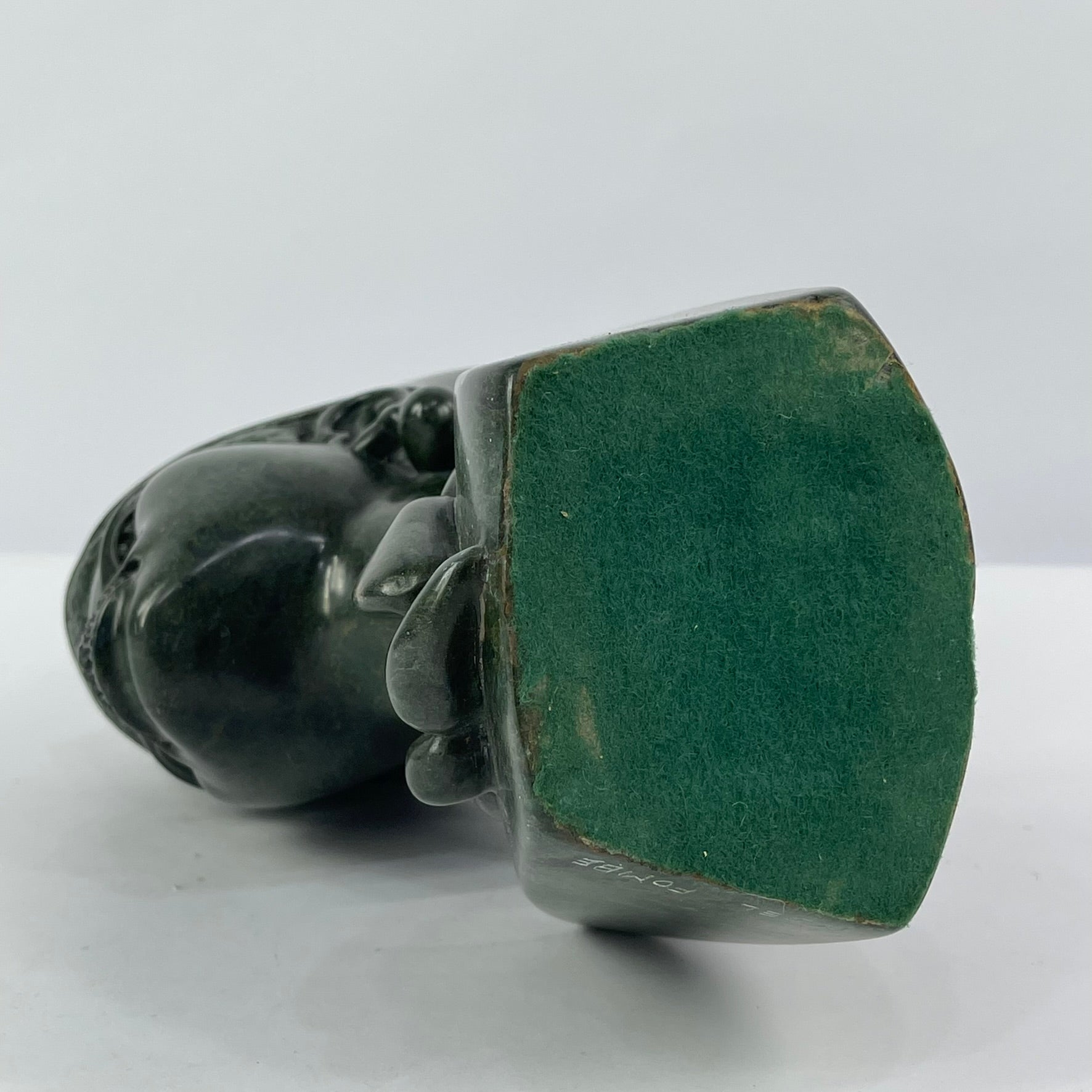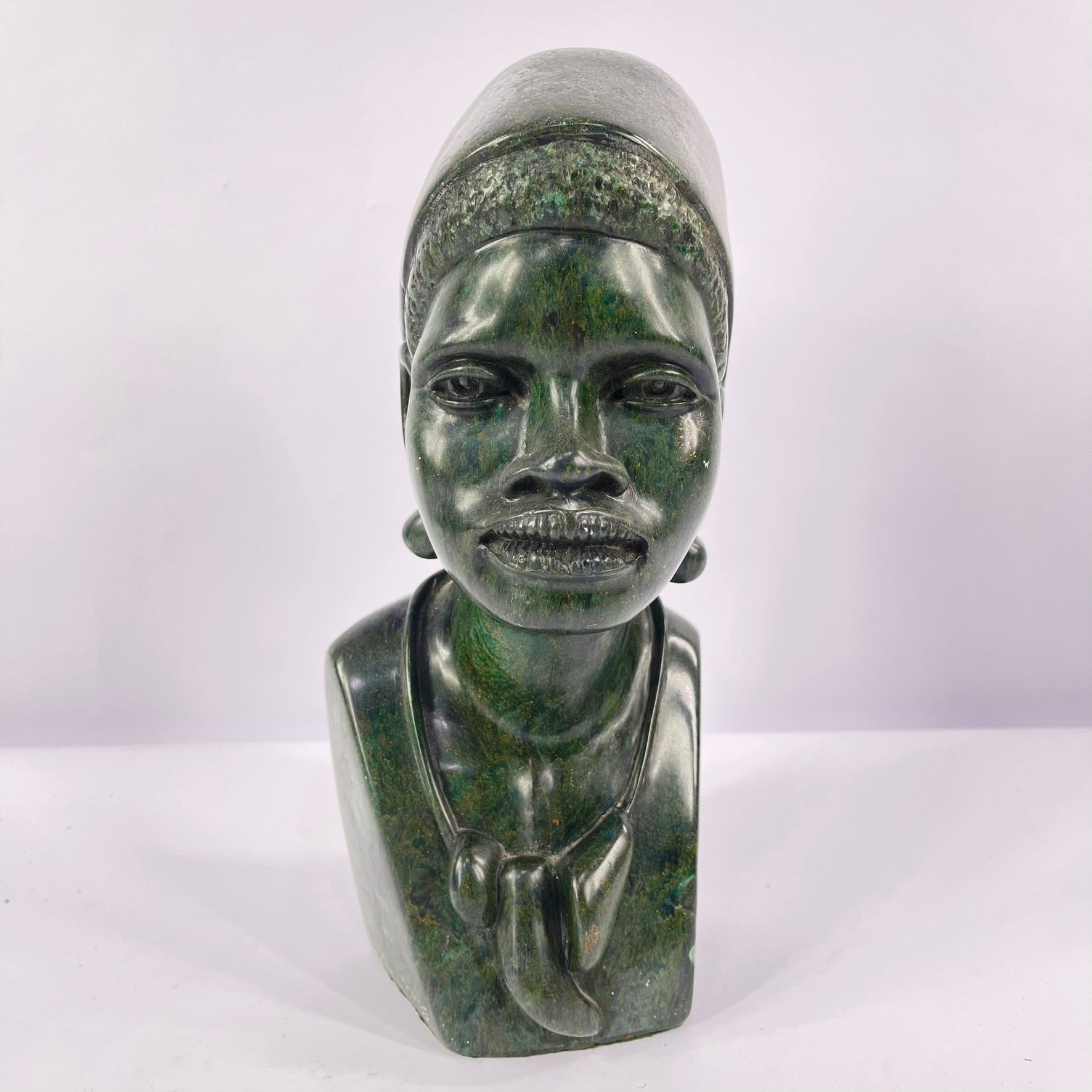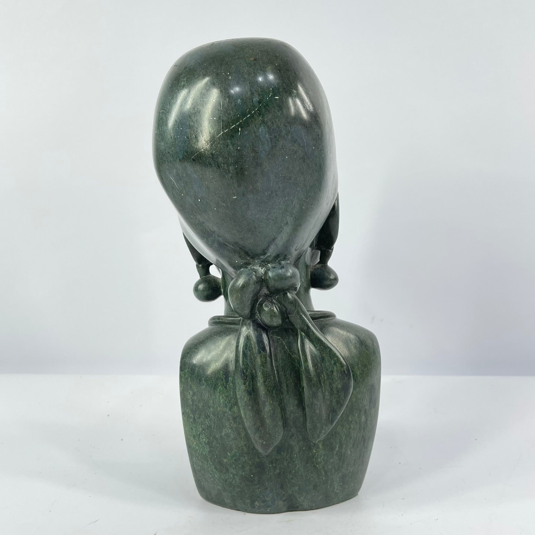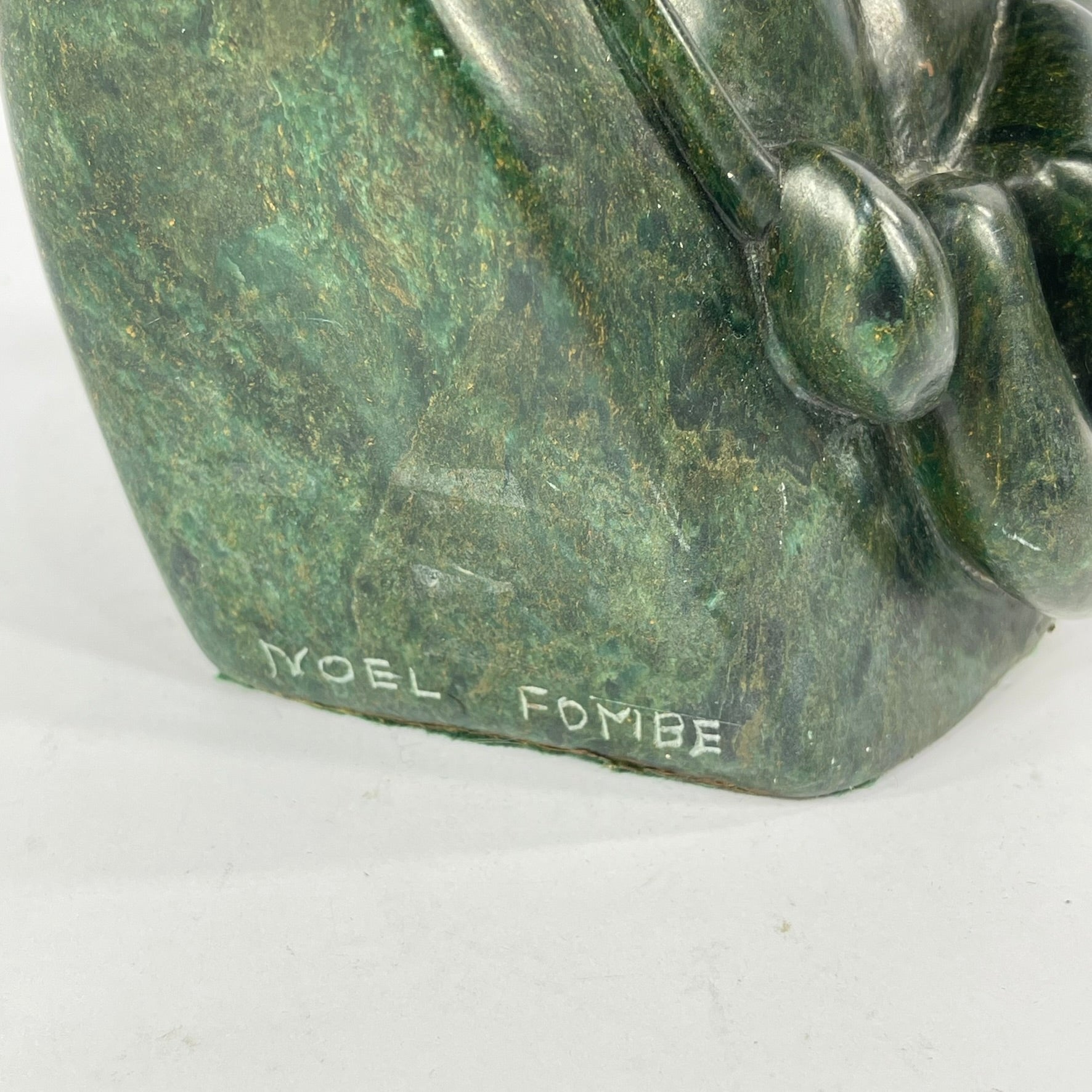 This hand-carved stone bust by Noel Fombe depicts a woman adorned with traditional jewelry and a head covering, rendered with smooth polished surfaces and expressive detail. Sculpted from rich green stone and signed by the artist, the piece reflects the beauty and strength often celebrated in African portrait sculpture. Fombe’s work is associated with the renowned stone carving traditions of Zimbabwe. A striking decorative sculpture and a distinctive addition to any collection of African art.