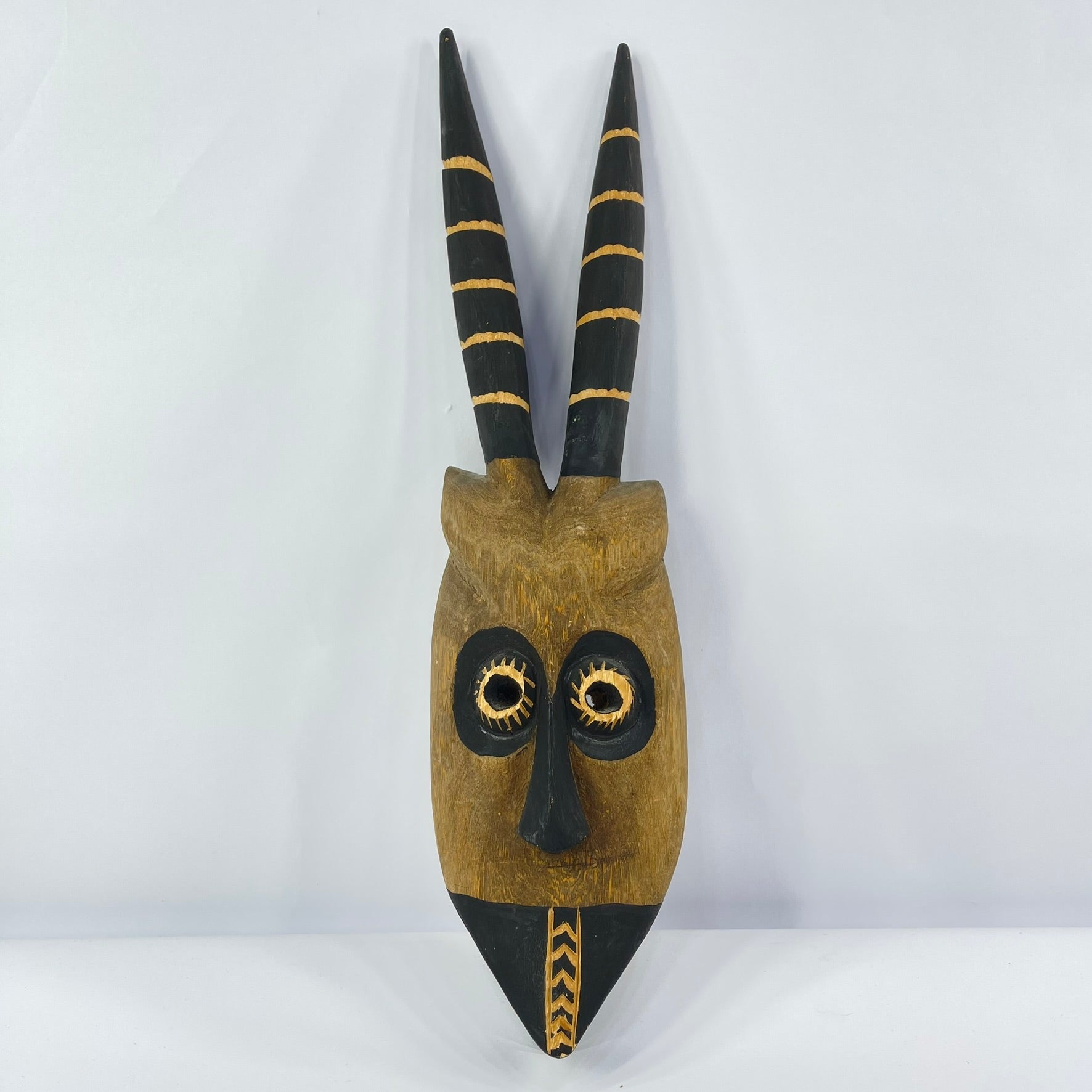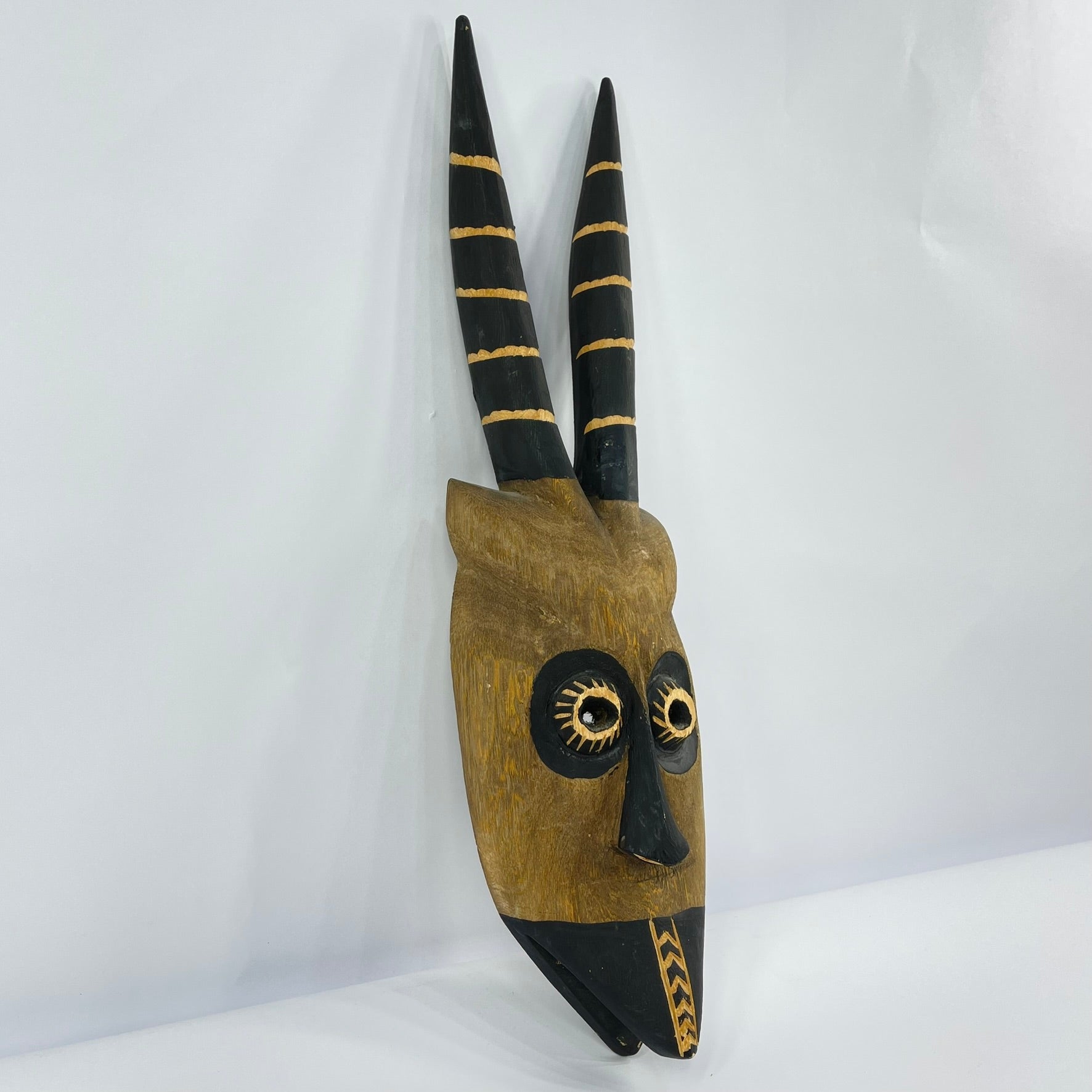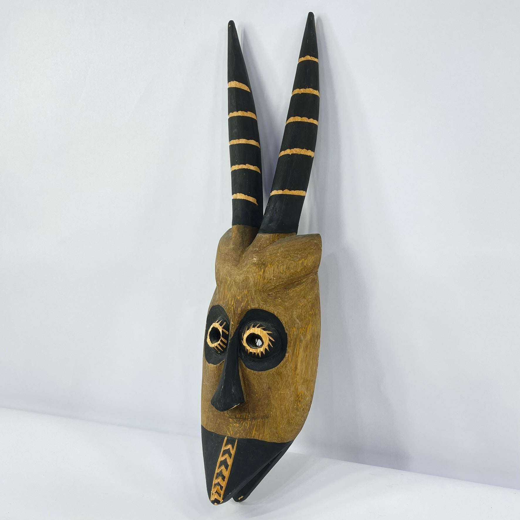 A carved wooden Wilu (Walu) antelope mask, inspired by ceremonial masks of the Dogon people of Mali.