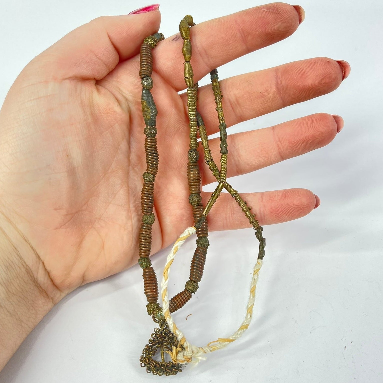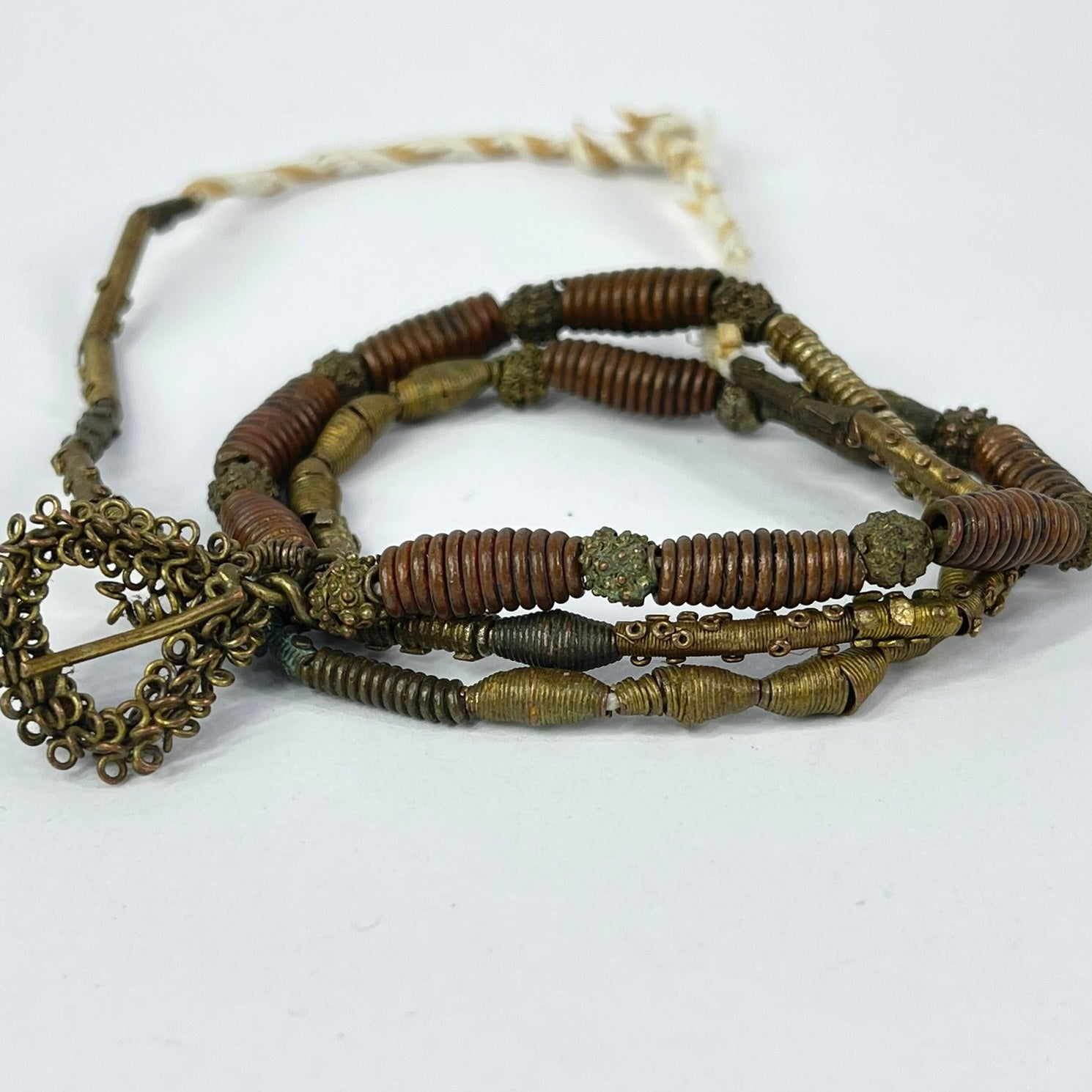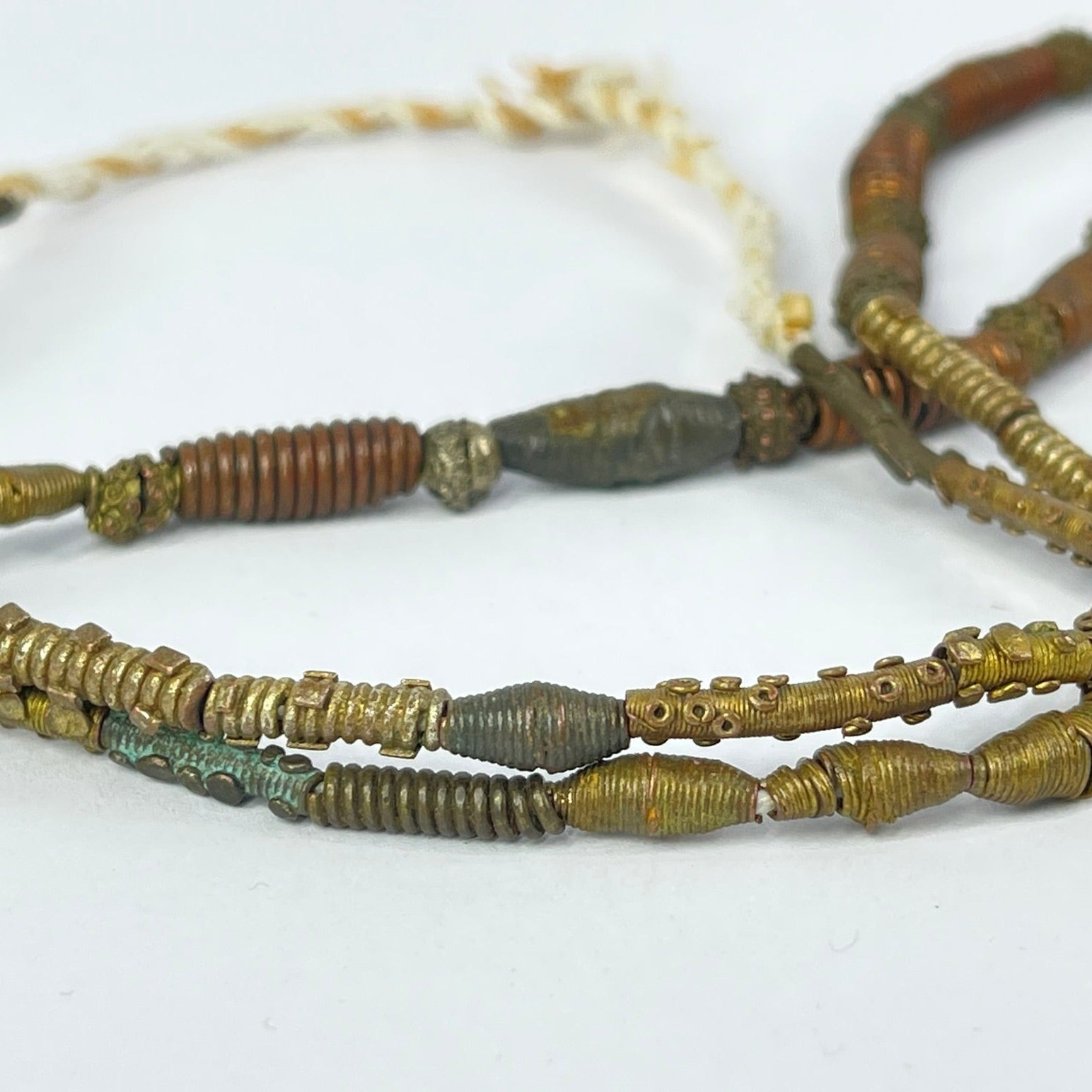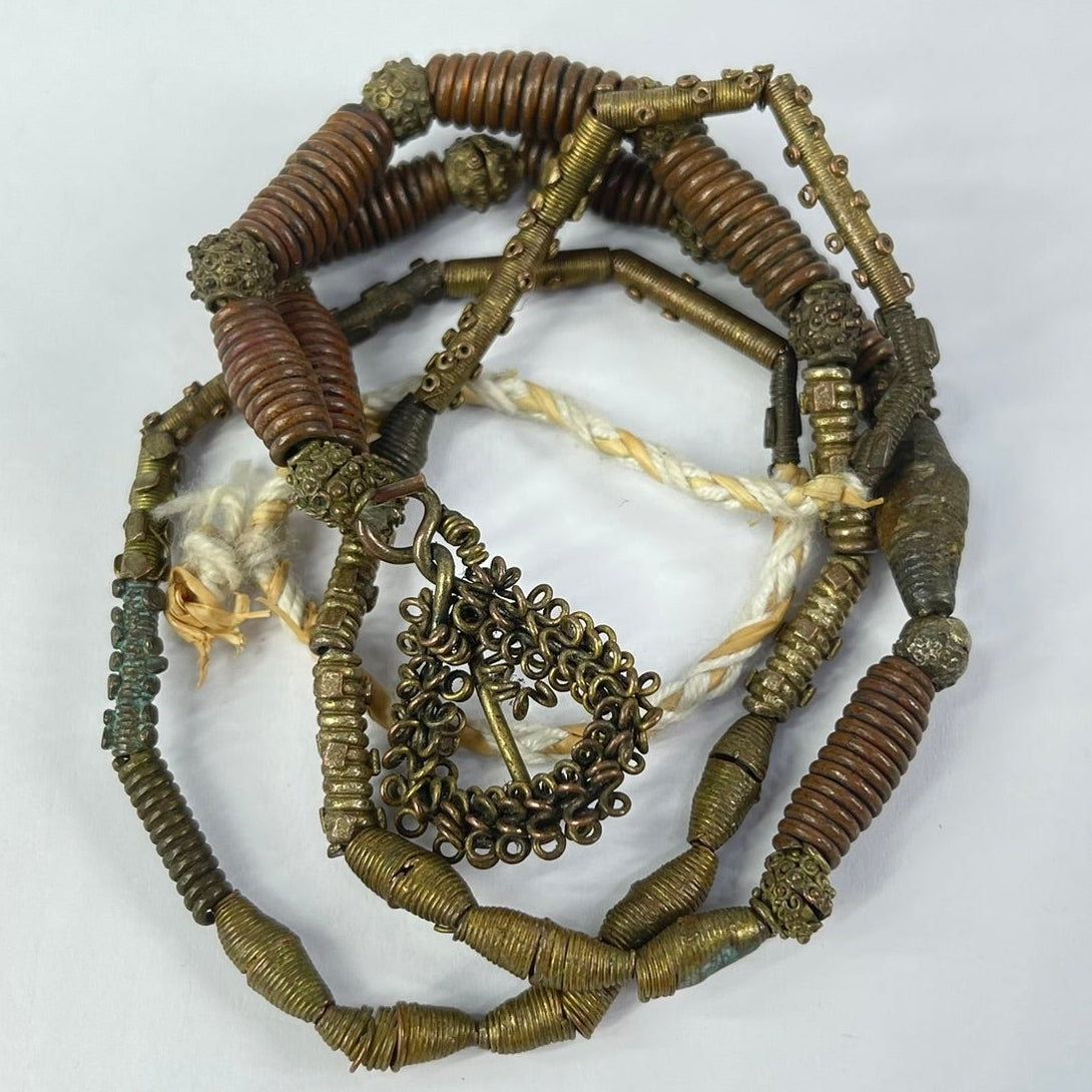Handmade Yoruba gilded brass beads represent a centuries-old tradition of African jewelry crafted by the Yoruba people, an ethnic group from Nigeria known for their rich artistic heritage. These beads, made from brass or bronze, showcase intricate designs reflecting Yoruba cultural motifs and geometric shapes. Worn by men and women, Yoruba brass beads play a vital role in traditional attire, often adorning elaborate necklaces and bracelets. Beyond their aesthetic appeal, these beads hold cultural significance, utilized in rituals, and ceremonies, and as indicators of social status or spiritual protection. The tradition of metalworking in Africa spans thousands of years, encompassing various metals like gold, silver, and brass, each carrying distinct cultural meanings. Today, Yoruba brass beads continue to be produced and worn, not only as a representation of Yoruba culture but also as a global symbol of African-inspired fashion. The broader African metalworking tradition persists, evident in the diverse and intricate beadwork crafted across the continent.