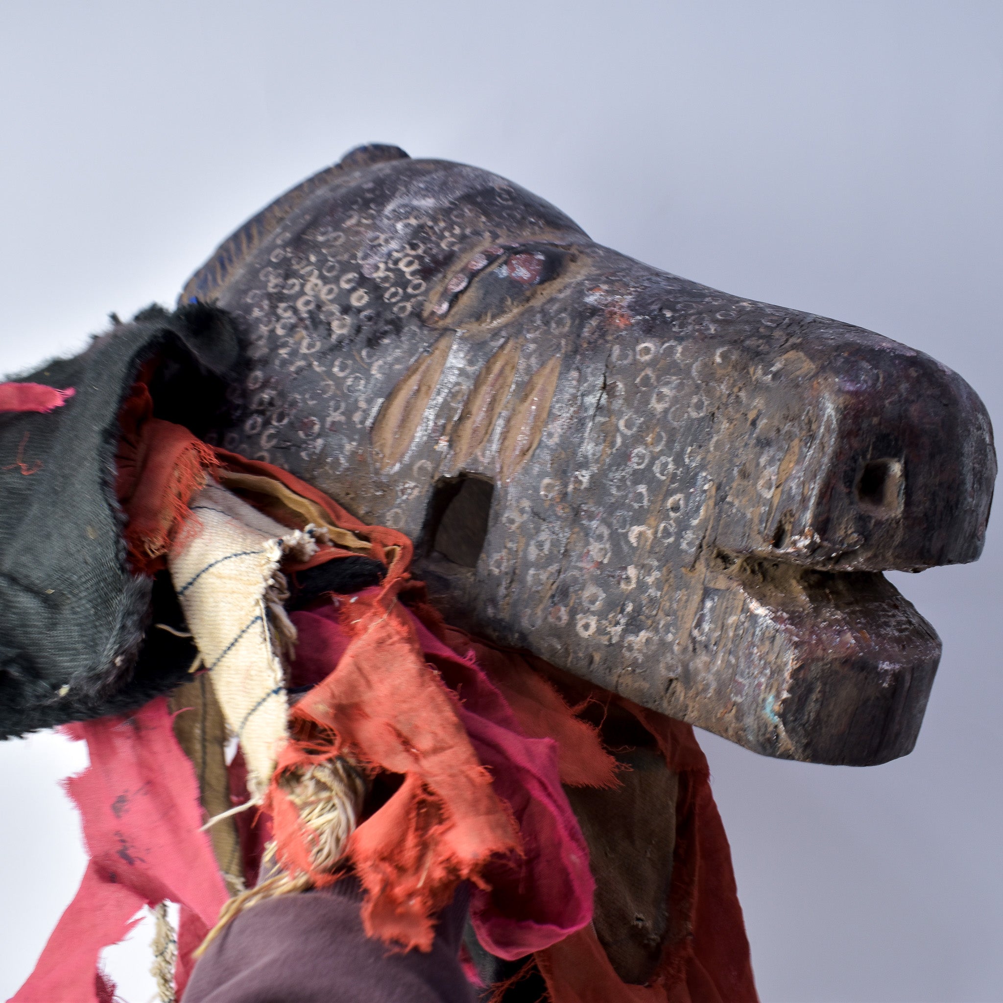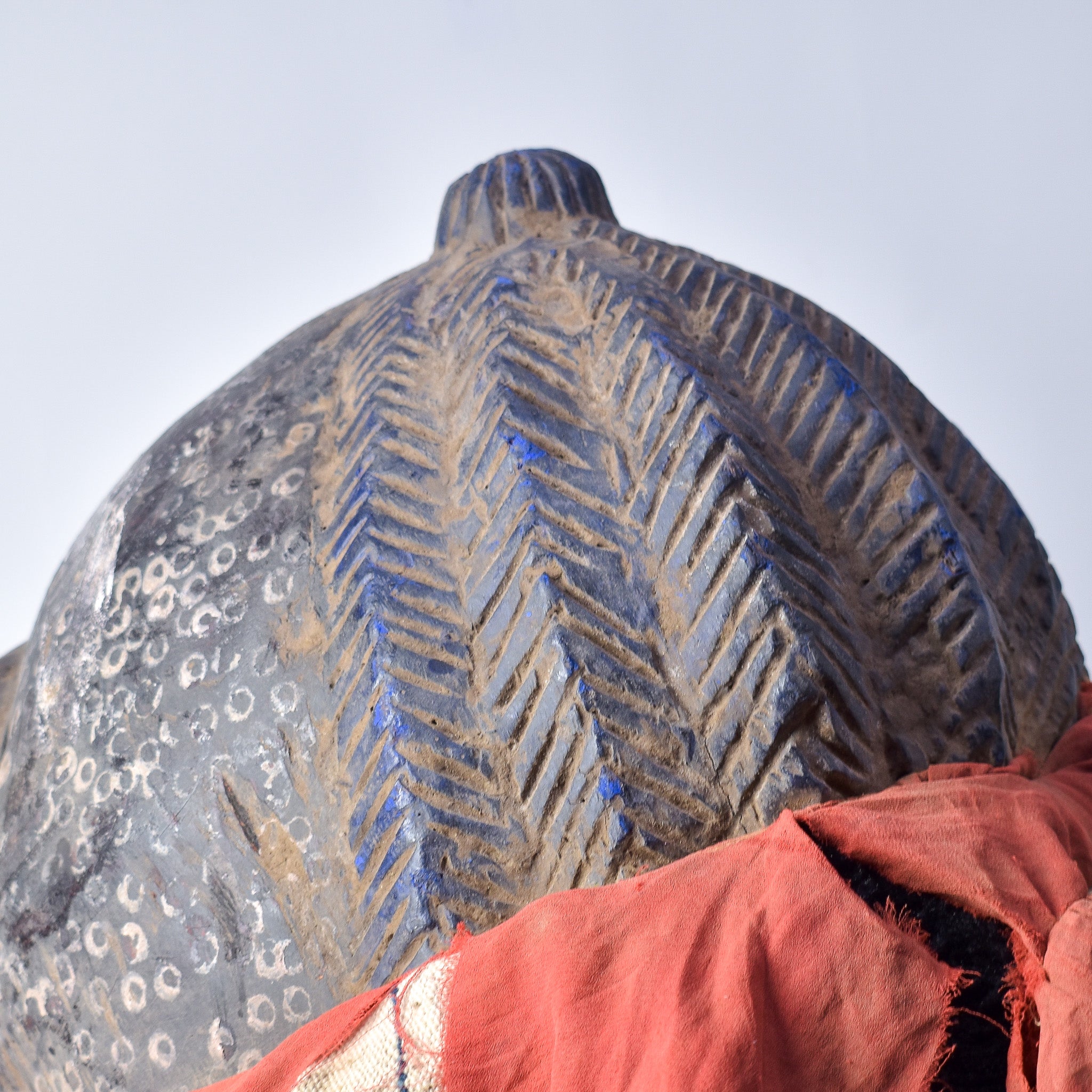 The Yoruba Egungun Mask with fabric from Nigeria is made up of several layers of luxurious and esteemed fabrics, symbolizing the prosperity and social standing of a family and the influence of their ancestors. The garment is then decorated with additional layers of cloth. As the wearer dances, the flaps are swept up, creating a "wind of good fortune." The intricacy of the costume design is intricately intertwined with the choreography of the performance. These fabrics are a mixture of traditional and contemporary fabrics such as damask, velvet, silk, Indian madras, and printed cotton. The performances of Egungun include intricate body movements and dance steps, providing a captivating display of the spirit in motion.