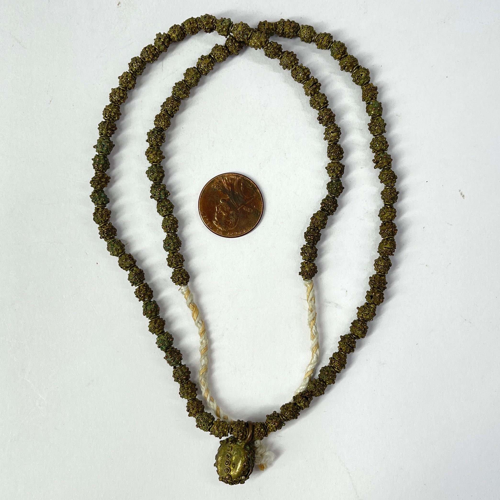 Handmade Yoruba gilded brass beads represent a centuries-old tradition of African jewelry crafted by the Yoruba people, an ethnic group from Nigeria known for their rich artistic heritage. These beads, made from brass or bronze, showcase intricate designs reflecting Yoruba cultural motifs and geometric shapes. Worn by men and women, Yoruba brass beads play a vital role in traditional attire, often adorning elaborate necklaces and bracelets. Beyond their aesthetic appeal, these beads hold cultural significance, utilized in rituals, and ceremonies, and as indicators of social status or spiritual protection. The tradition of metalworking in Africa spans thousands of years, encompassing various metals like gold, silver, and brass, each carrying distinct cultural meanings. Today, Yoruba brass beads continue to be produced and worn, not only as a representation of Yoruba culture but also as a global symbol of African-inspired fashion. The broader African metalworking tradition persists, evident in the diverse and intricate beadwork crafted across the continent.