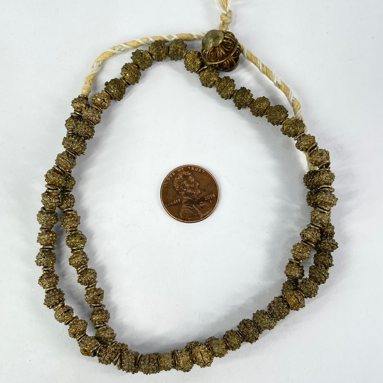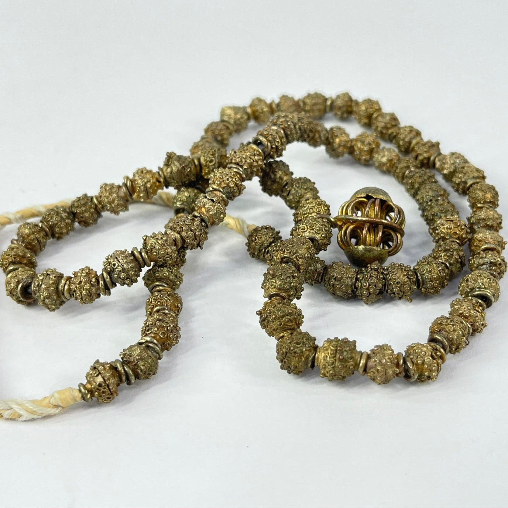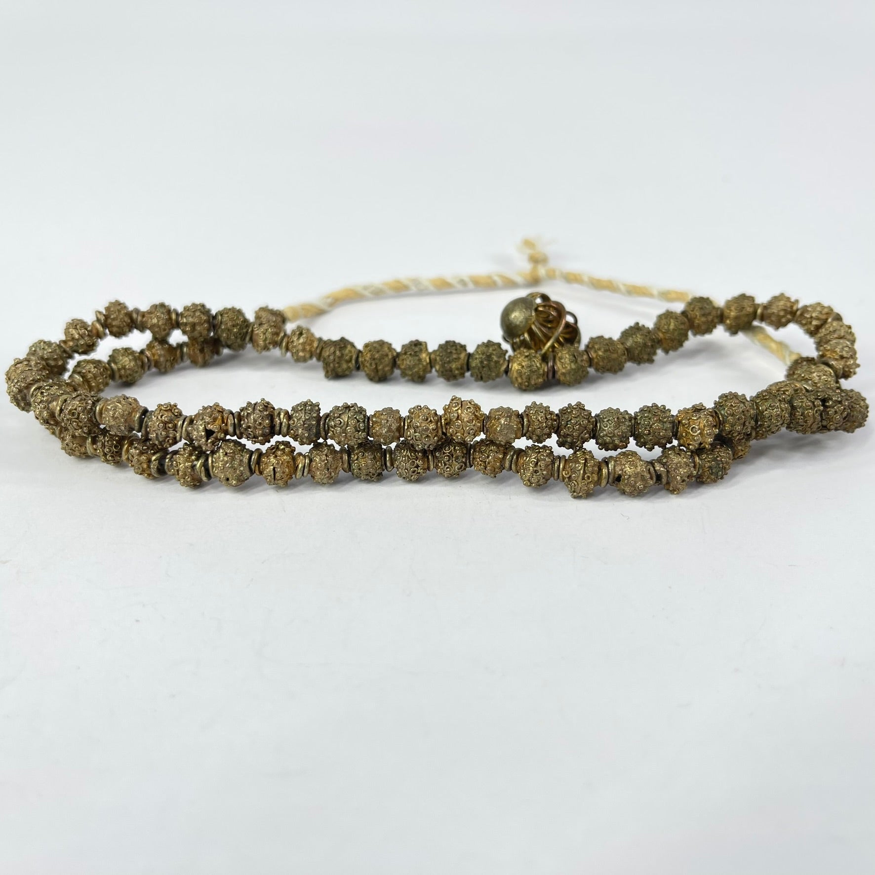 Handmade Yoruba gilded brass beads represent a centuries-old tradition of African jewelry crafted by the Yoruba people, an ethnic group from Nigeria known for their rich artistic heritage. These beads, made from brass or bronze, showcase intricate designs reflecting Yoruba cultural motifs and geometric shapes. Worn by men and women, Yoruba brass beads play a vital role in traditional attire, often adorning elaborate necklaces and bracelets. Beyond their aesthetic appeal, these beads hold cultural significance, utilized in rituals, and ceremonies, and as indicators of social status or spiritual protection. The tradition of metalworking in Africa spans thousands of years, encompassing various metals like gold, silver, and brass, each carrying distinct cultural meanings. Today, Yoruba brass beads continue to be produced and worn, not only as a representation of Yoruba culture but also as a global symbol of African-inspired fashion. The broader African metalworking tradition persists, evident in the diverse and intricate beadwork crafted across the continent.