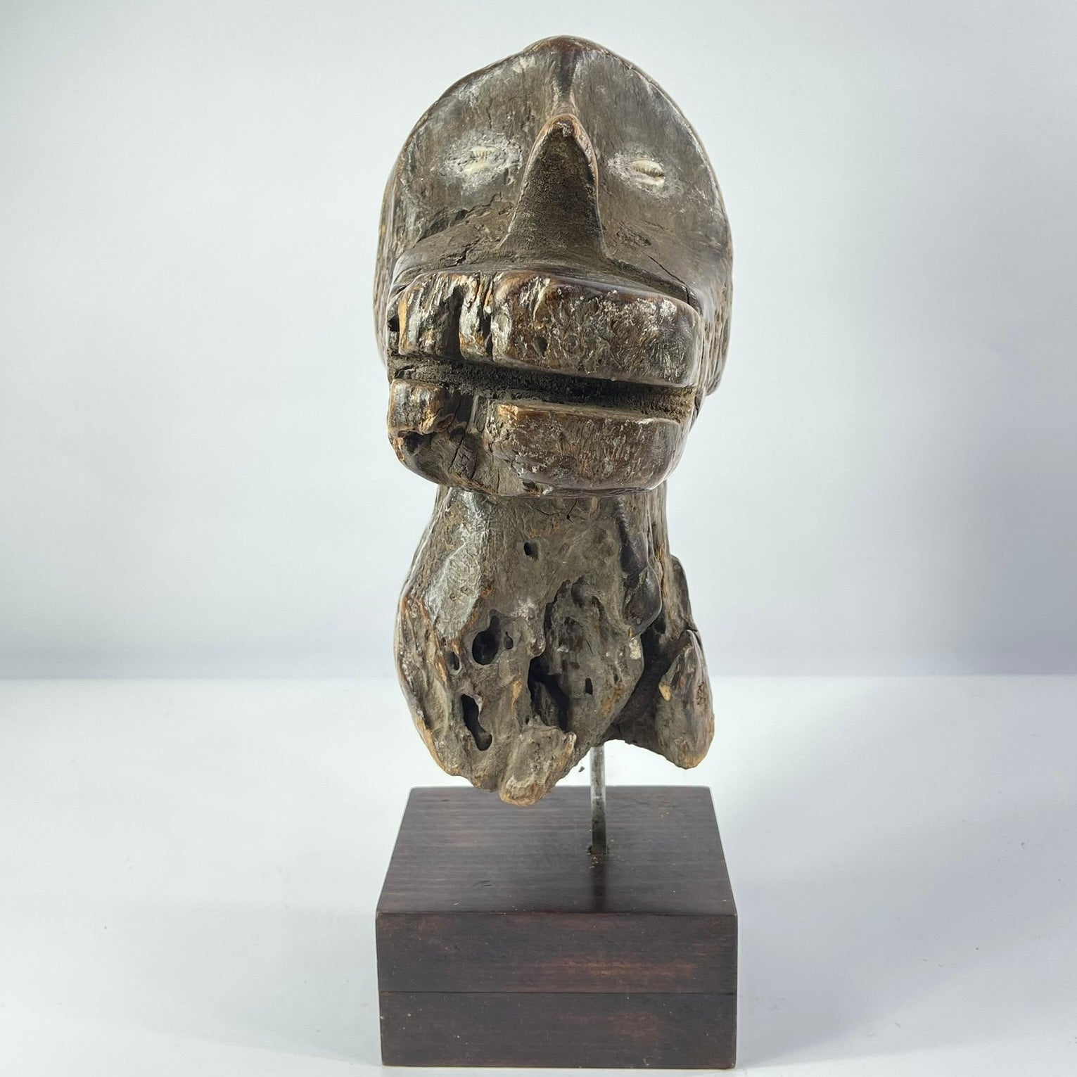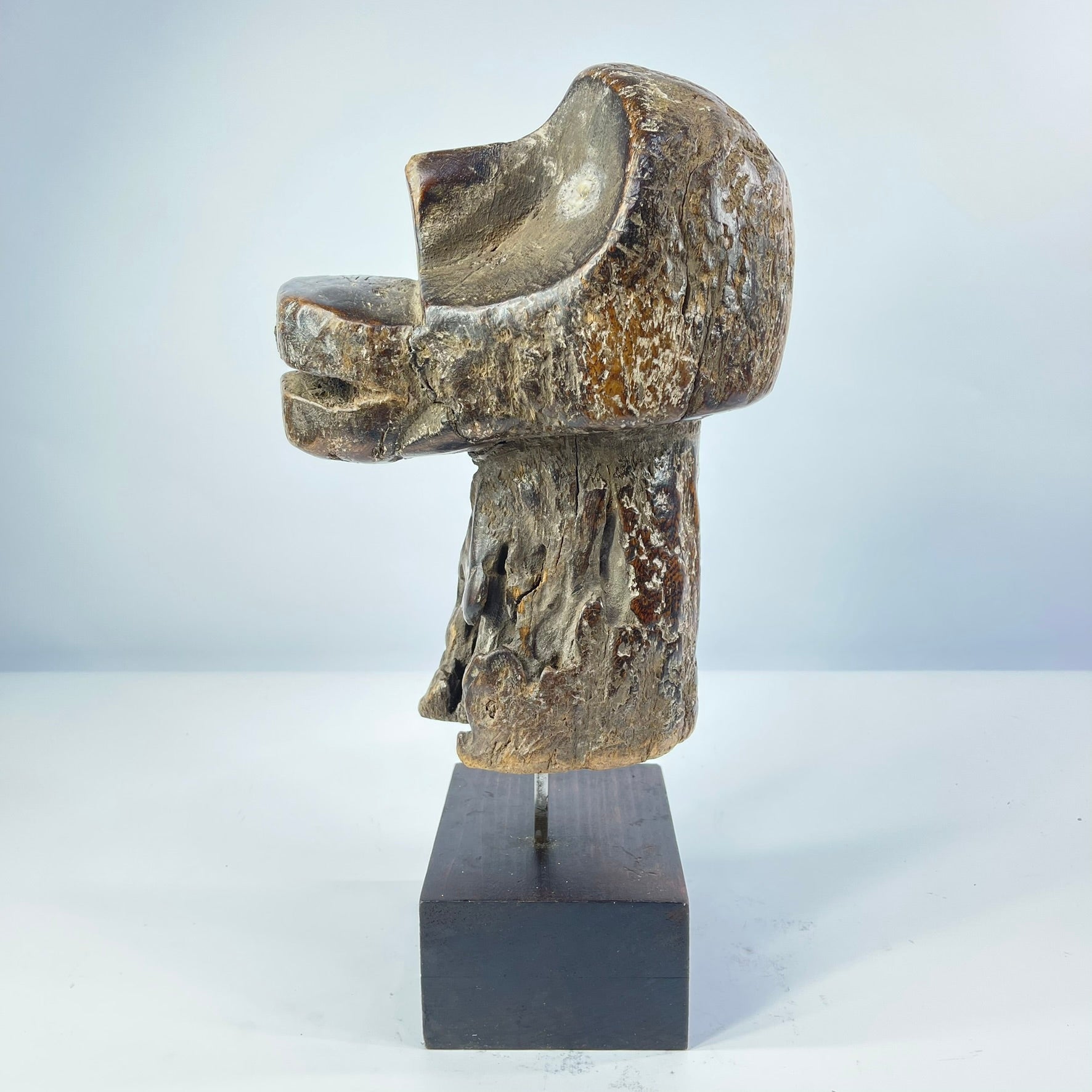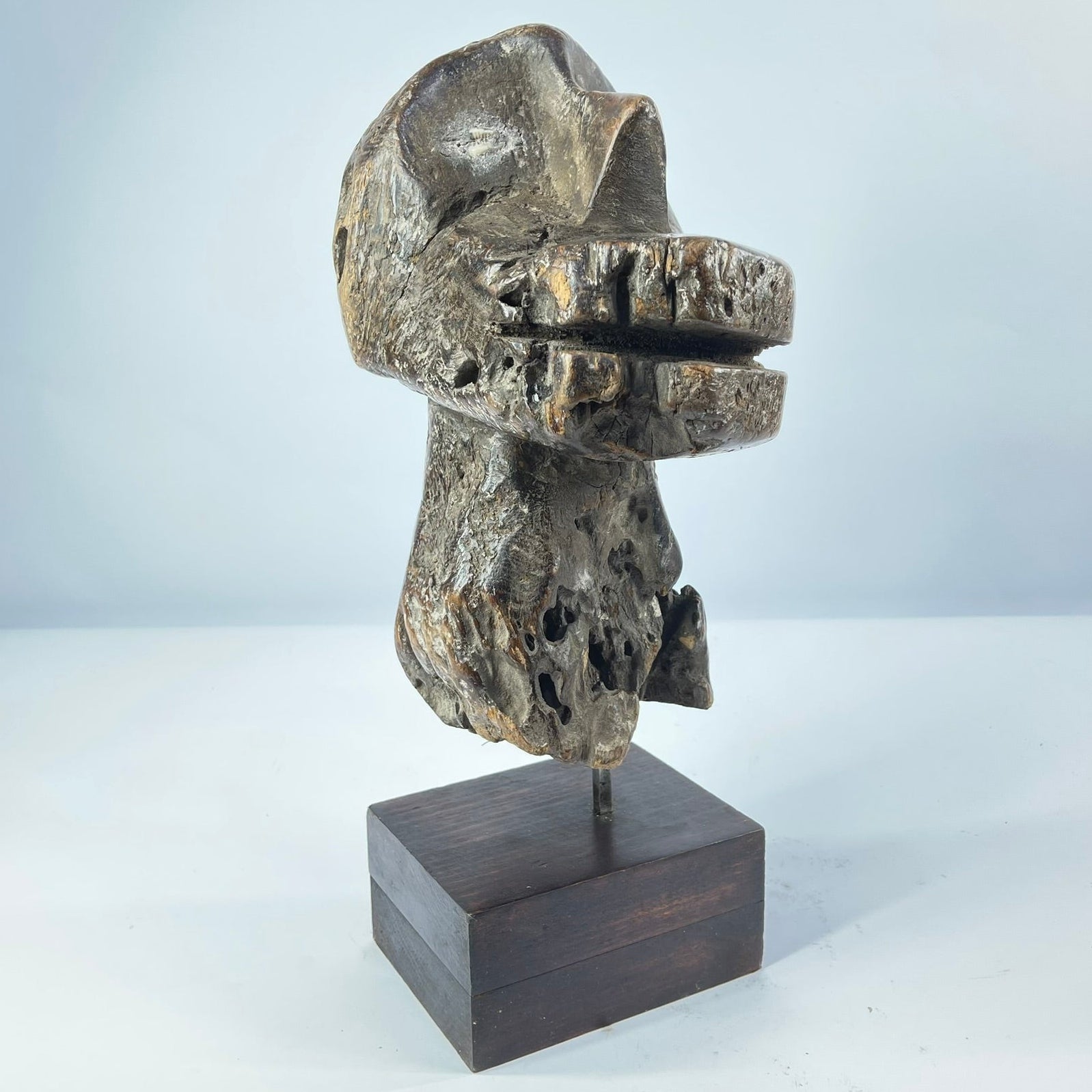 Carved from a single piece of wood, this sculptural head displays a powerful, stylized form with pronounced features and a richly textured surface. The deep patina, surface wear, and natural cavities speak to age, handling, and long-term use or ritual significance. Such works often carried personal, symbolic, or spiritual meaning beyond their visual presence, serving as expressions of identity, status, or ancestral connection.