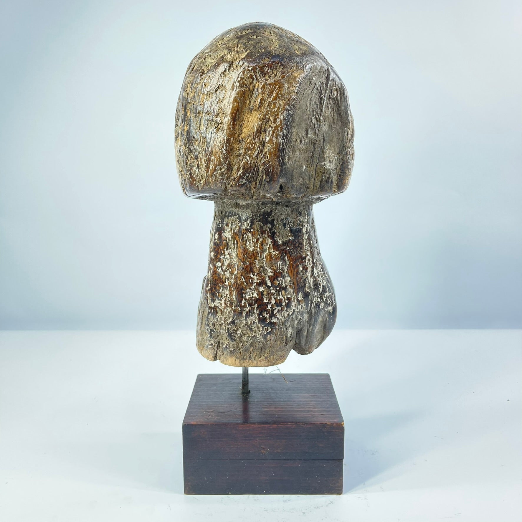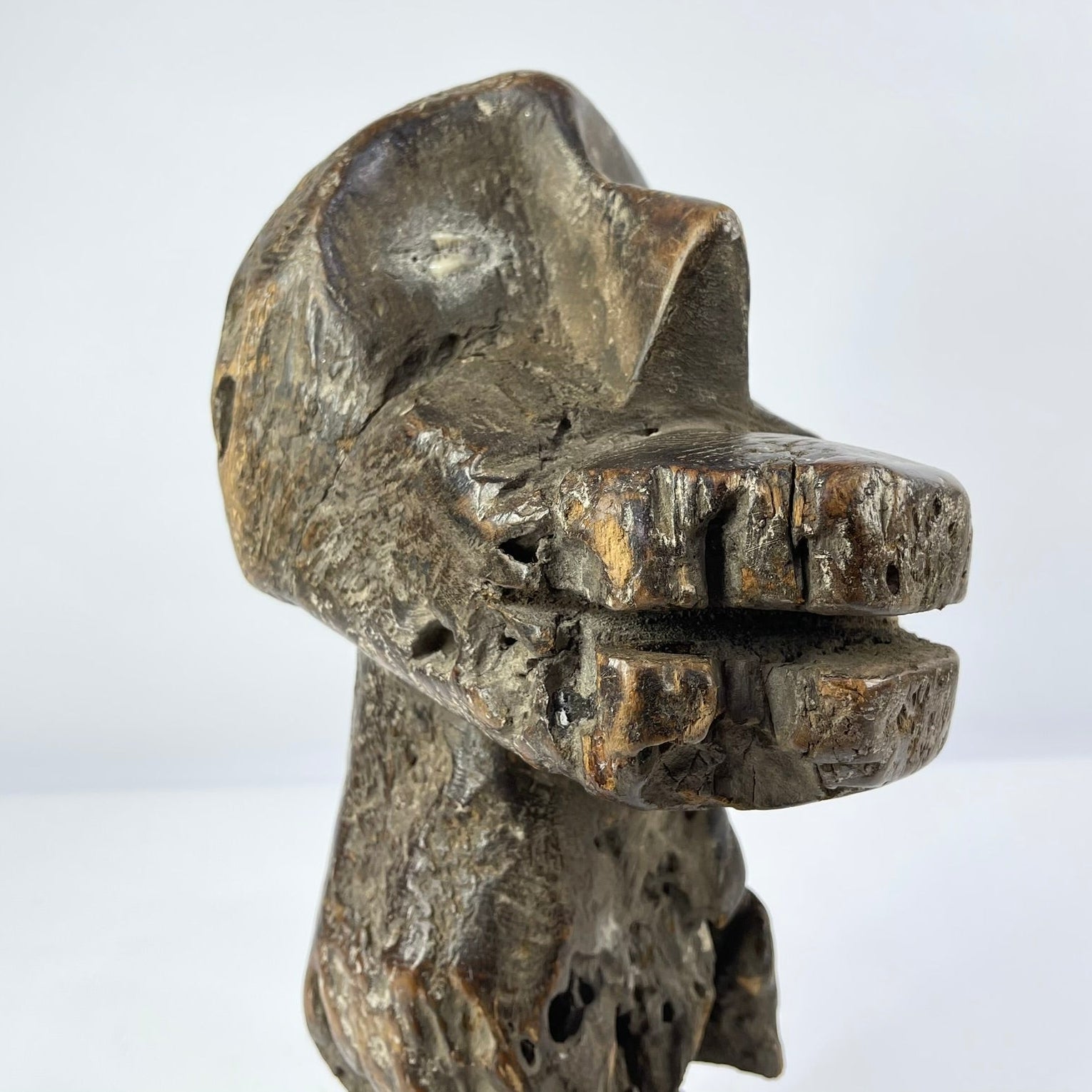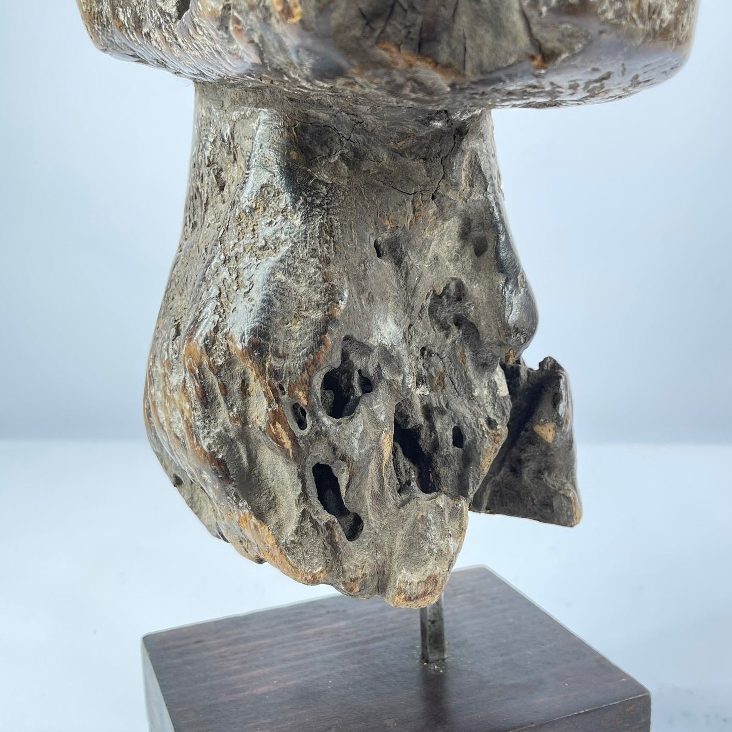 Carved from a single piece of wood, this sculptural head displays a powerful, stylized form with pronounced features and a richly textured surface. The deep patina, surface wear, and natural cavities speak to age, handling, and long-term use or ritual significance. Such works often carried personal, symbolic, or spiritual meaning beyond their visual presence, serving as expressions of identity, status, or ancestral connection.