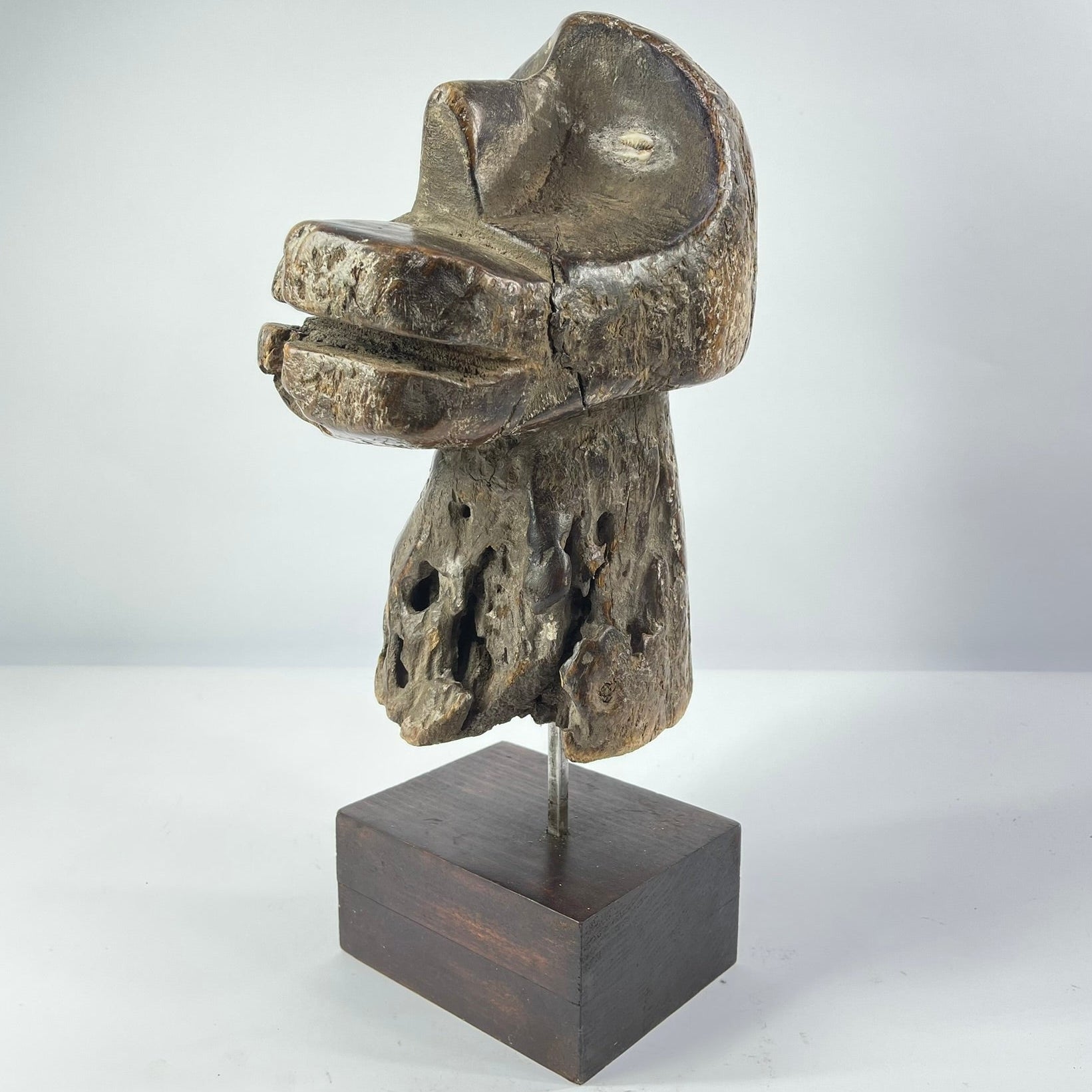 Mounted on a custom wooden base, the piece is presented as a standalone sculptural object, suitable for display in a private collection or gallery setting. Its bold profile and organic surface make it a compelling example of Central African sculptural tradition.